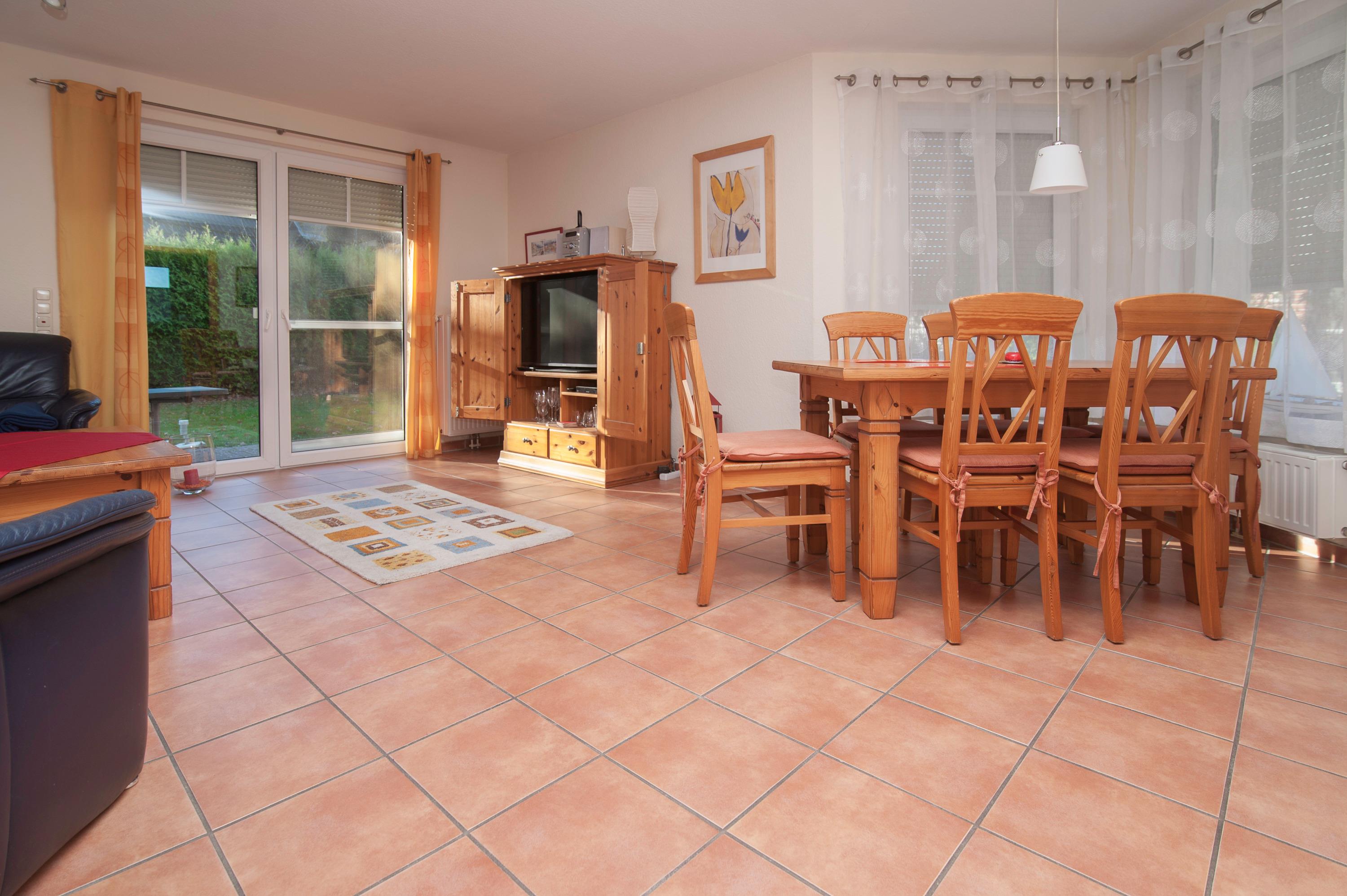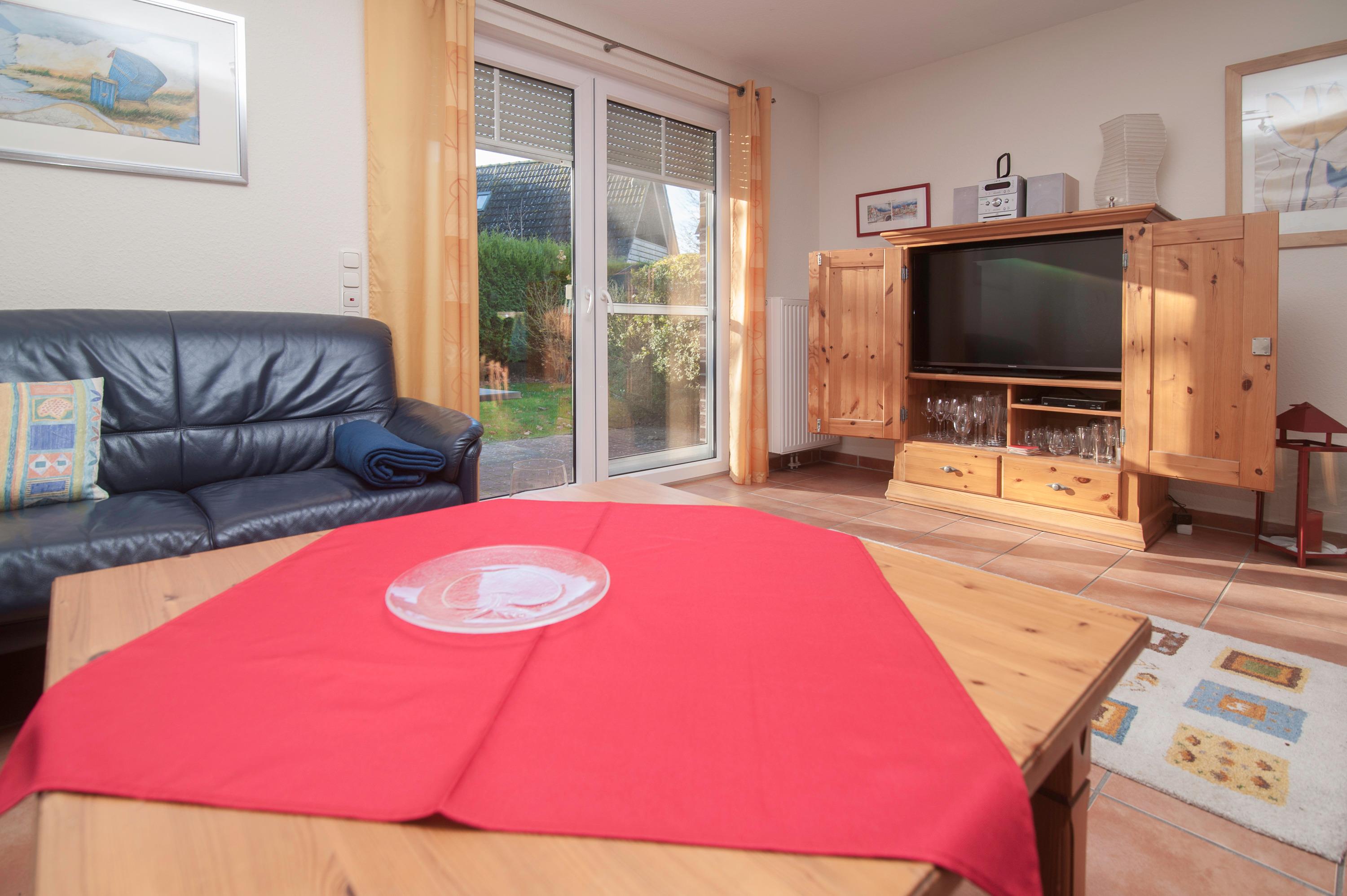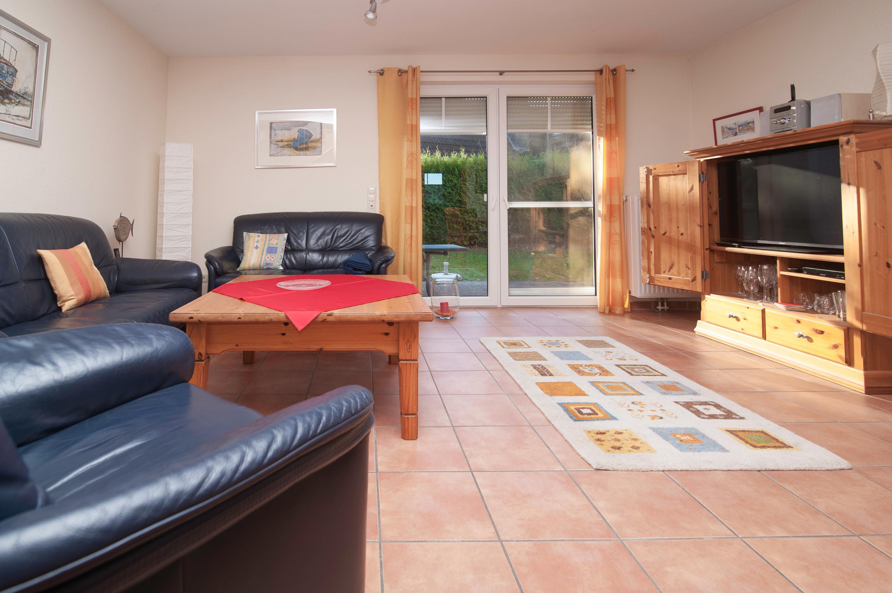 Schöner Wohnraum mit einem 43"Panasonic LED Smart-TV, Sitzgruppe, Stereoanlage, Essplatz für 4 Personen. WLAN-Gastzugang (Glasfaseranschluß) und Telefon vorhanden.