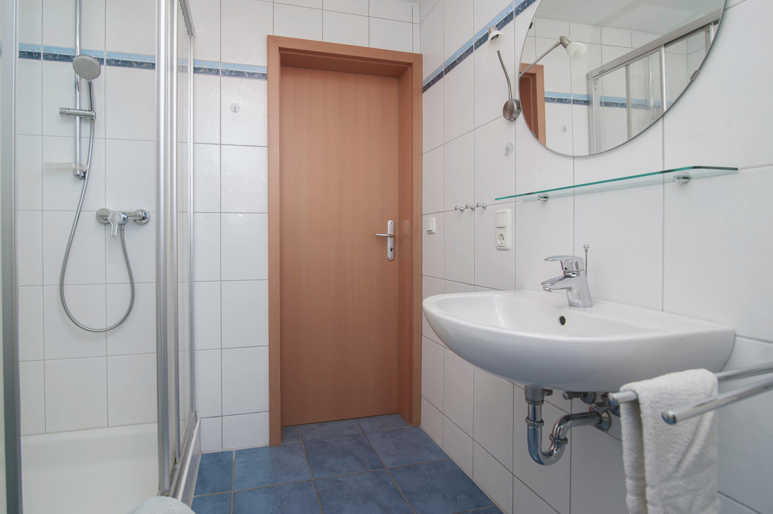 Badezimmer mit Dusche, Waschbecken und WC, Waschmaschine (4,5kg) und Föhn, sowie ein Schlafzimmer mit einem Doppelbett im Obergeschoß (2 x 100 x 200 cm) und ein Schlafzimmer mit zwei Einzelbetten (100 x 200 cm), alle Betten im Haus verfügen über verstellbare Lattenroste.