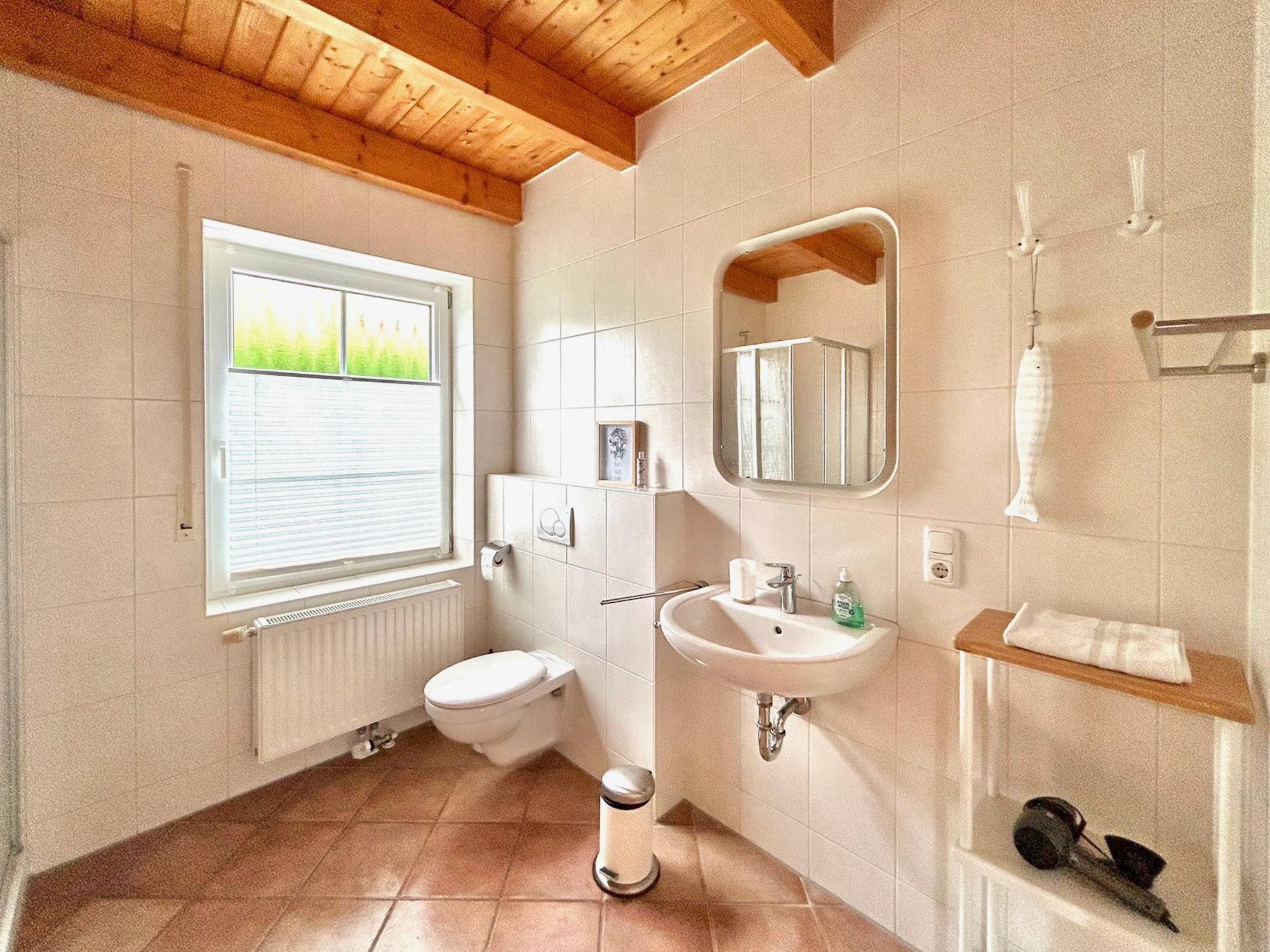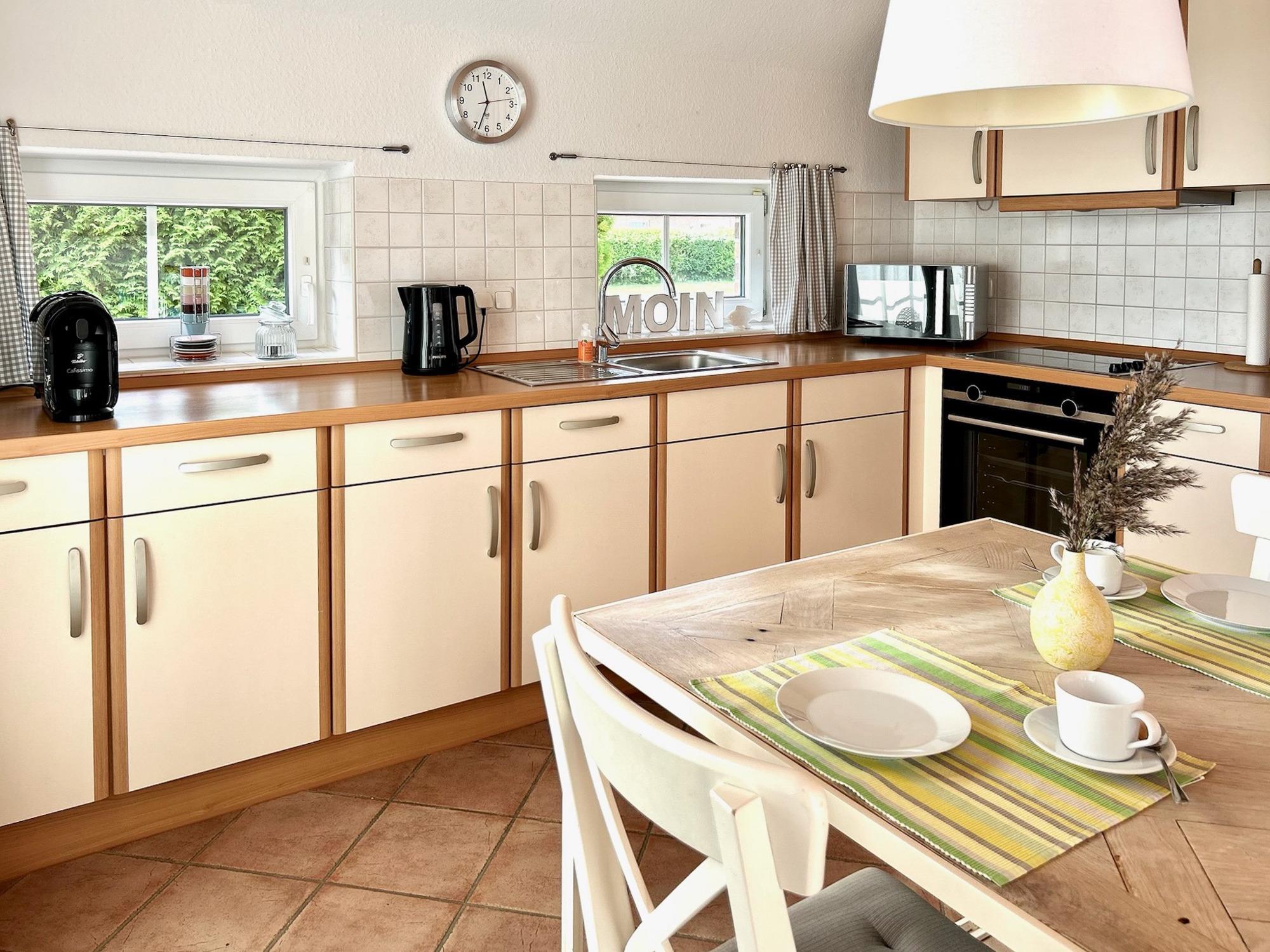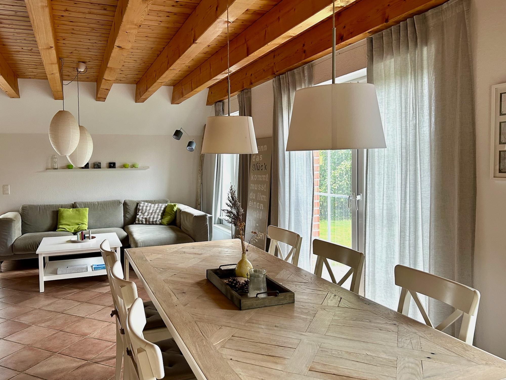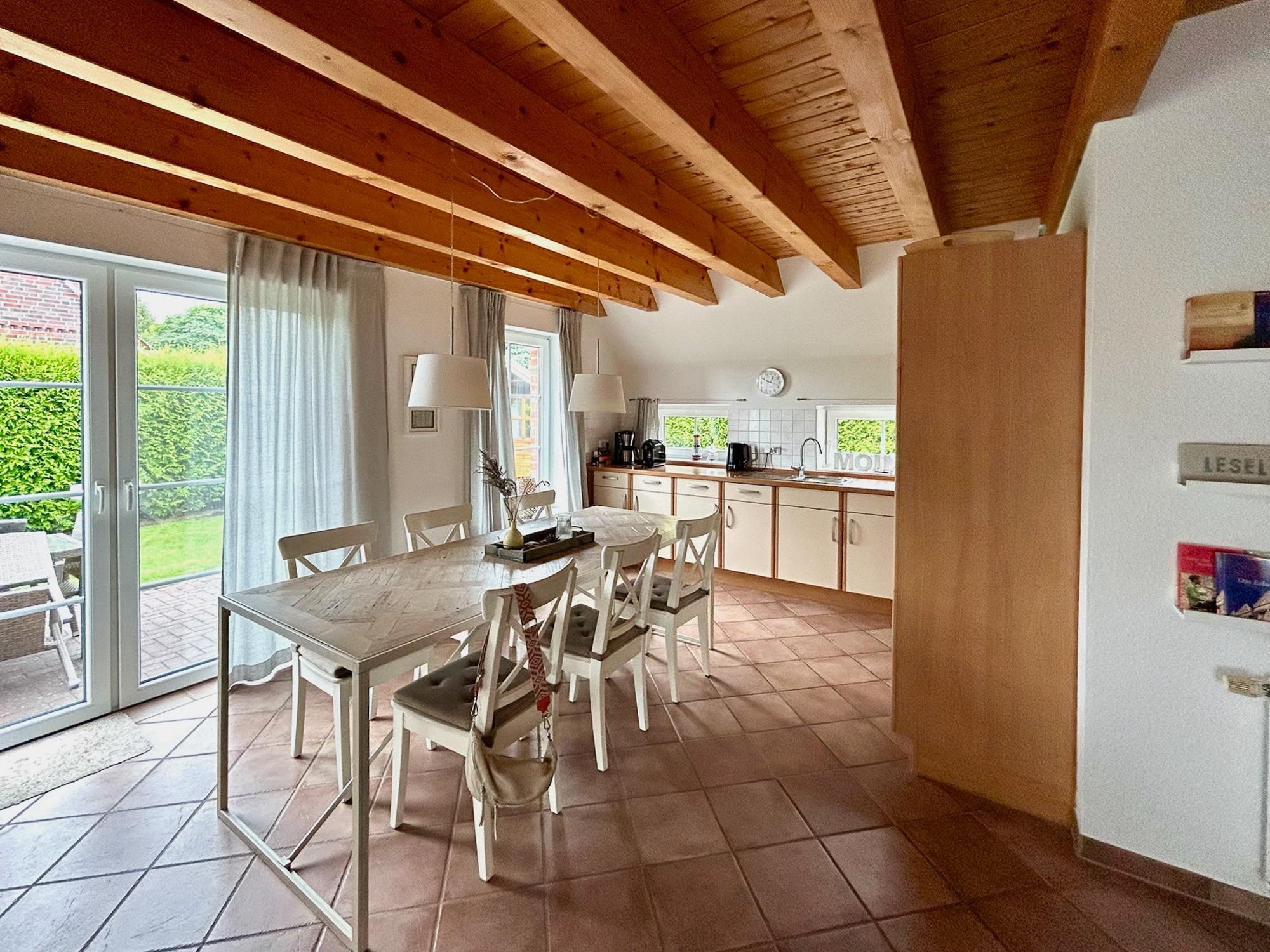 3 Schlafräume: 1 Schlafzimmer im EG mit Doppelbett (2 x 90 x 200cm), 1 Schlafzimmer im OG mit Doppelbett (90 x 200cm) und 1 Schlafzimmer mit 2 Einzelbetten (90 x 200cm) eingerichtet mit Kiefer-Naturholzmöbeln, Allergiker-Betten, alle mit verstellbarem Lattenrost. Wohnbereich mit Deichblick! Kamin, Rundsitzecke, 43"Sony FullHD LED-TV, Sat-Receiver, CD-Radio, ein DSL WLAN-Gastzugang ist vorhanden, Essbereich für 6 Personen mit großem Tisch und Einbauküche mit Herd und Cerankochfeld, Dunstabzugshaube, Kühlschrank mit Gefrierfach, 45er Geschirrspüler, Filterkaffeemaschine, 2 Badezimmer, jeweils mit Dusche und WC sowie zusätzlicher Fußboden-Erwärmung. Das Bad im EG verfügt über Waschmaschine (8kg) und Trockner (7,5kg). Im Abstellraum finden sie u.a. Bügelbrett, Bügeleisen, Wäscheständer, Kinderreisebett und Kinderhochstuhl.