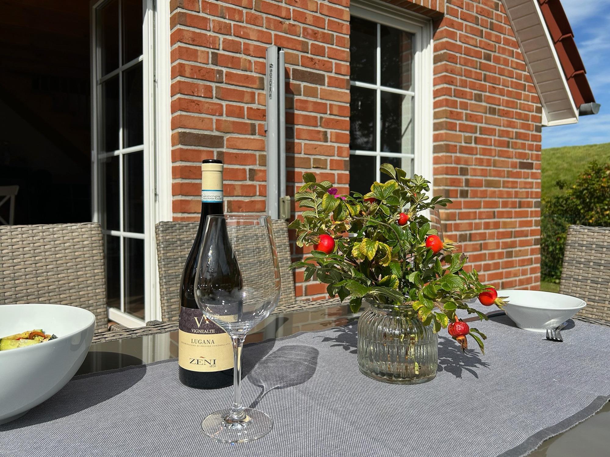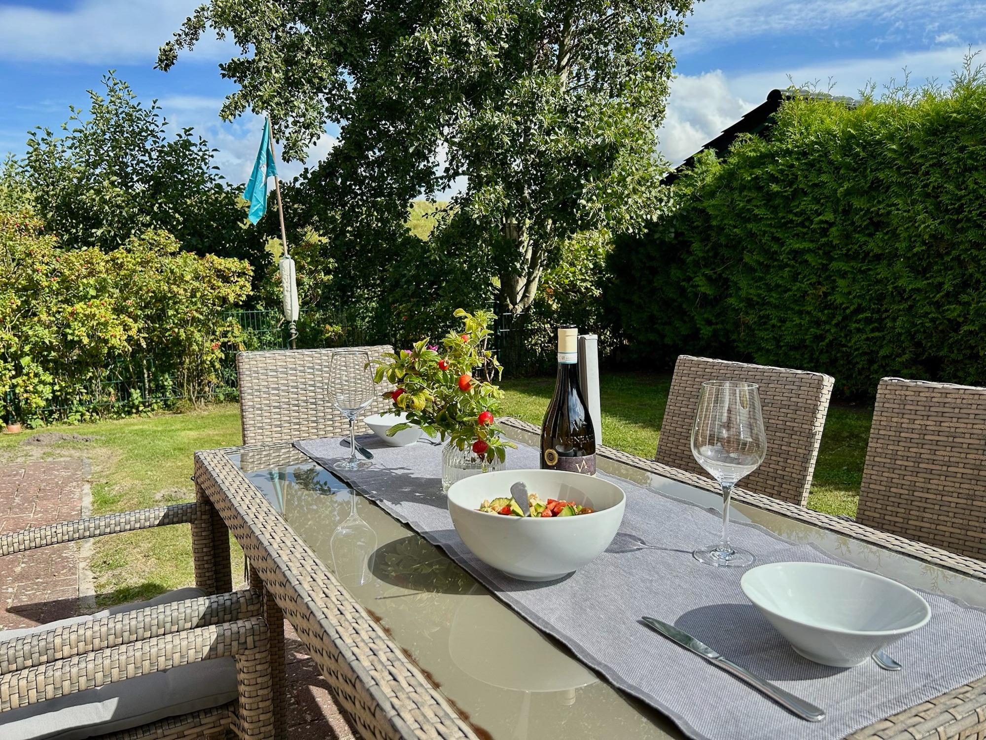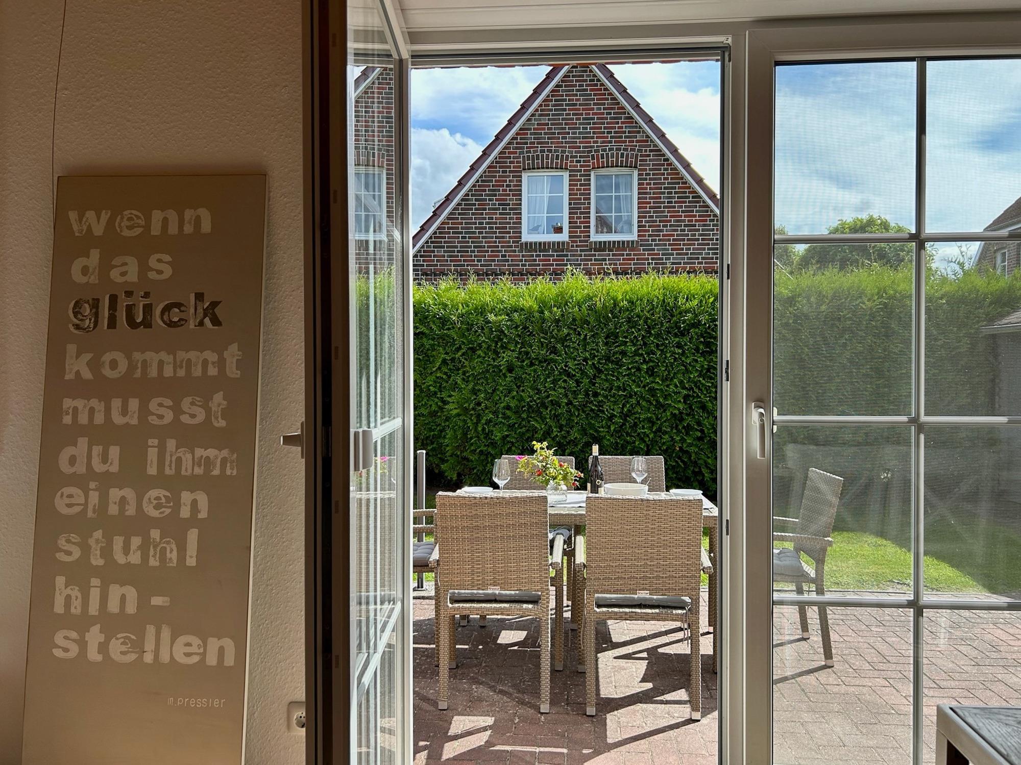 Sonnige Terrasse mit Gartenmöbeln, 2 PKW Stellplätze direkt vor dem Haus.