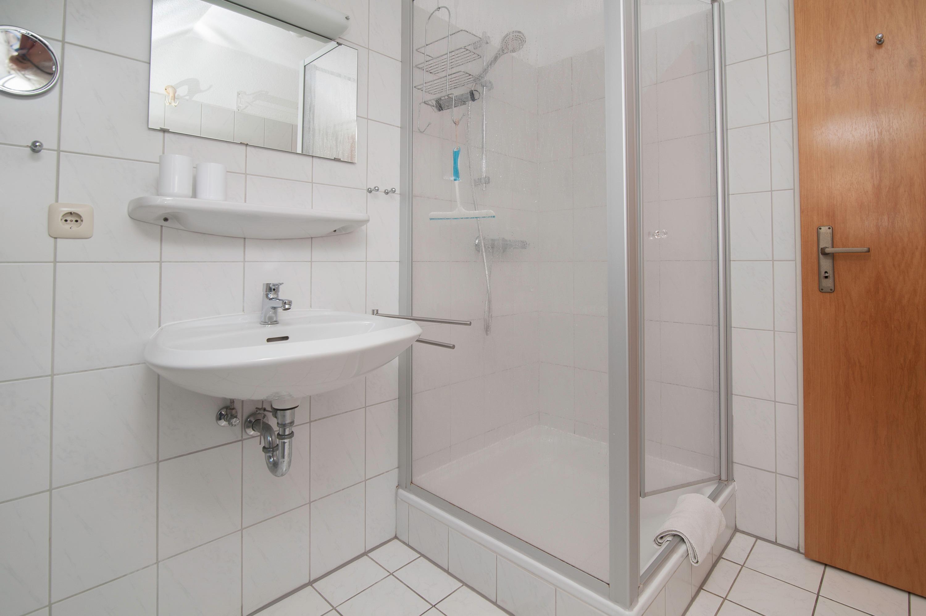 1 Badezimmer mit Dusche, Waschbecken, WC und Föhn.