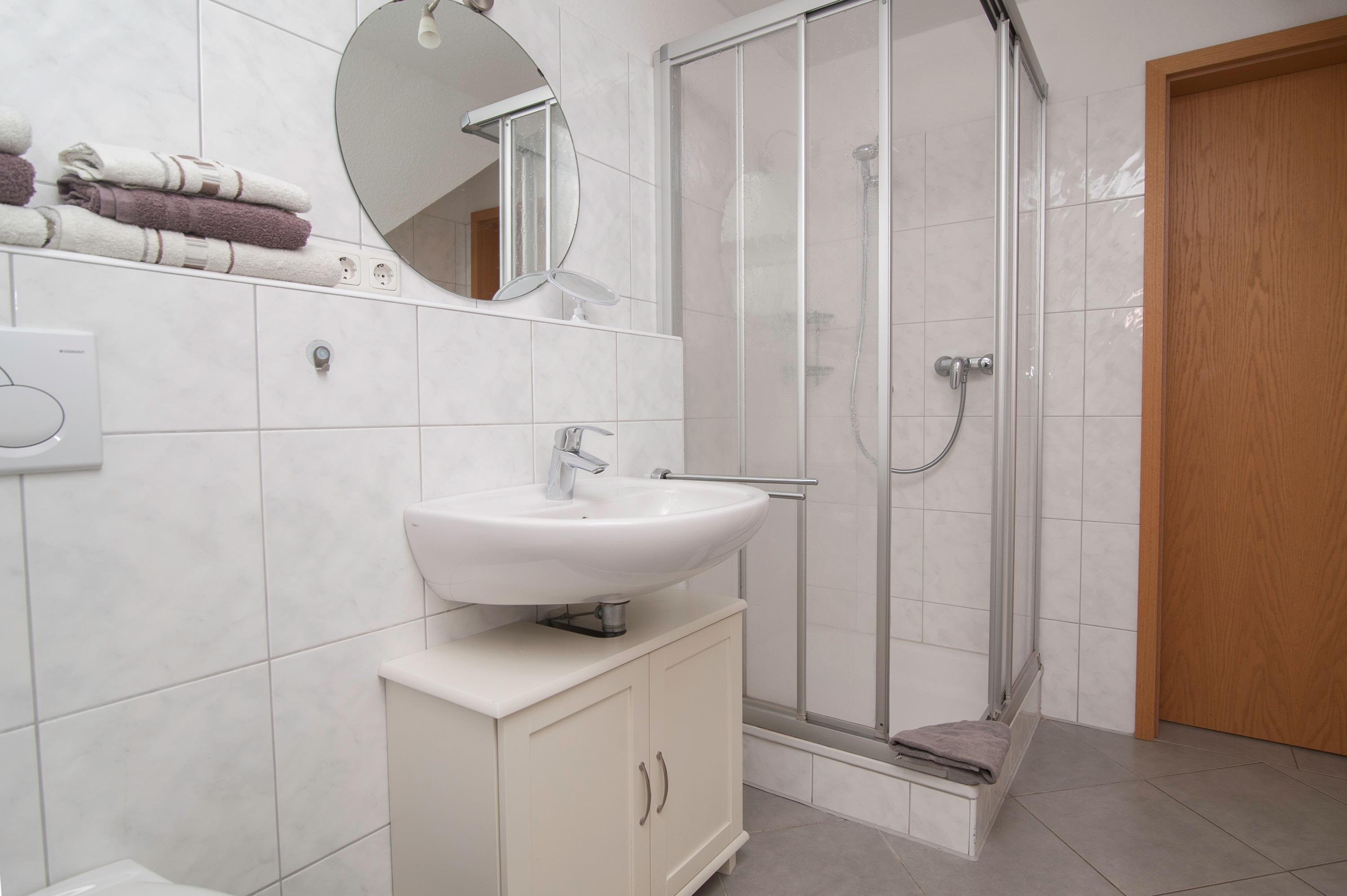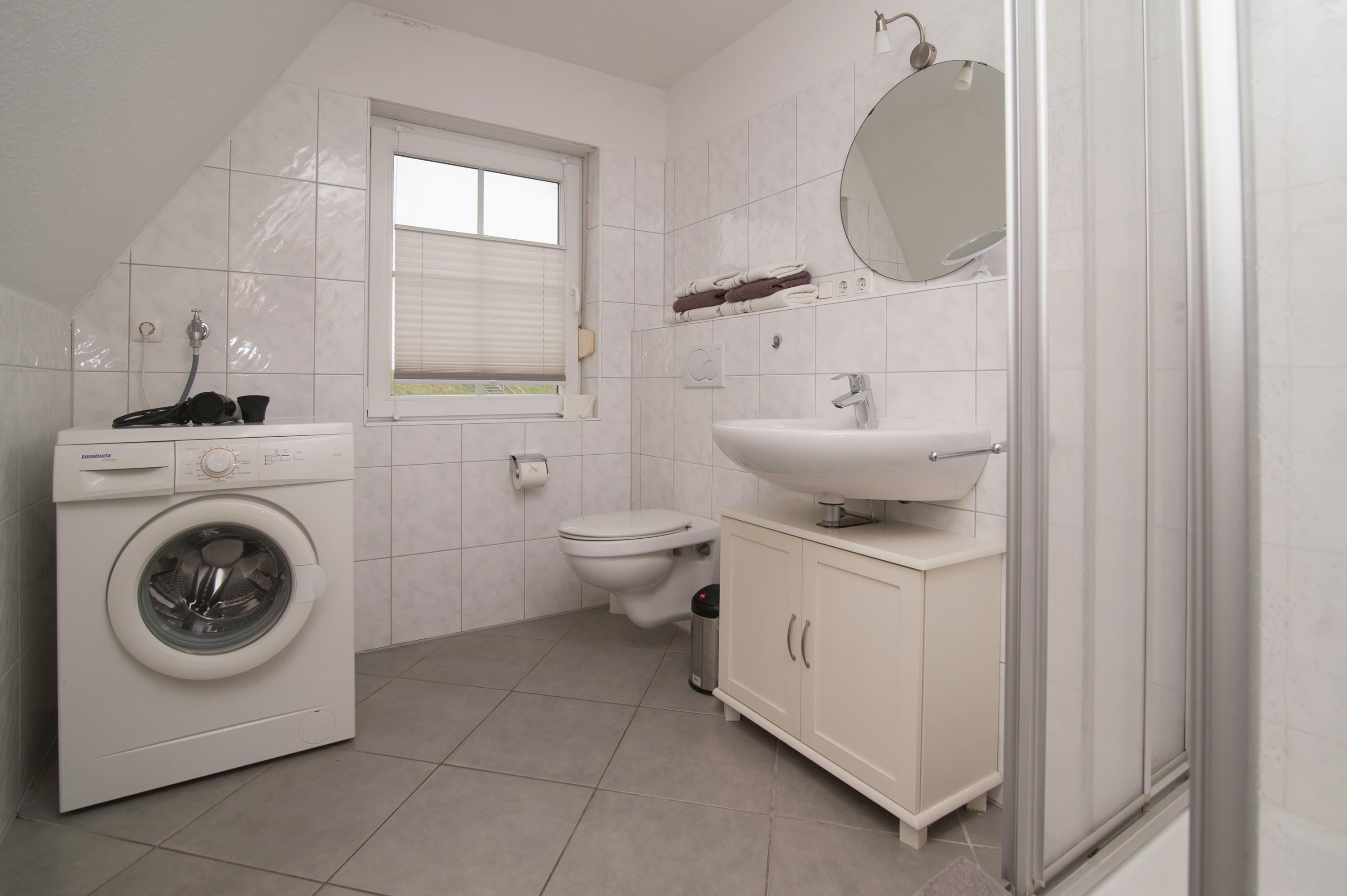Badezimmer mit Dusche, Waschbecken, WC, Waschmaschine (5kg) und Föhn im Obergeschoss, Schlafraum mit einem Doppelbett (2 x 100 x 200 cm) und Kinderreisebett im Obergeschoss, sowie ein weiterer Schlafraum mit zwei Einzelbetten (90 x 200 cm)im Obergeschoss
