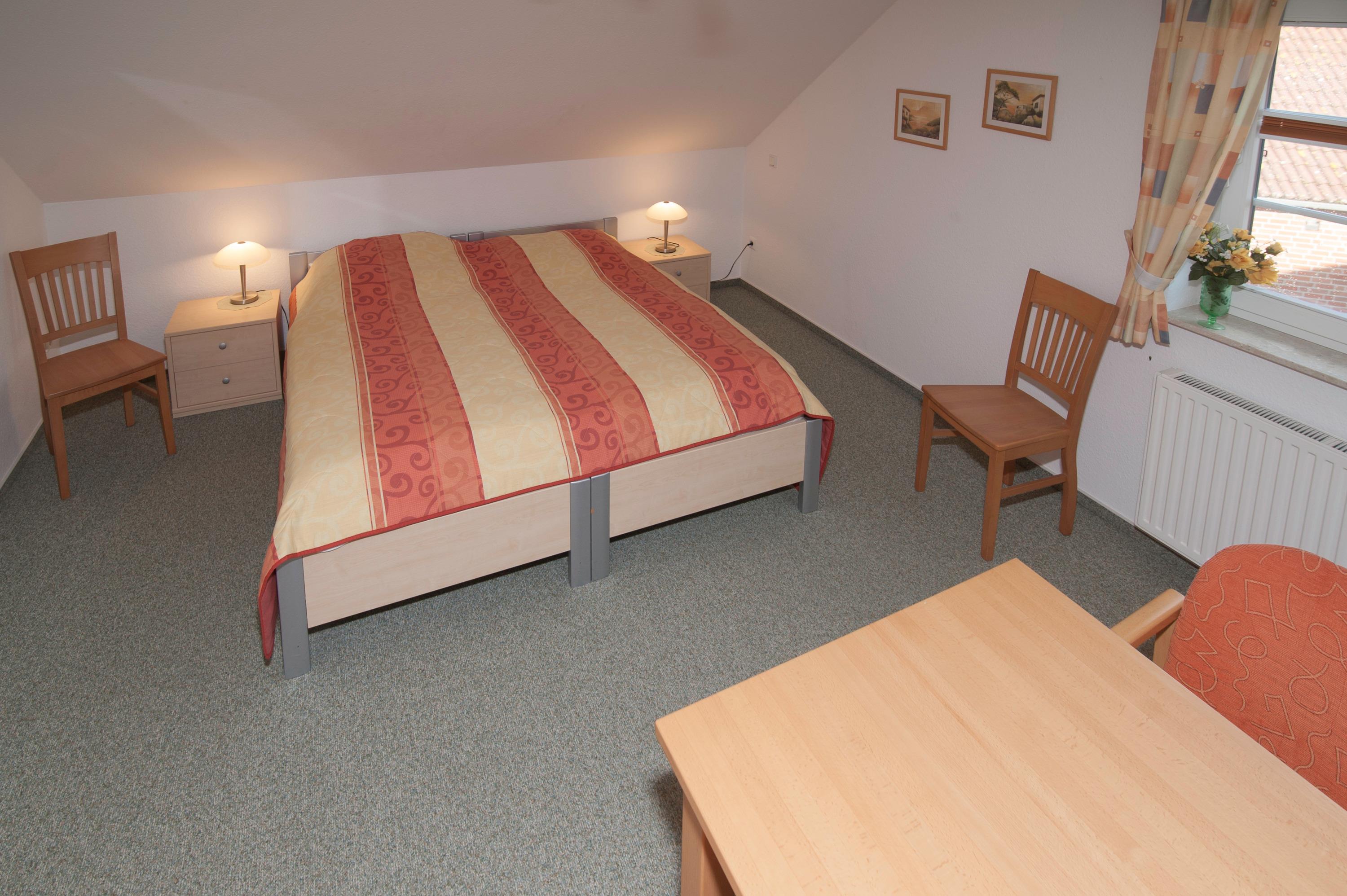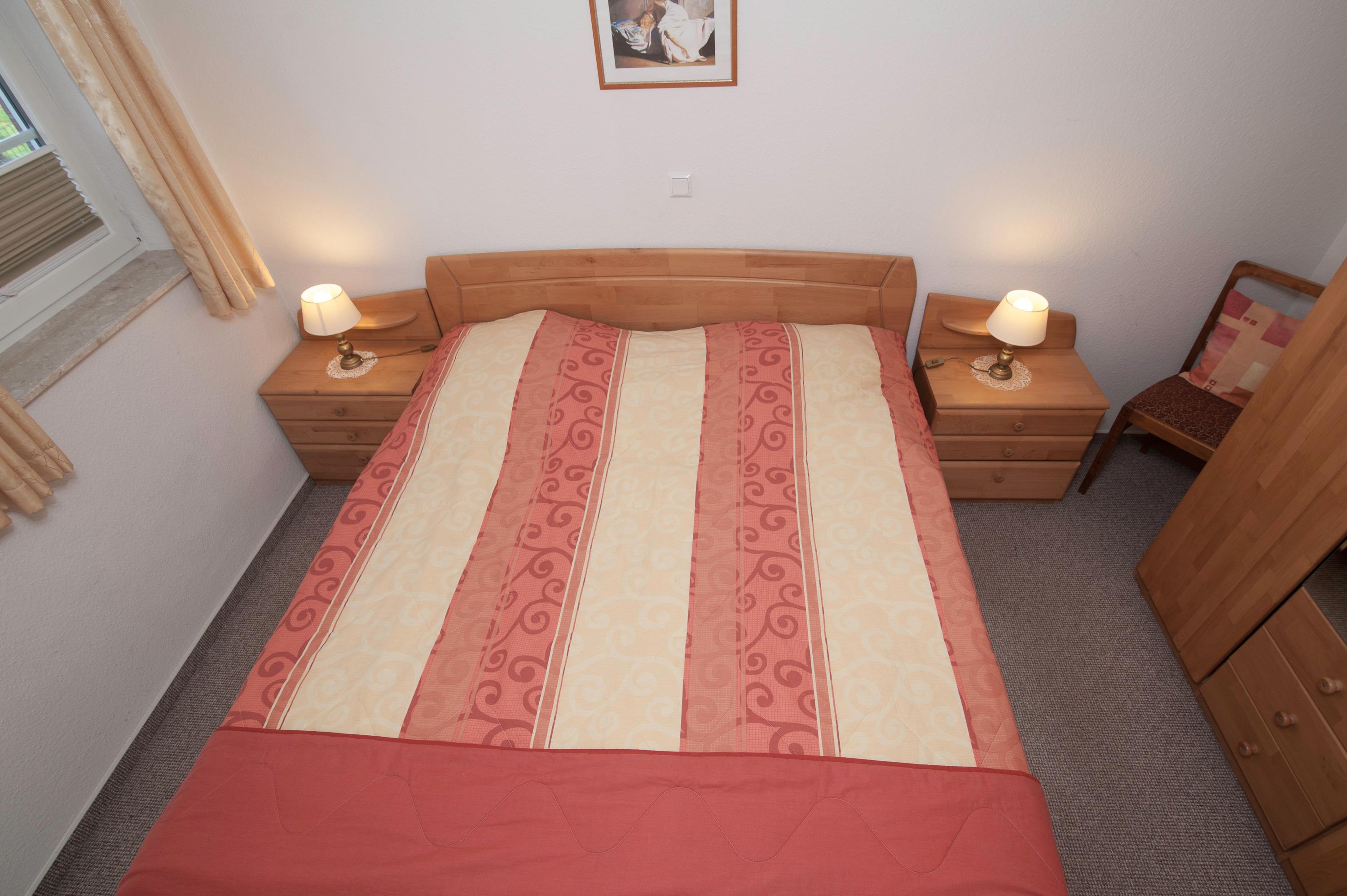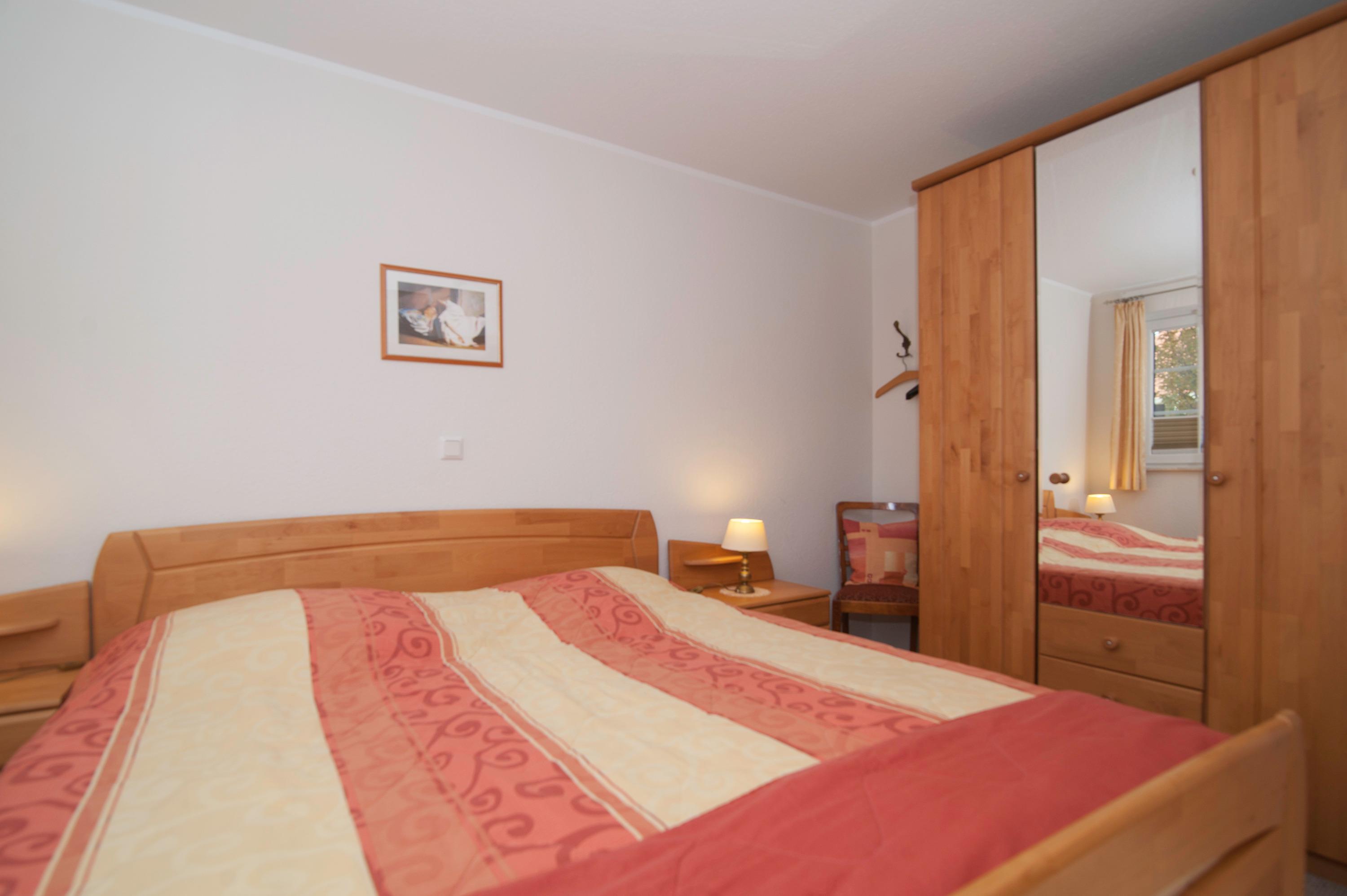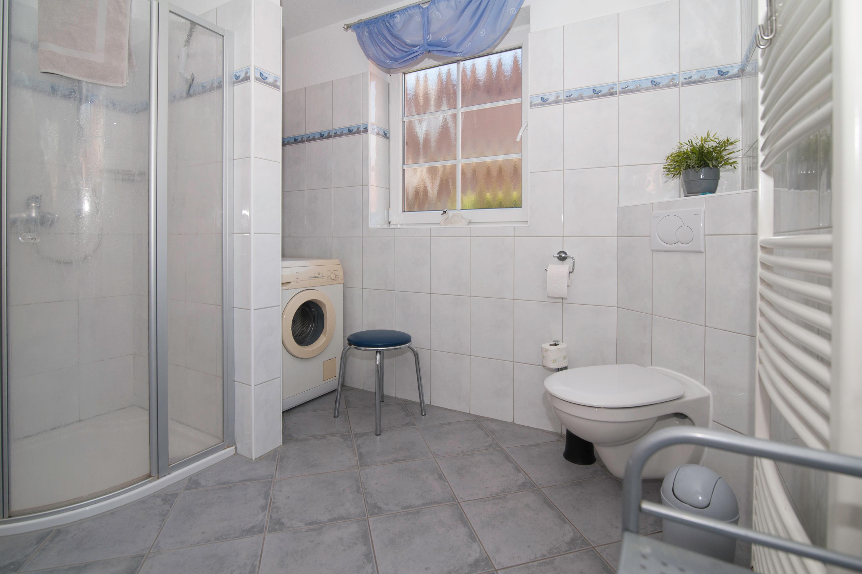 Ein Schlafzimmer mit Teppichboden mit Doppelbett im Erdgeschoß, Verdunkelung durch Plissee und Vorhang, nebenan ein Bad mit Dusche (niedriger Einstieg), Föhn und einer Waschmaschine (5kg).
