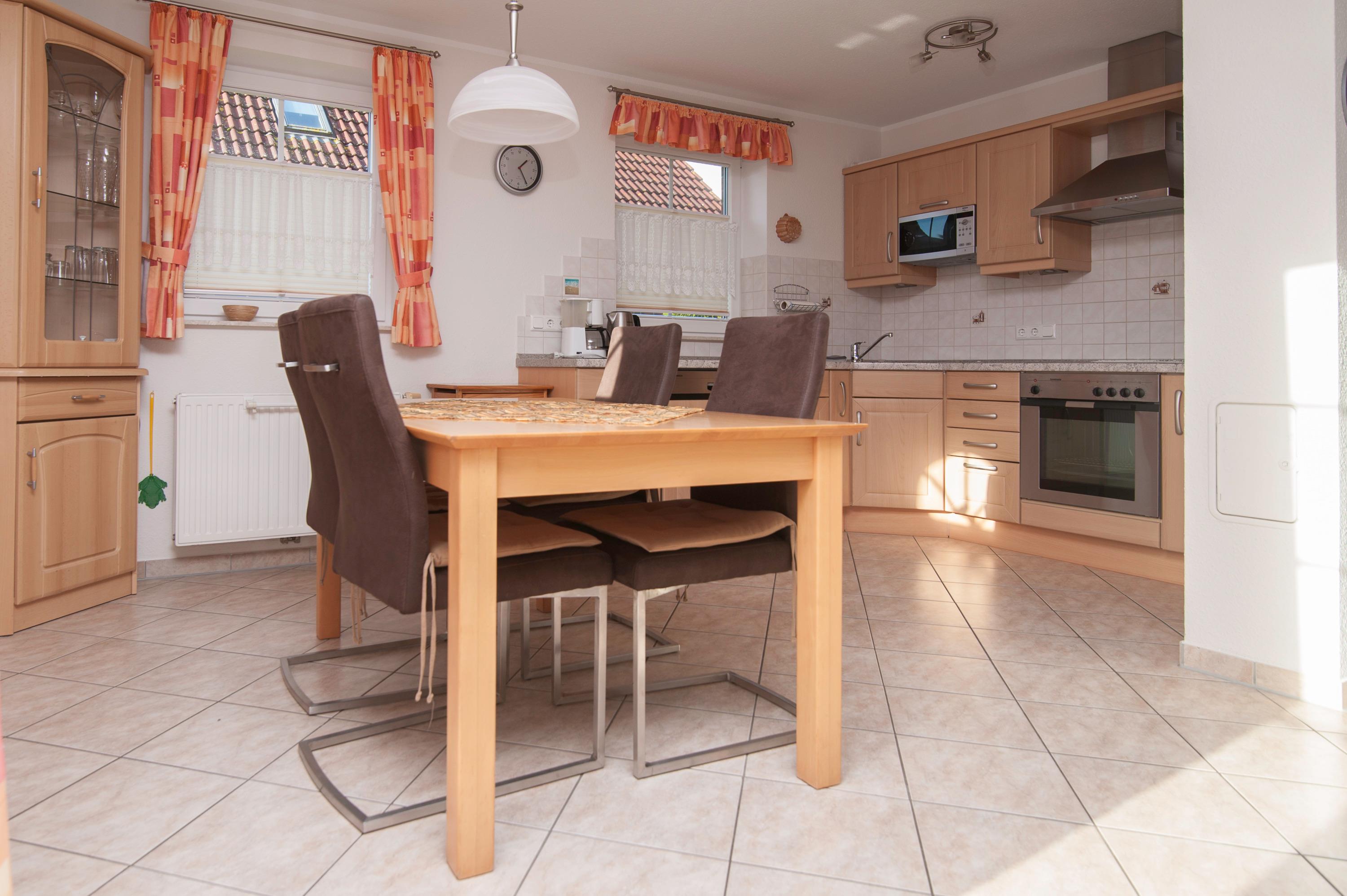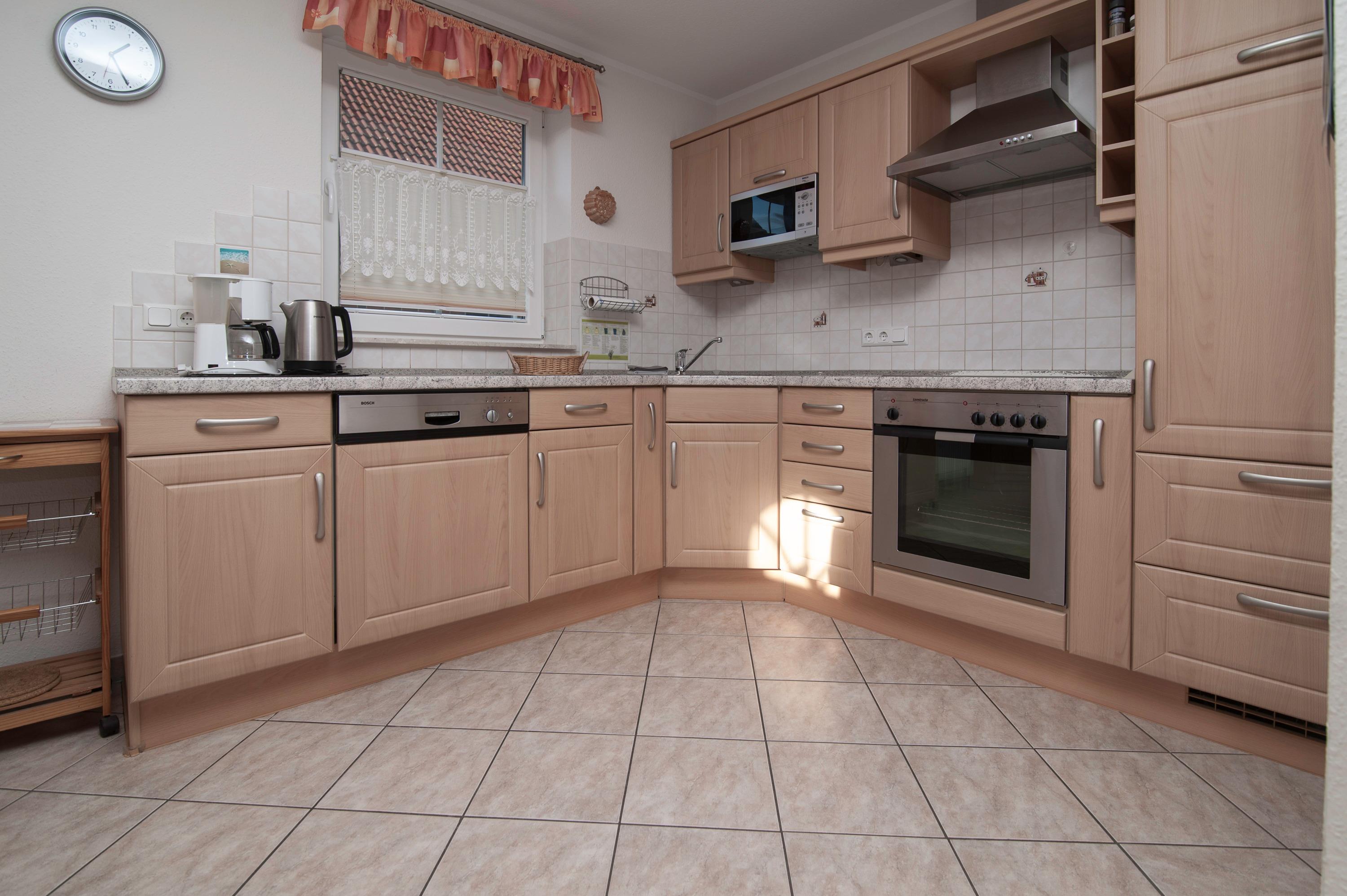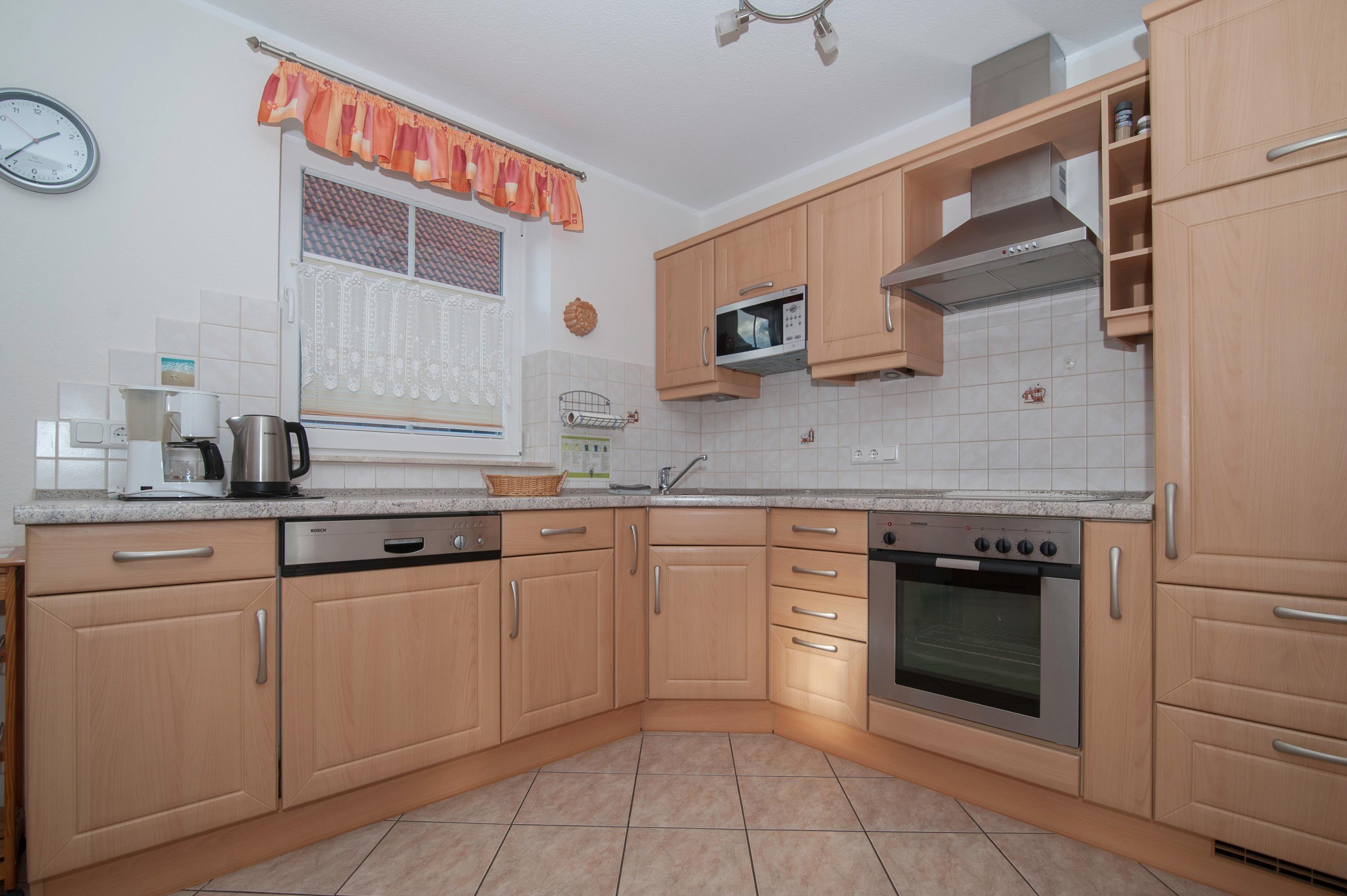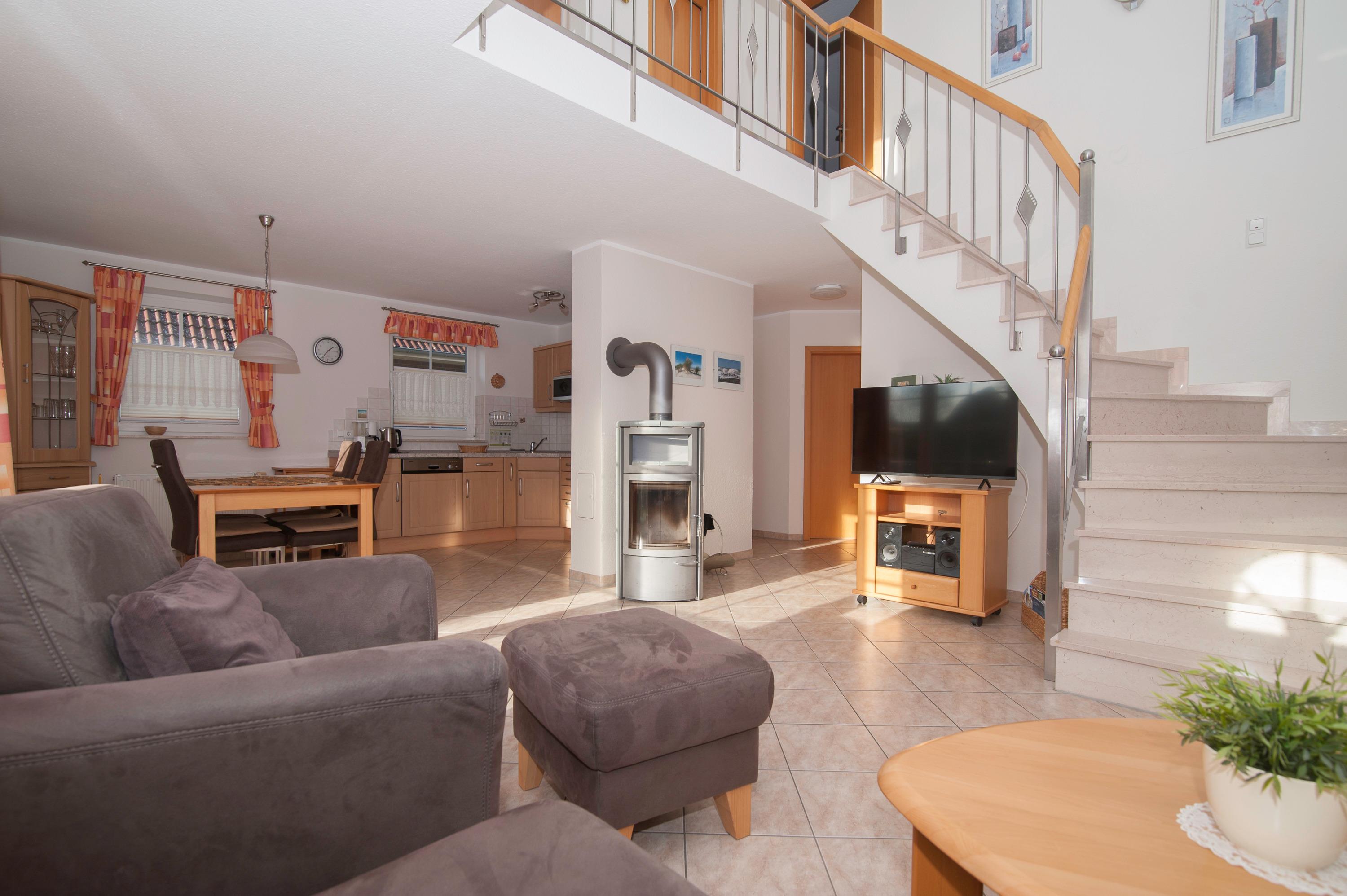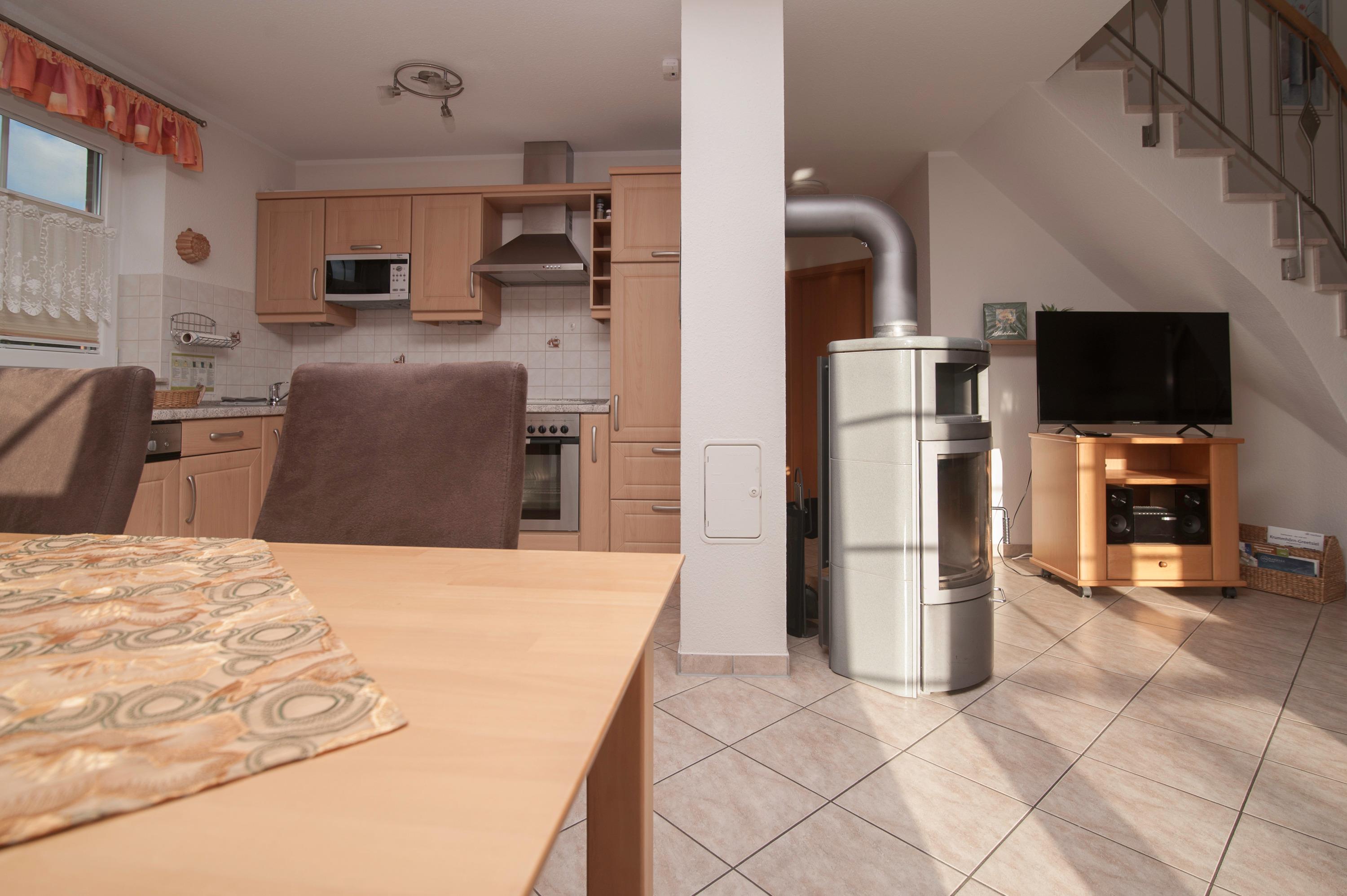 Sehr schöner, großzügiger Wohnraum mit 43"Panasonic LED-TV, DSL WLAN-Gastzugang, Polstergruppe, Kaminofen inkl. CO2 Melder, Essplatz, Einbauküche komplett ausgestattet: Herd mit Cerankochfeld, Dunstabzugshaube Geschirrspüler, Kühlschrank mit Gefrierfach, Filterkaffeemaschine, Mikrowelle. Insektenschutzgitter sind vorhanden.