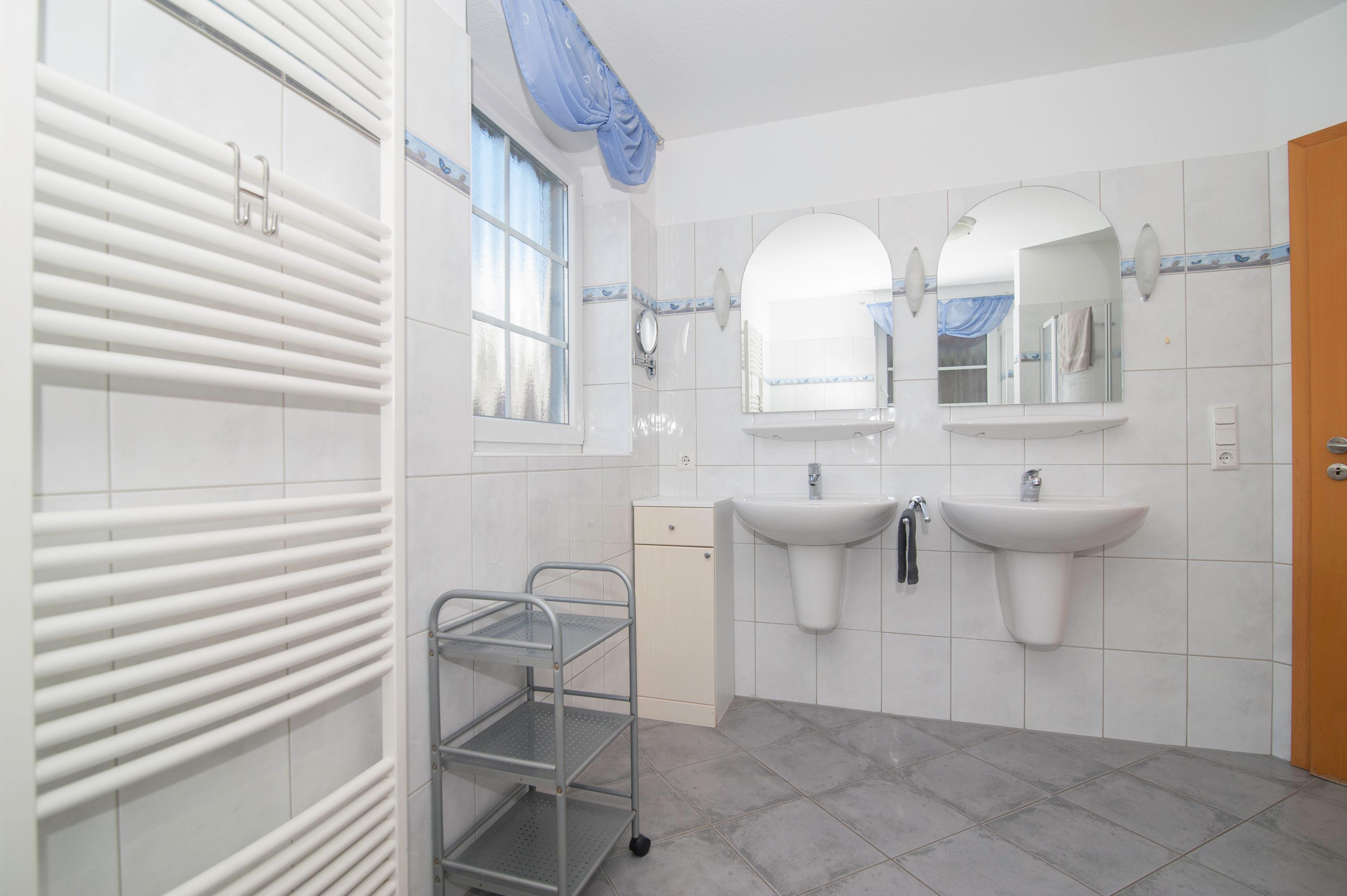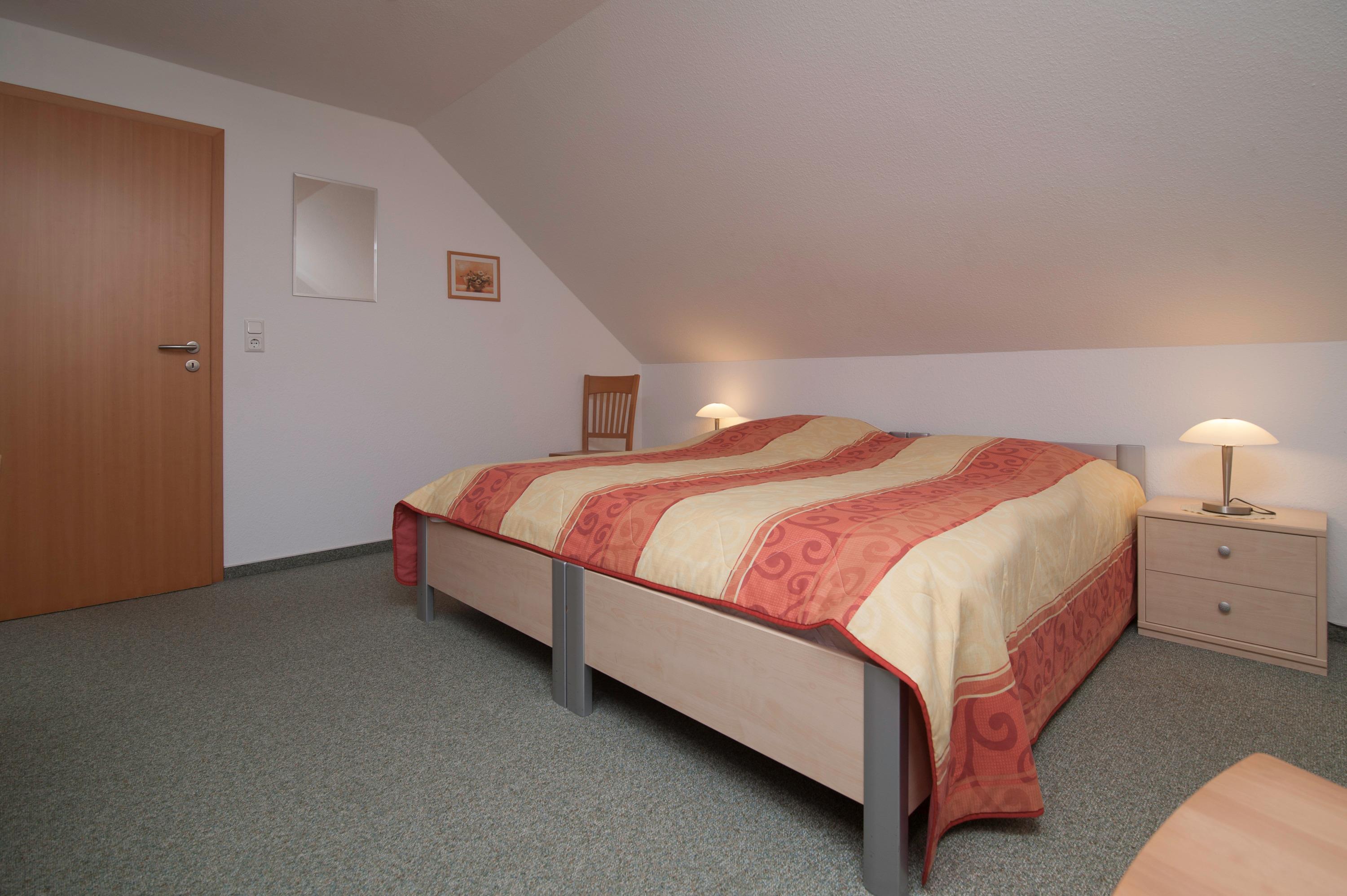 Ein weiteres Schlafzimmer mit Teppichboden im Obergeschoß, Verdunkelung durch Plissee und Vorhang, mit zwei Einzelbetten hier befindet sich ein zusätzliches 28"Grundig LCD-TV. Hier finden Sie auch das Kinderbett und den Hochstuhl. Nebenan ein WC mit Waschbecken.
