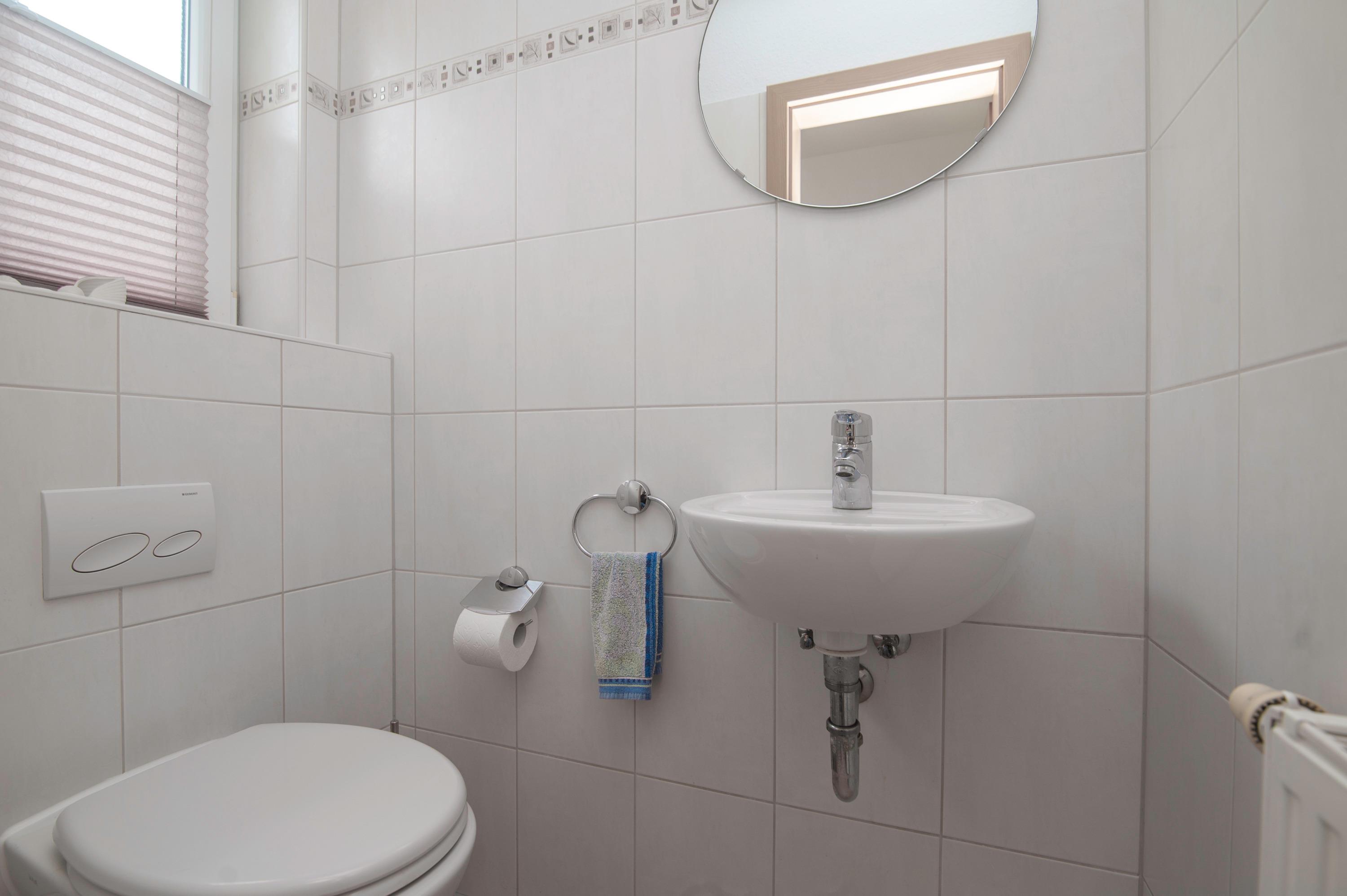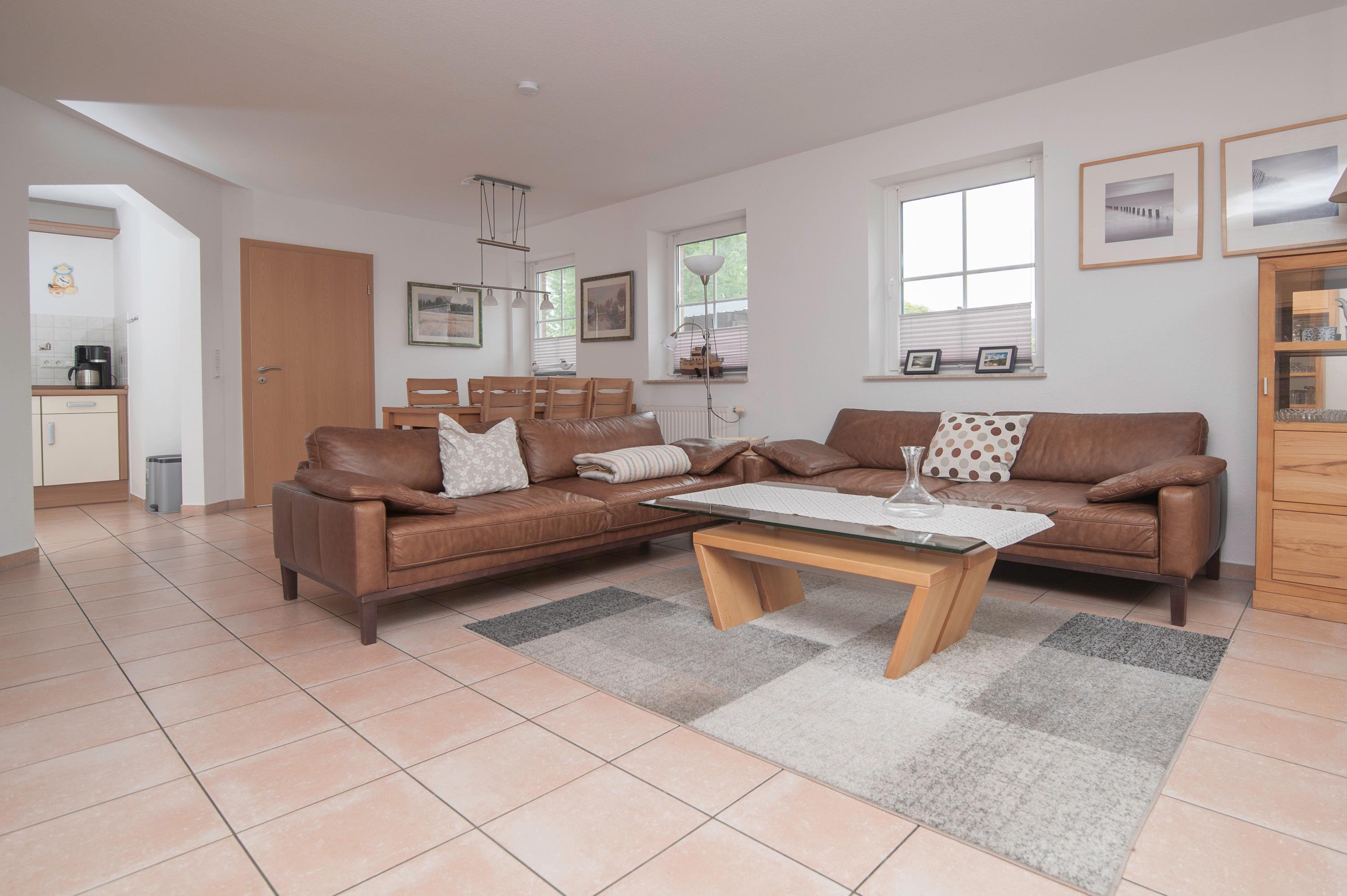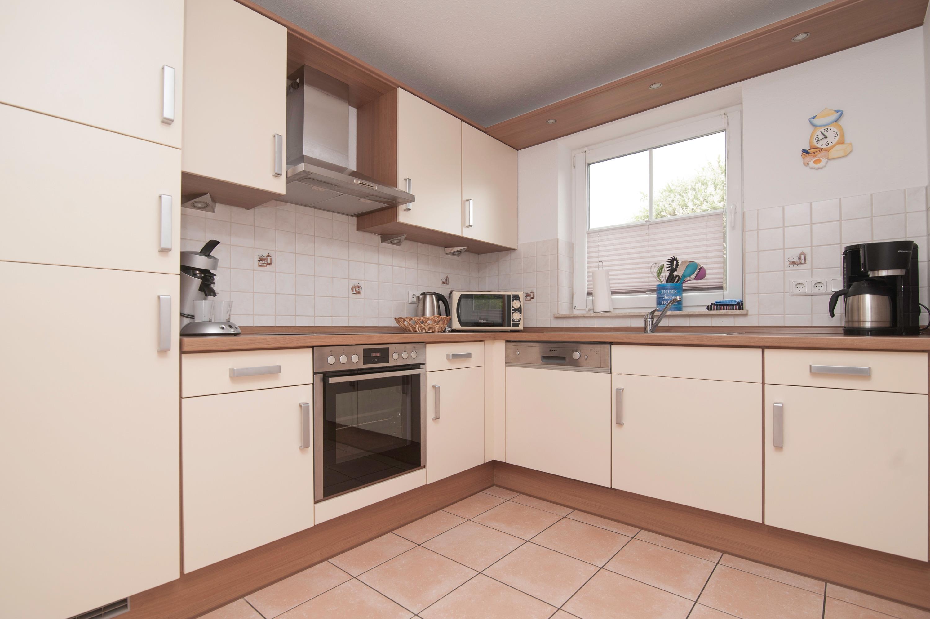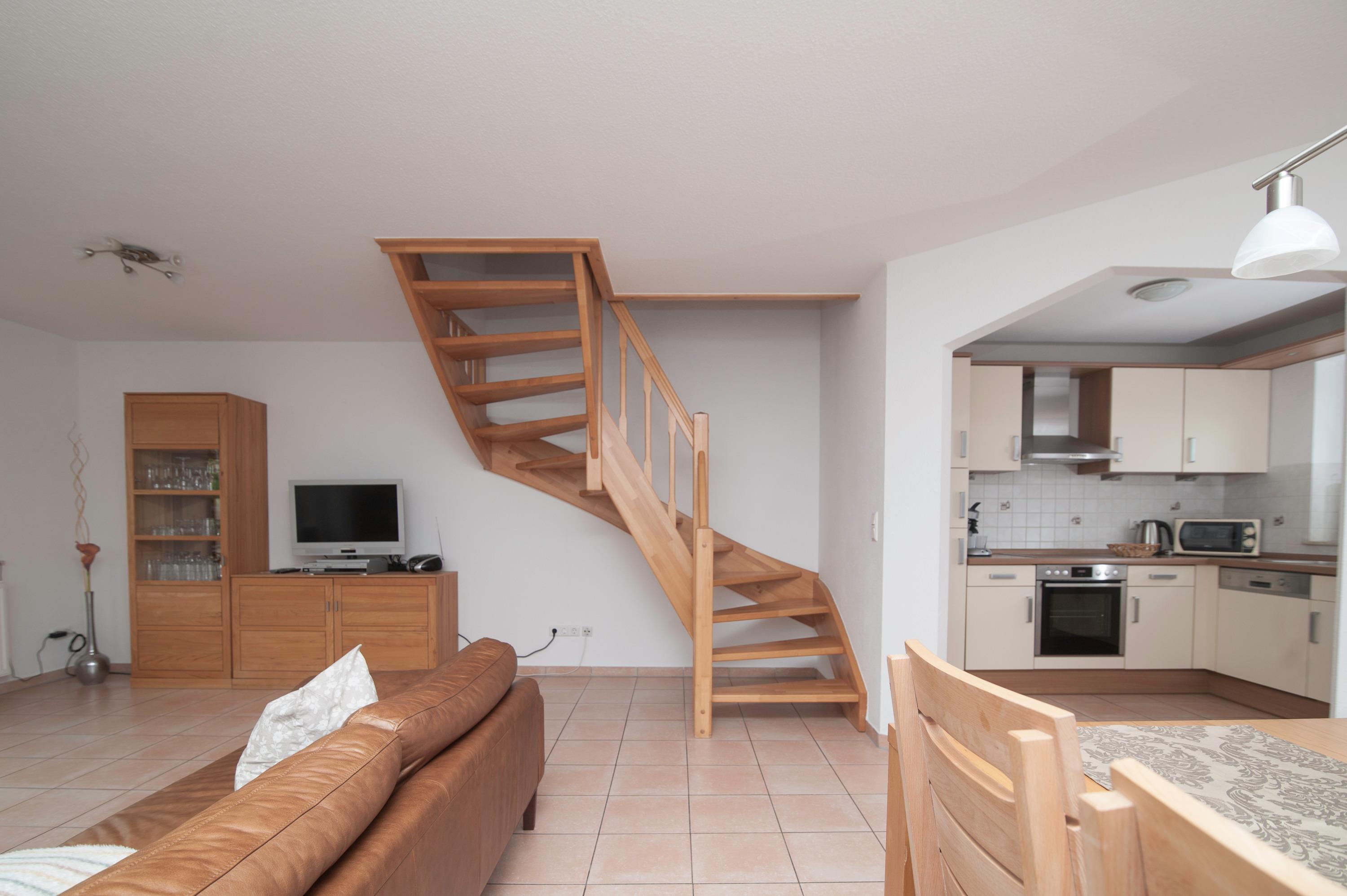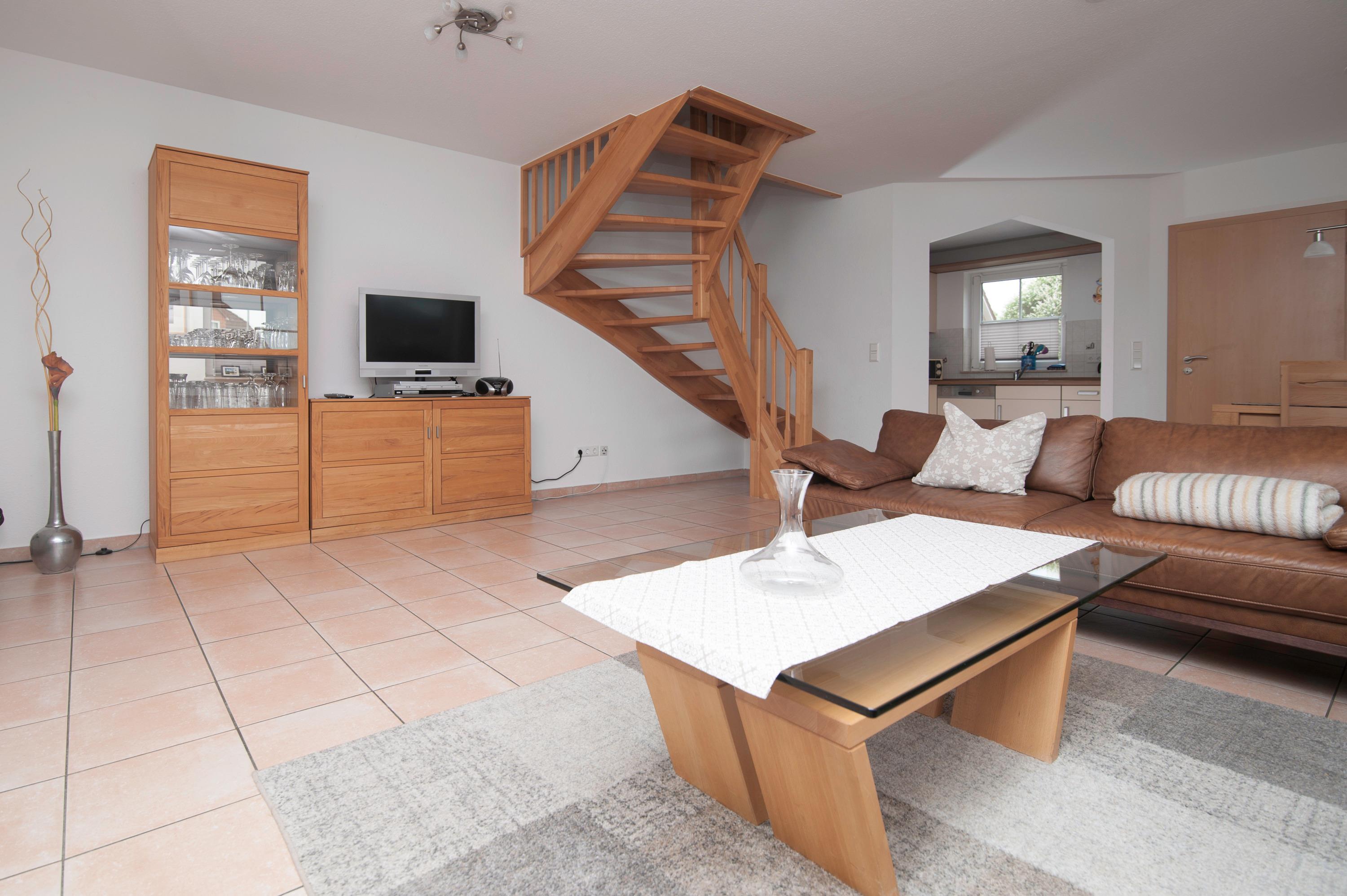 Im Erdgeschoss befindet sich der großzügige Wohn-/Essraum mit einem 32" TechniSat FullHD LED-TV, inkl. separater voll ausgestatteter Küche: Herd mit Cerankochfeld, Mikrowelle, Dunstabzugshaube, Kühlschrank mit Gefrierfach, Geschirrspüler, Filterkaffee und Kaffeepadmaschine, Mixer, Eierkocher, Pürierstab u.v.m. sowie ein Gäste-WC. Ein DSL WLAN-Gastzugang ist vorhanden.
