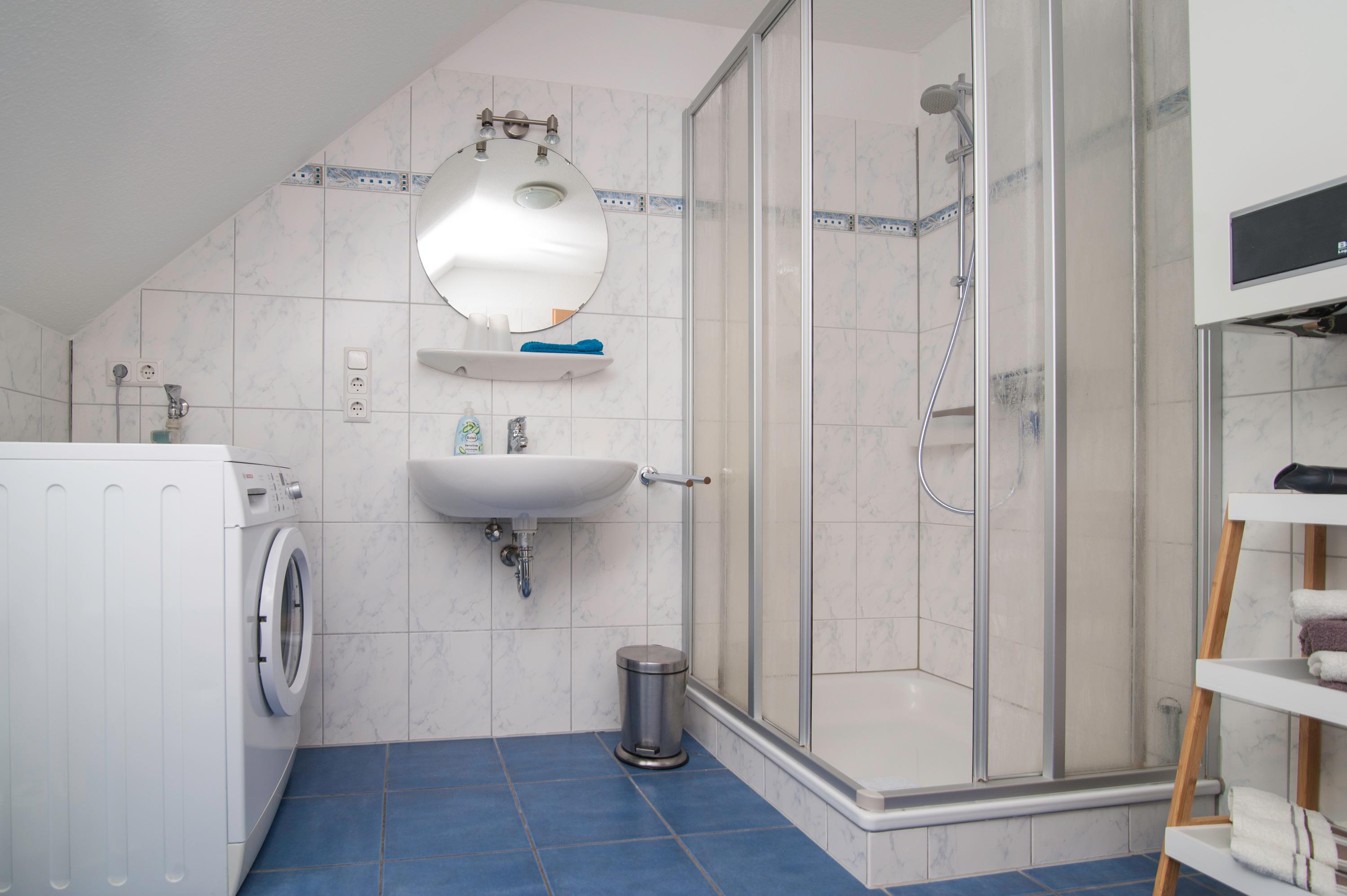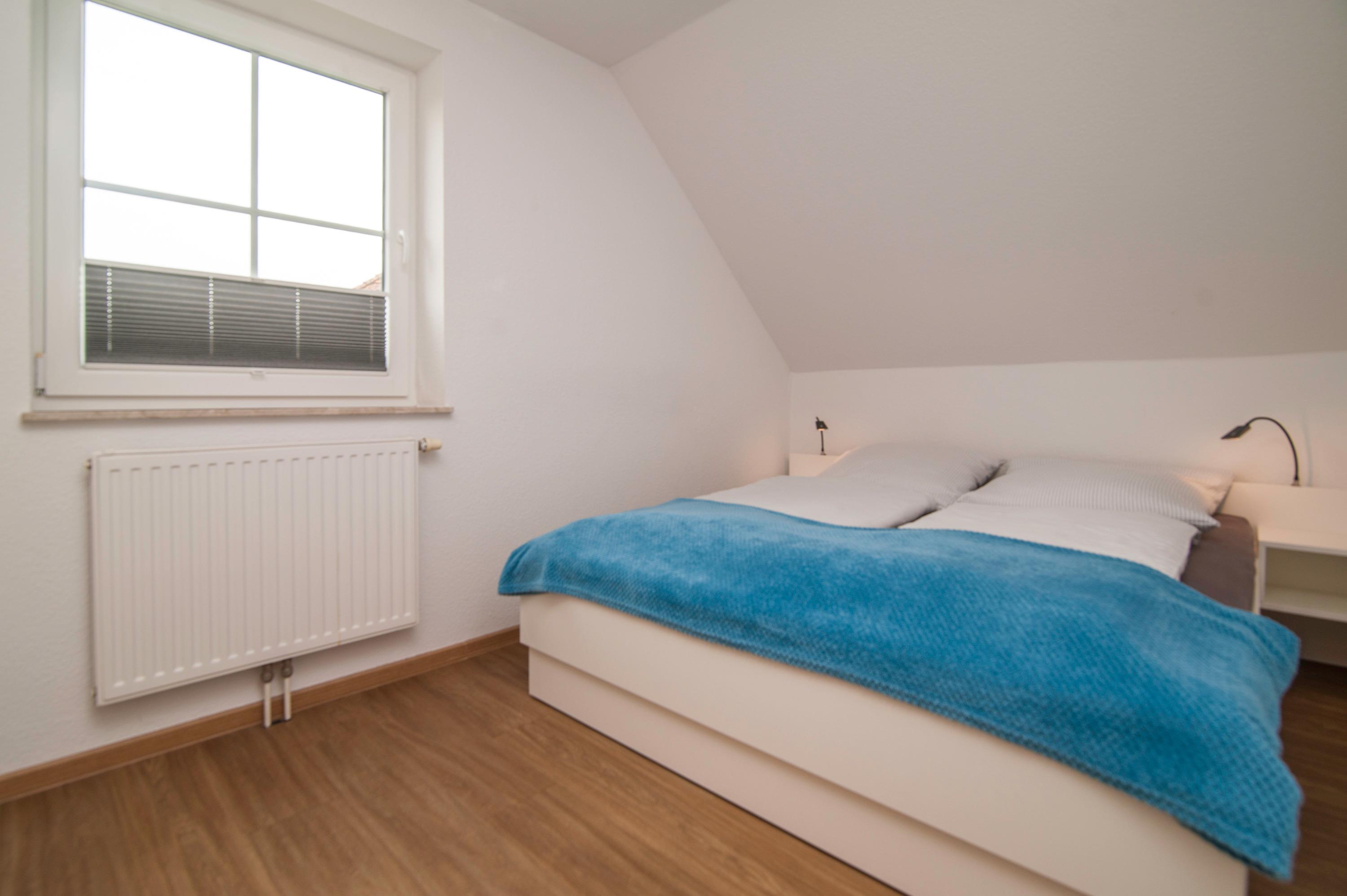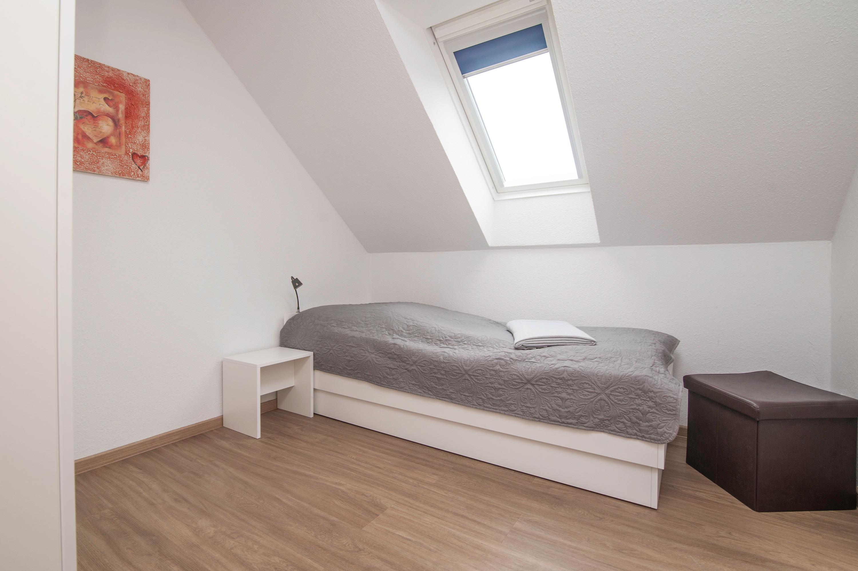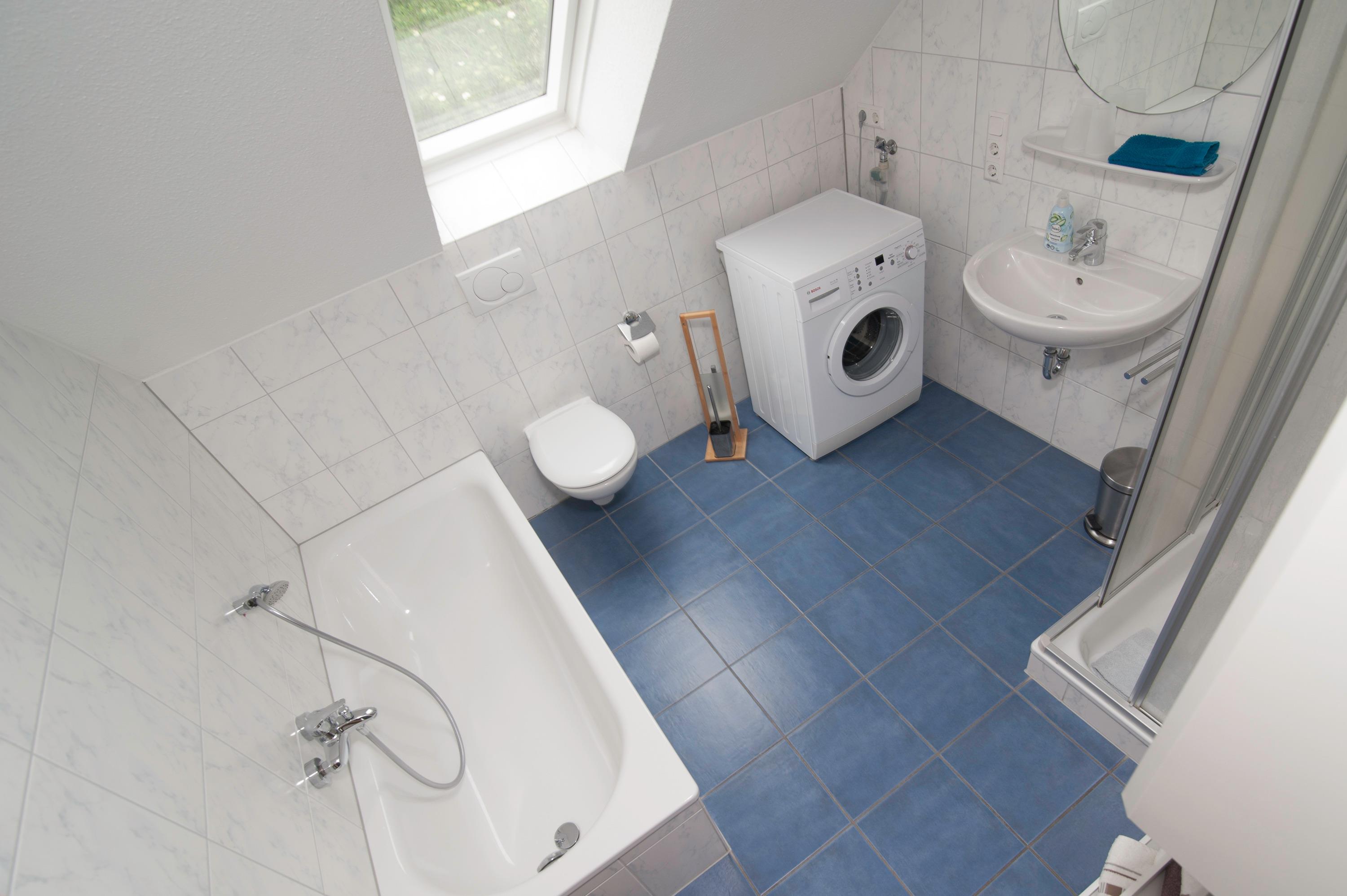 3 Schlafzimmer im Obergeschoß: 1 Schlafzimmer mit Doppelbett (1,60 mx 2,00 m), 1 Schlafzimmer mit 2 einzelnen Betten[nbsp] (0,80 x 2,00m) und 1 Schlafzimmer mit einem Einzelbett. in der Größe. Der Fußboden ist mit Vinyllaminat ausgestattet. Das Badezimmer mit WC, Badewanne und Dusche sowie Waschmaschine sind ebenfalls im Obergeschoß. Bügelbrett und Bügeleisen und ein Wäscheständer stehen ebenfalls zur Verfügung.