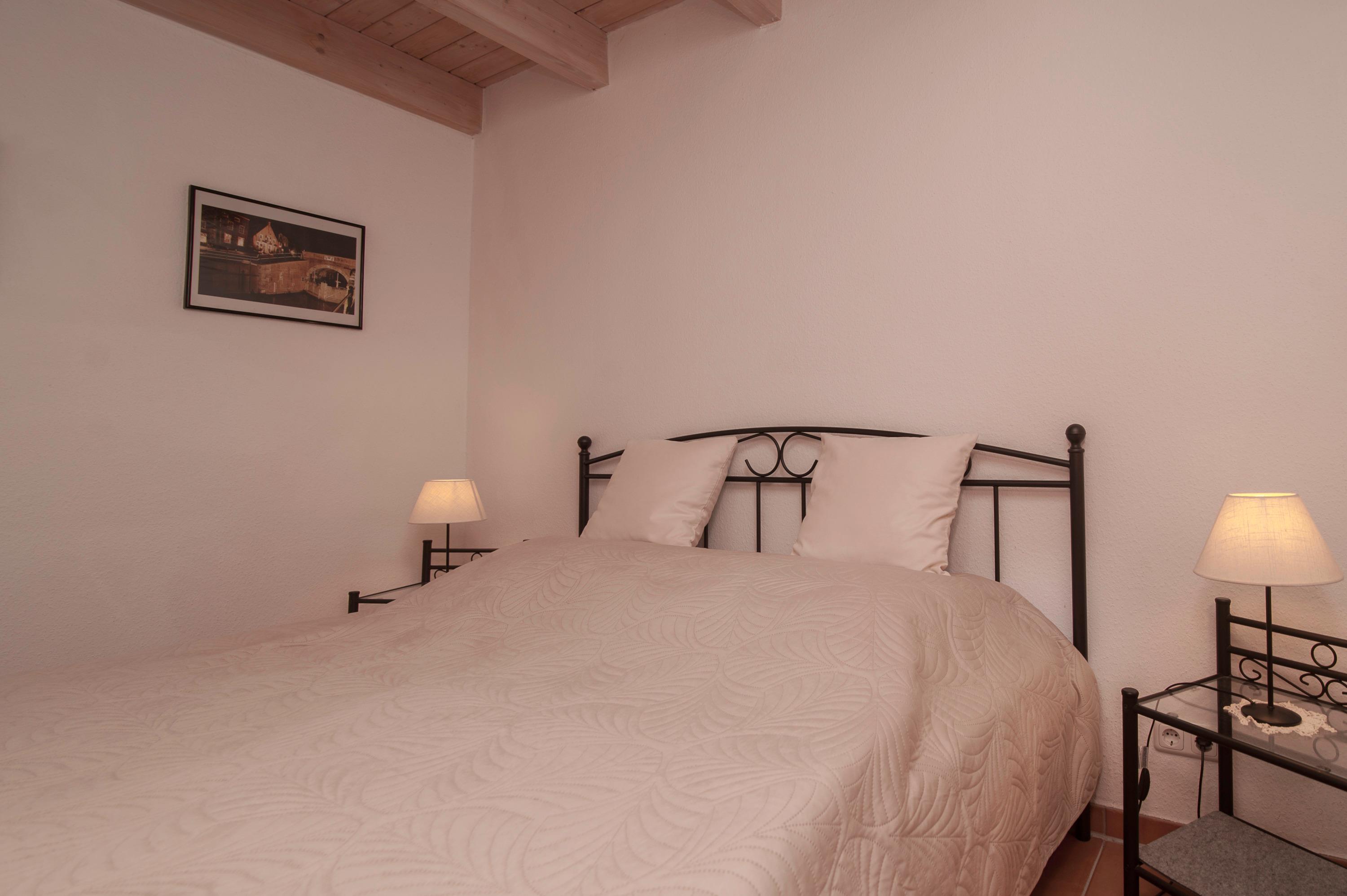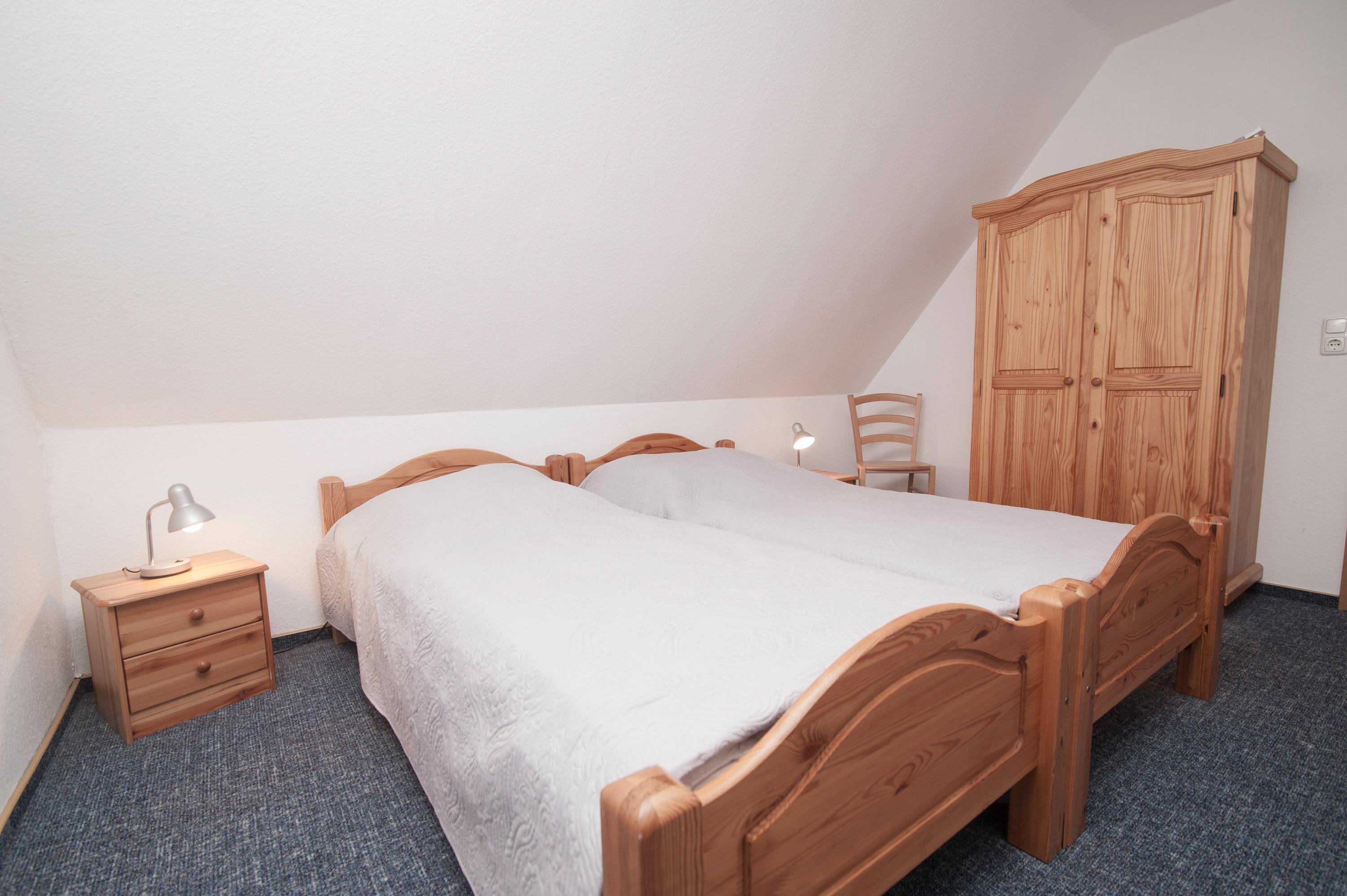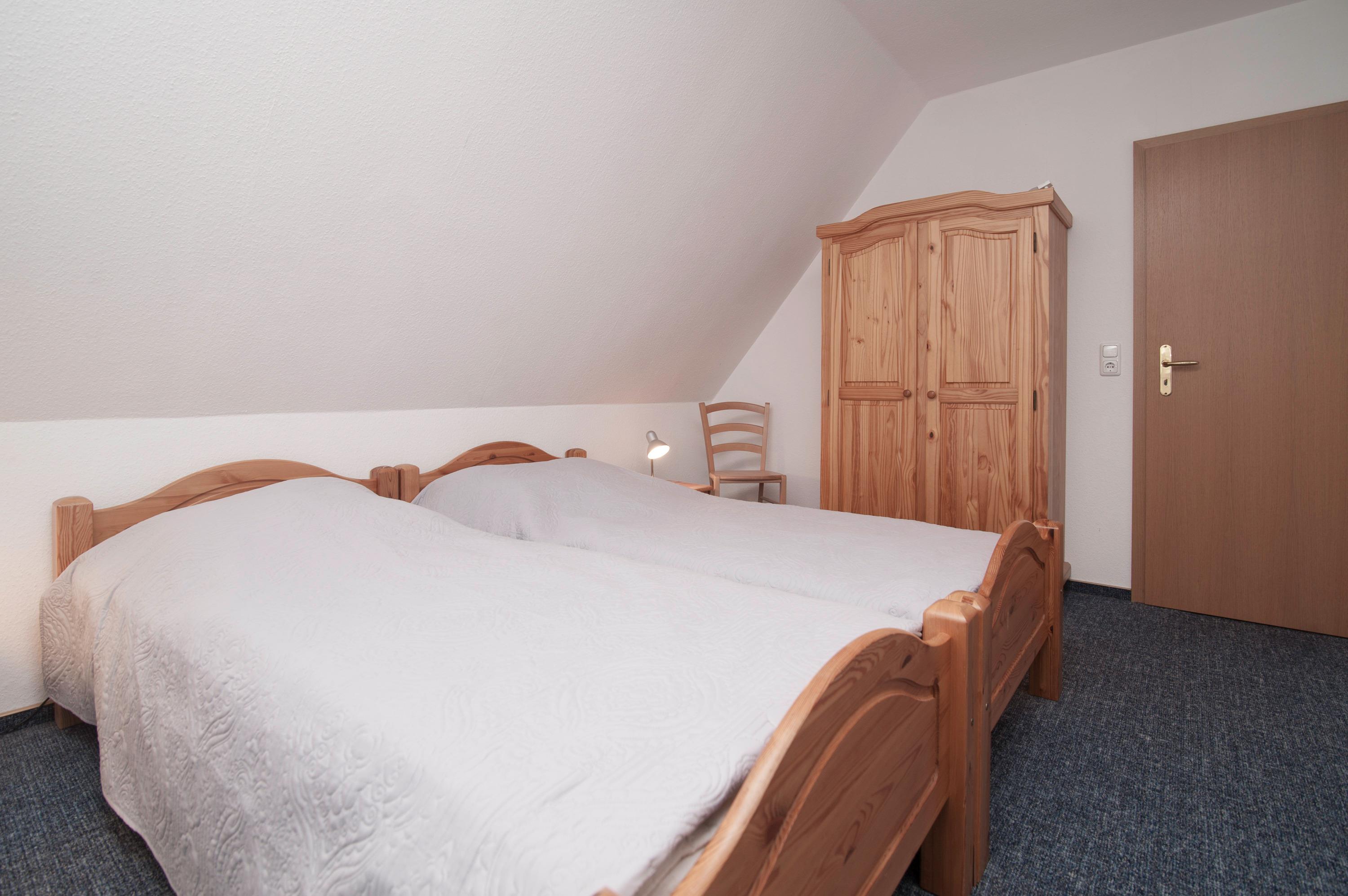 Schlafraum im Erdgeschoss mit Doppelbett (2 x 90 x 200cm), nebenan Bad mit Dusche, Waschbecken, WC. (Fußbodenerwärmung)