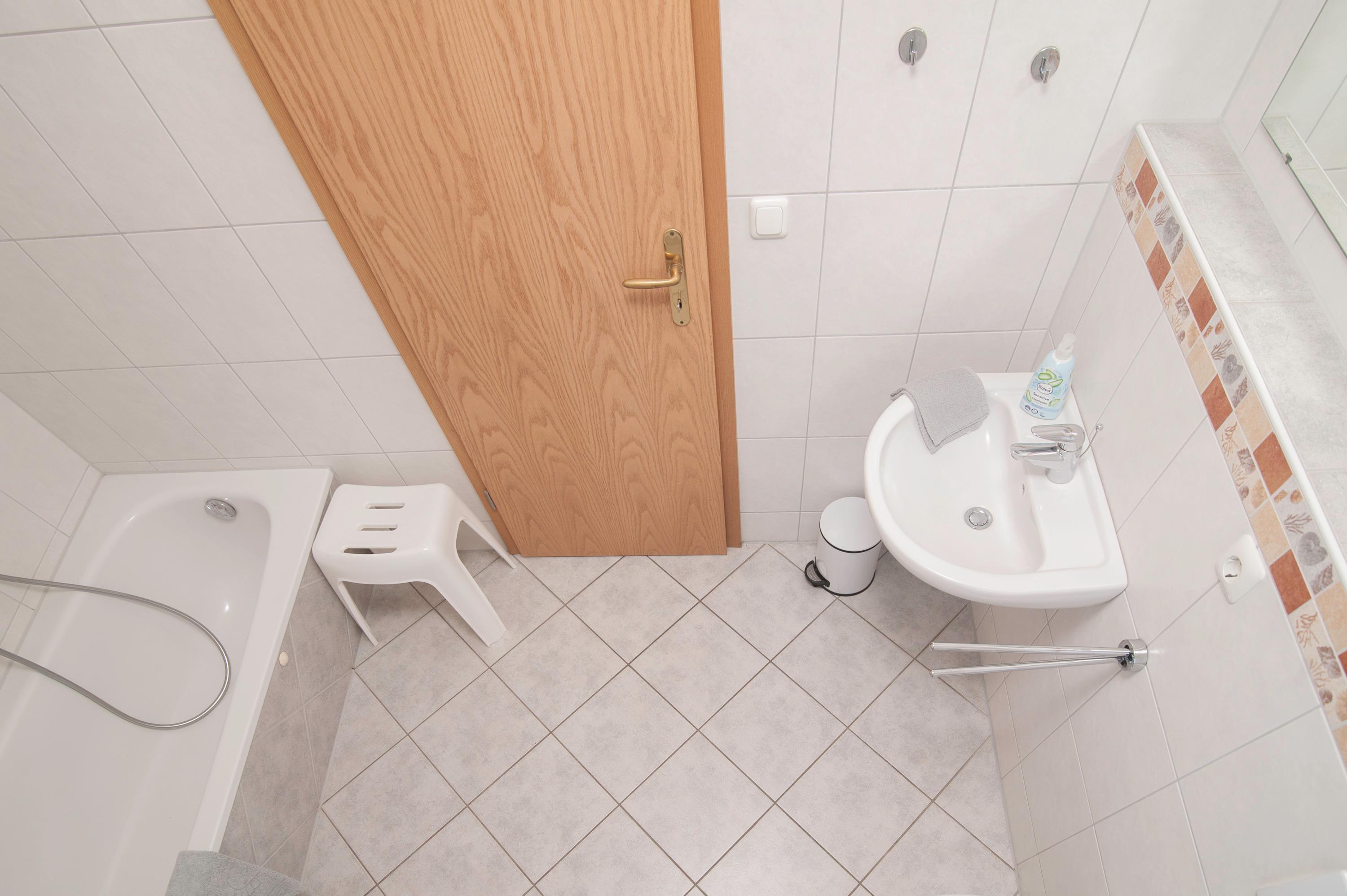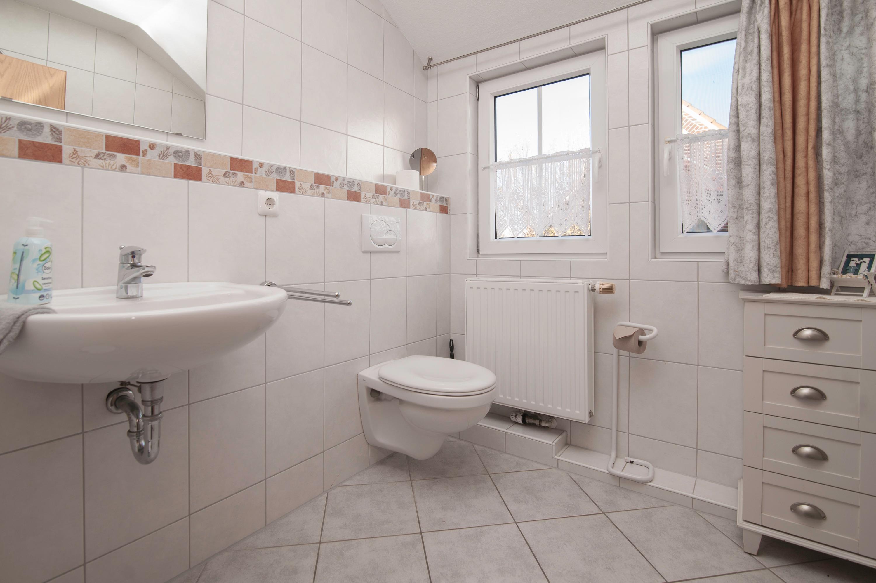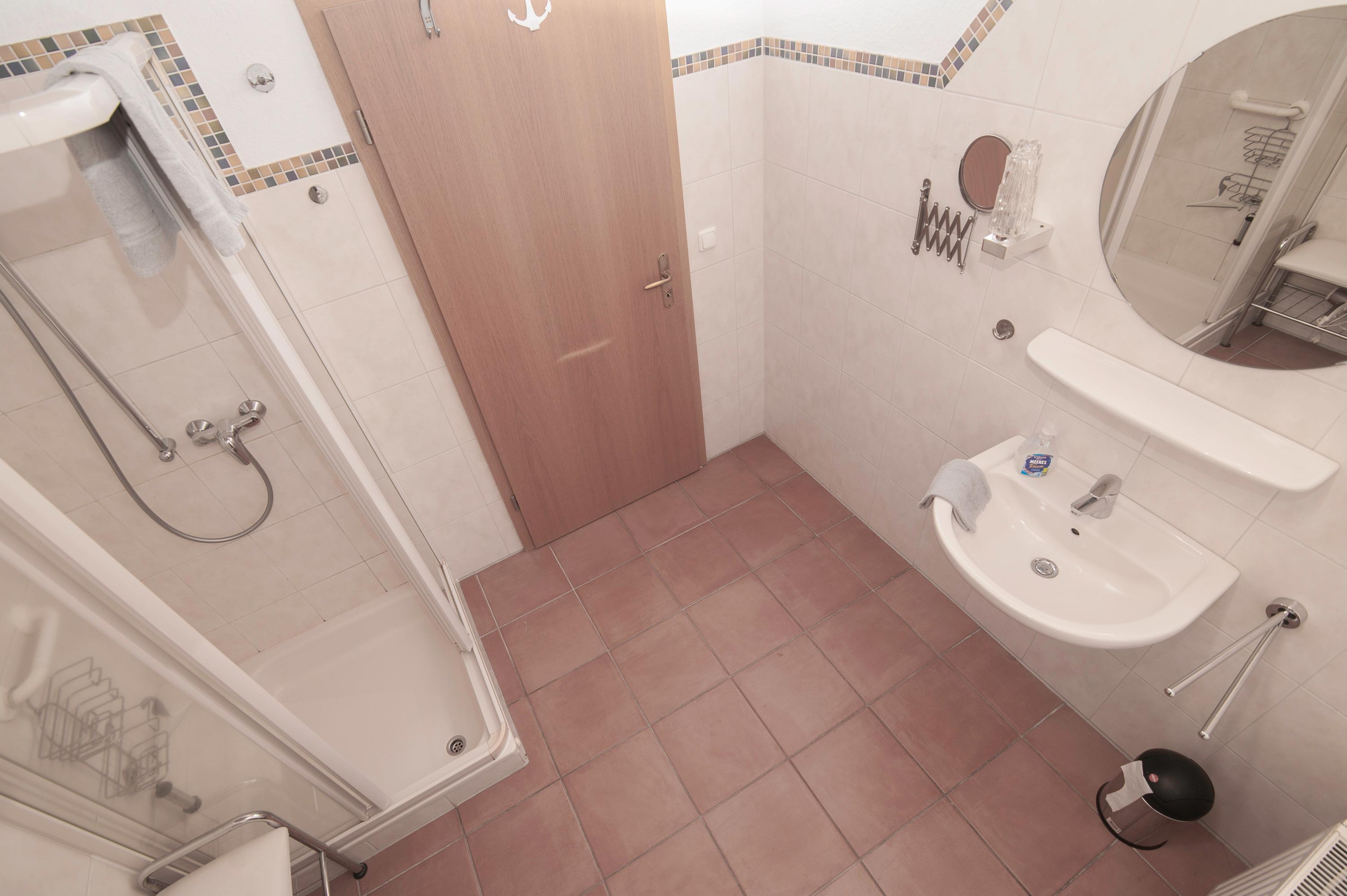 Schlafraum im Erdgeschoss mit Doppelbett (2 x 90 x 200cm), nebenan Bad mit Dusche, Waschbecken, WC. (Fußbodenerwärmung)