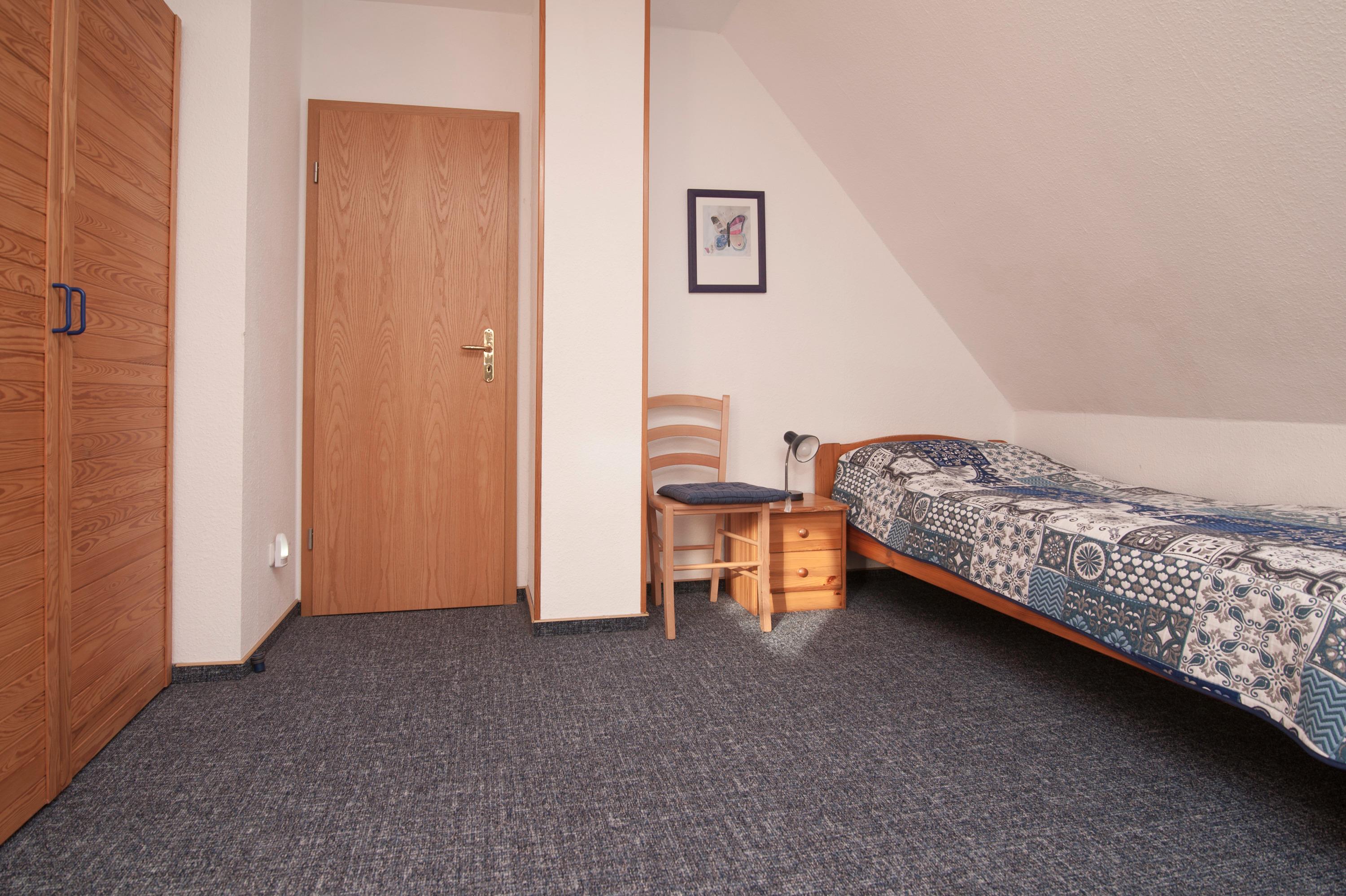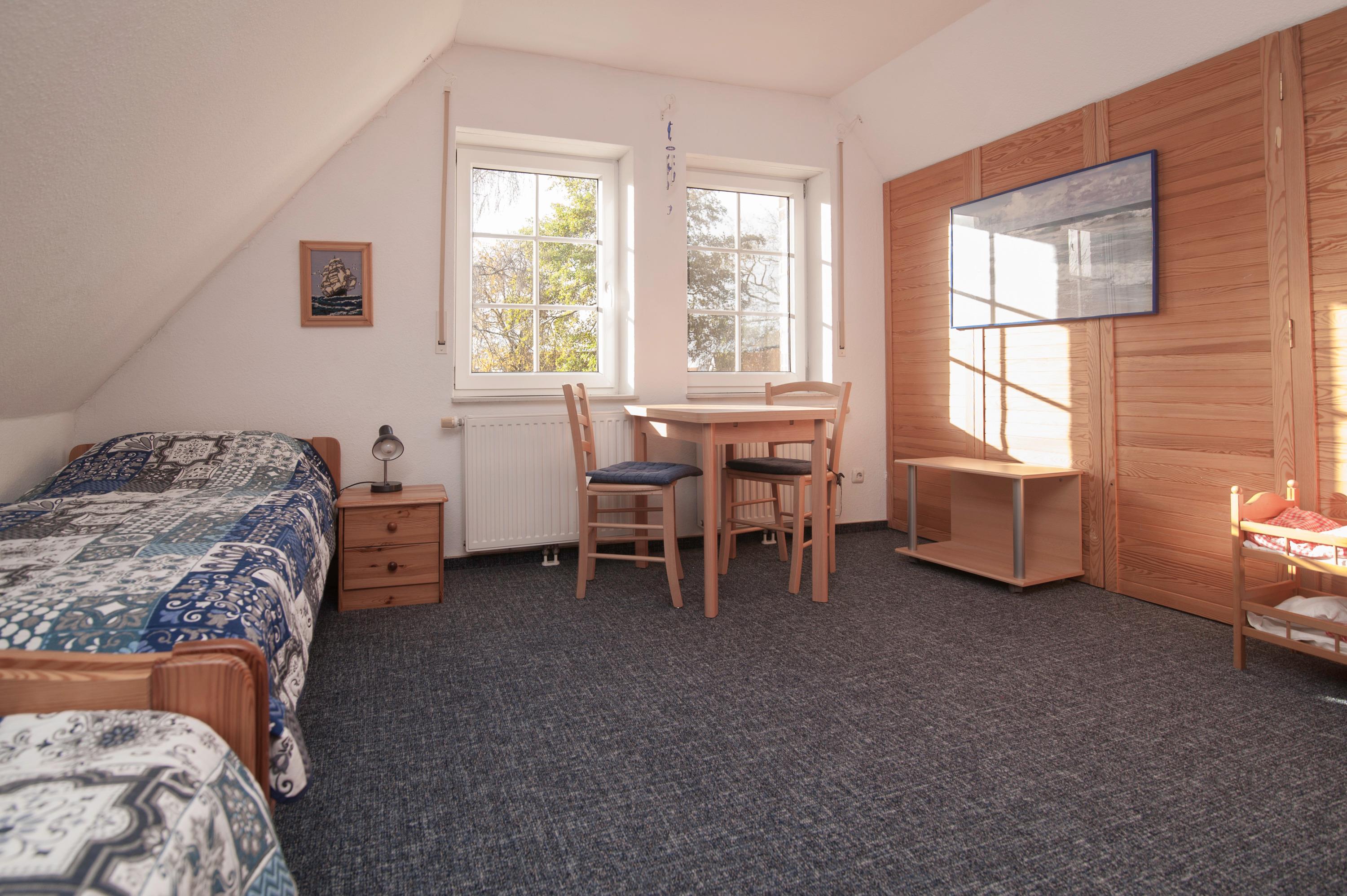 Schlafraum mit Teppichboden oben mit 2 Betten (90 x 200cm), Kinderbett, Leseecke mit Schwingsessel und Stehlampe (Deichblick)