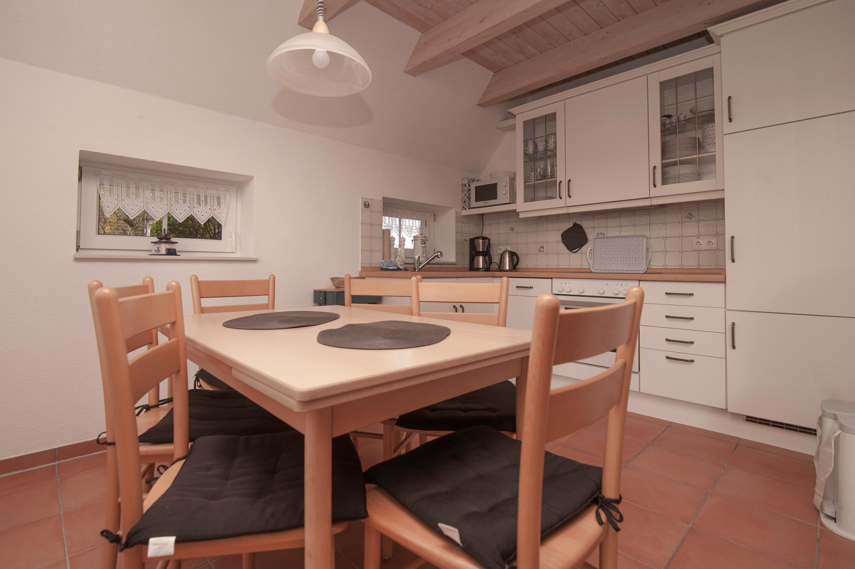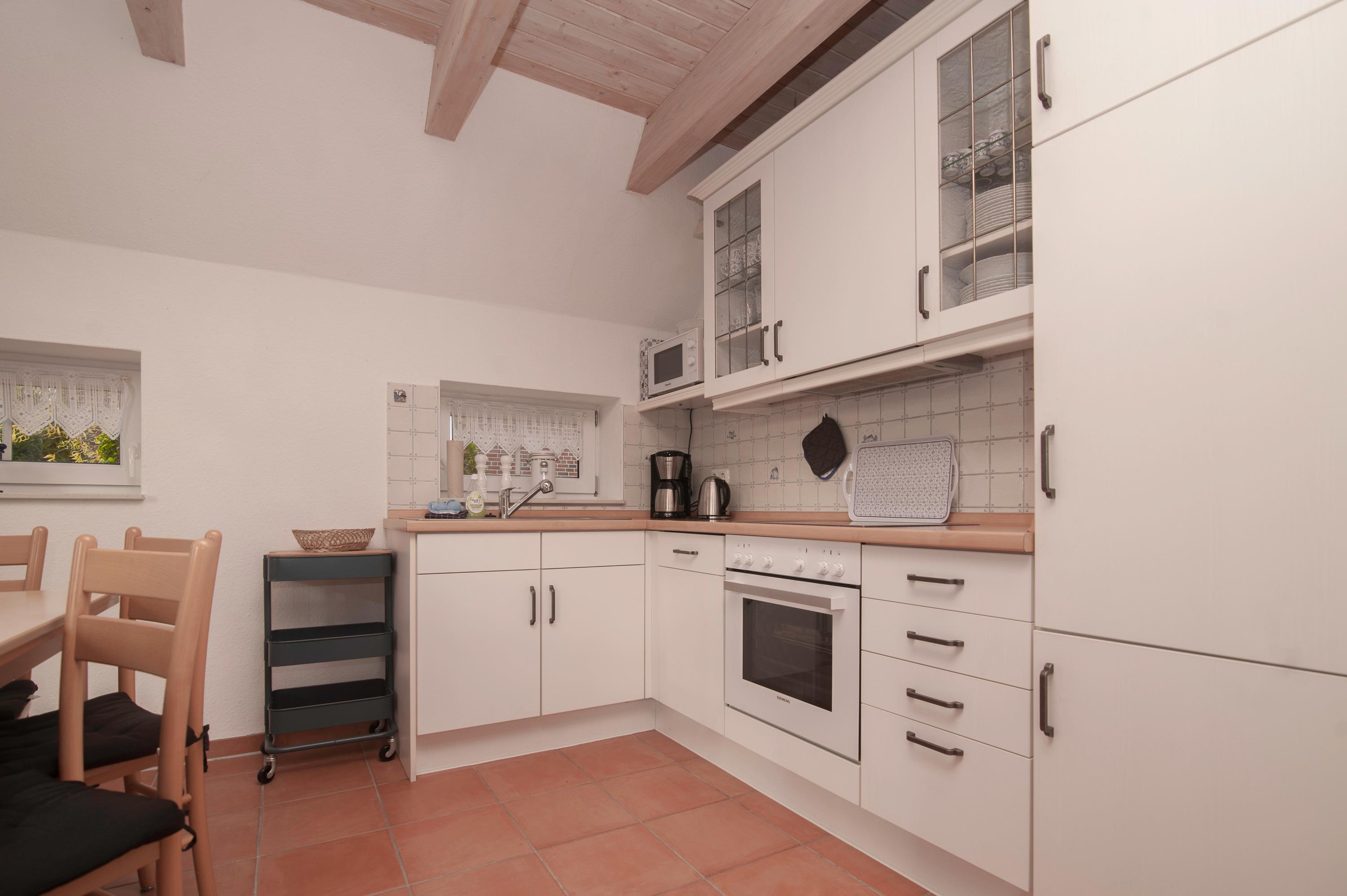 Sehr schöne Einbauküche im Friesenstil, komplett ausgestattet mit Herd und Cerankochfeld, Dunstabzugshaube, Mikrowelle, Geschirrspüler, Kühlschrank mit Gefrierfach, Filterkaffeemaschine und mehr. Essplatz für 6 Personen + Kinderhochstuhl.