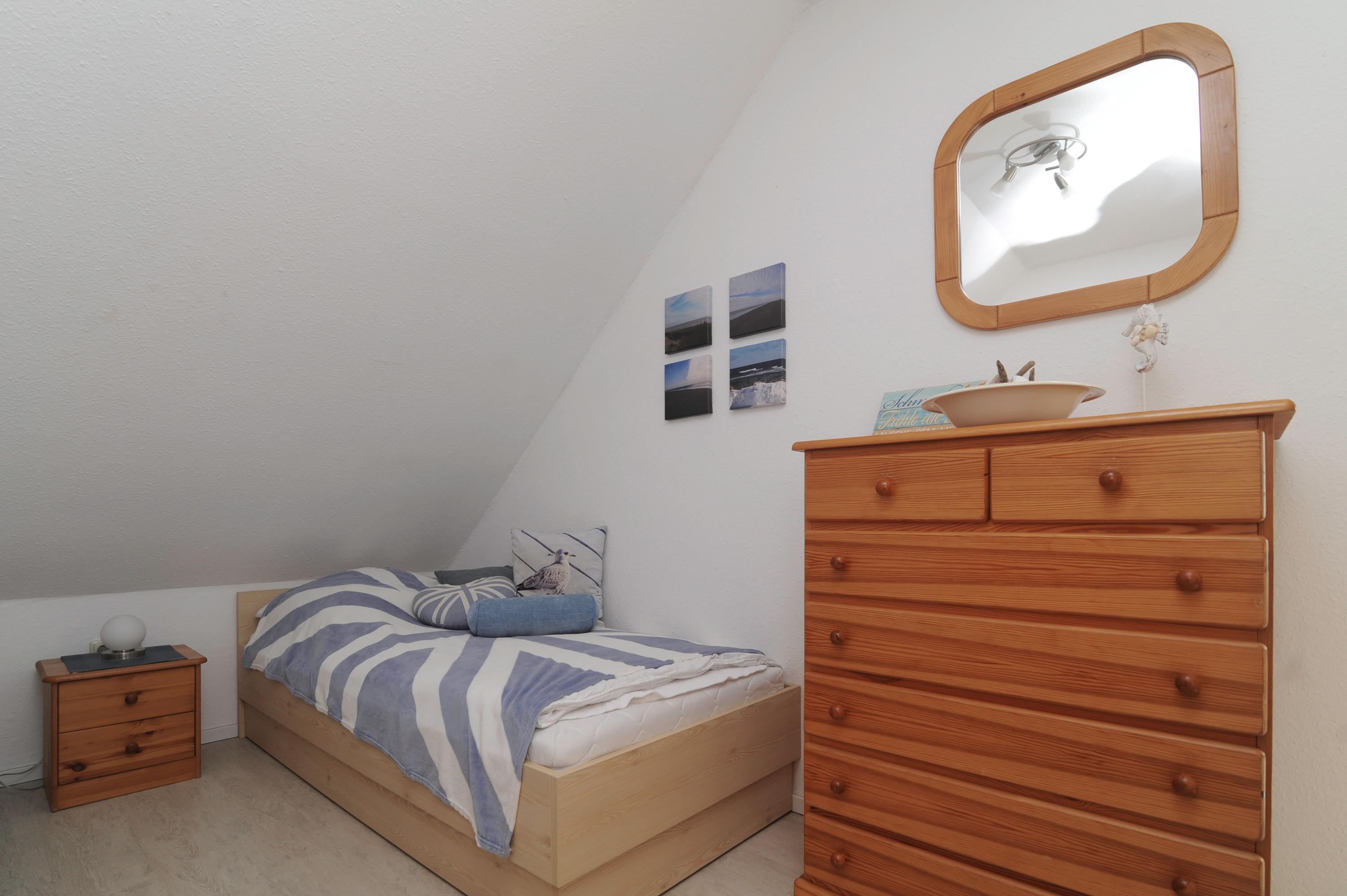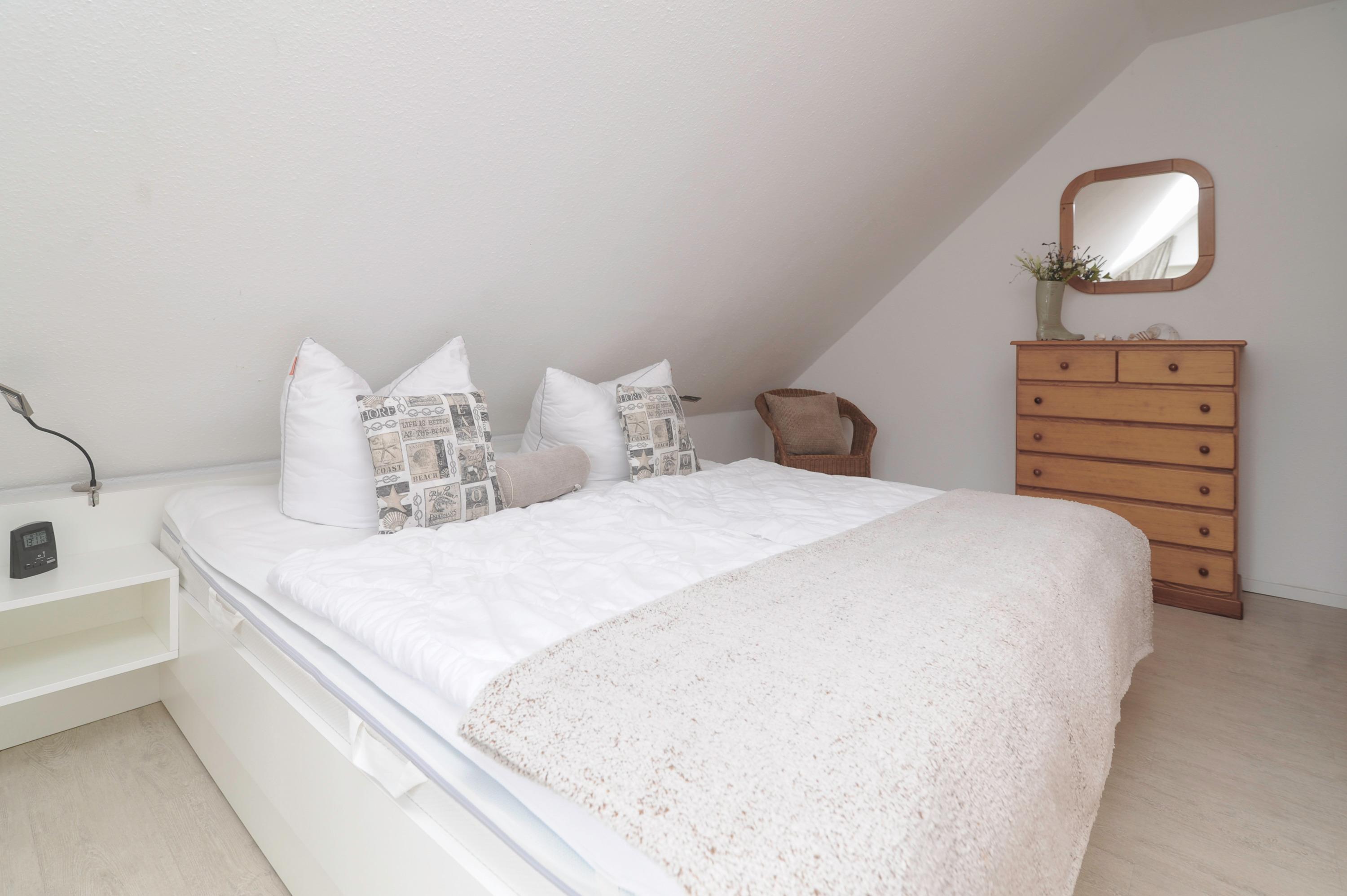 Im Obergeschoss befinden sich 1 Badezimmer mit Dusche und 2 Schlafzimmer, 1 Schlafzimmer mit Box-Springbett (2 x 90 x 200cm) und 1 Schlafzimmer mit 2 Einzelbetten (90 x 200cm). Alle Betten verfügen über verstellbare Lattenroste. Ein Kinderreisebett und ein Hochstuhl können gegen eine Gebühr zur Verfügung gestellt werden.