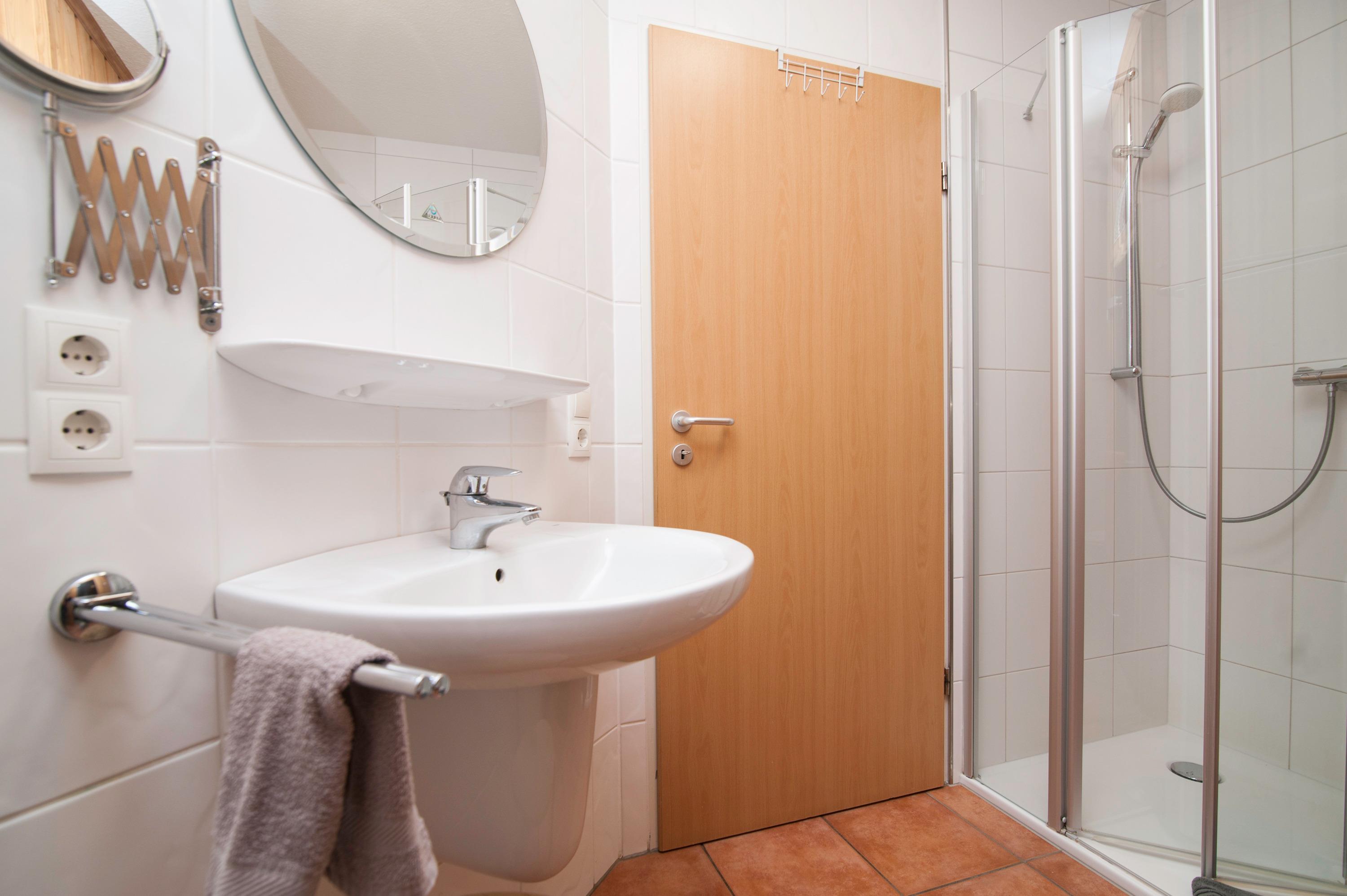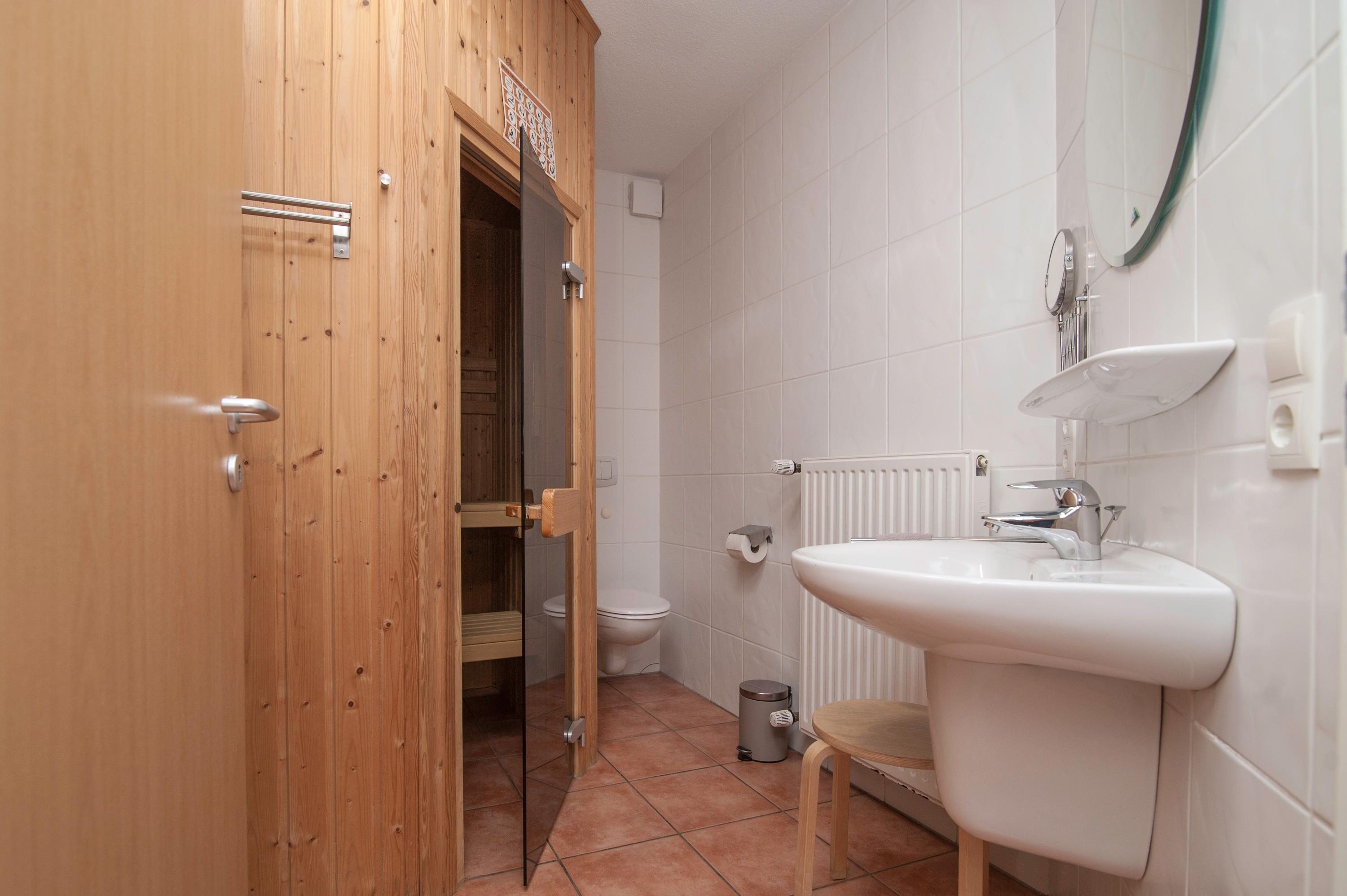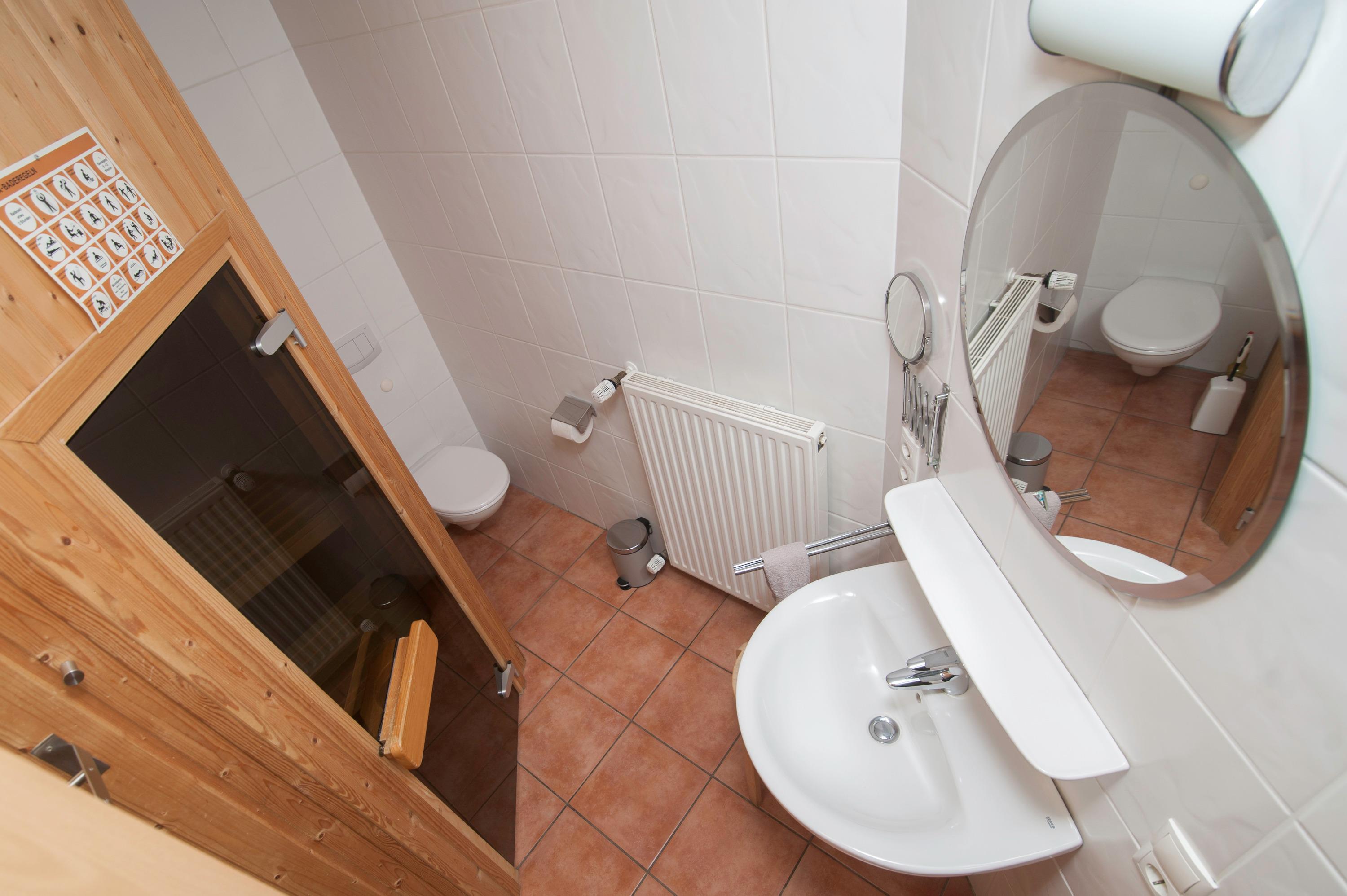 Das innenliegende Badezimmer verfügt über eine Dusche mit niedrigem Einstieg, ein WC und eine Sauna. In einem kleinen Abstellraum befinden sich eine Waschmaschine (5 kg), ein Wäscheständer und ein Bügelbrett. Ein Fahrradschuppen mit 230V Steckdosen bietet sicheren Platz für mitgebrachte Pedelecs. Ein PKW-Stellplatz gehört ebenfalls zur Wohnung.