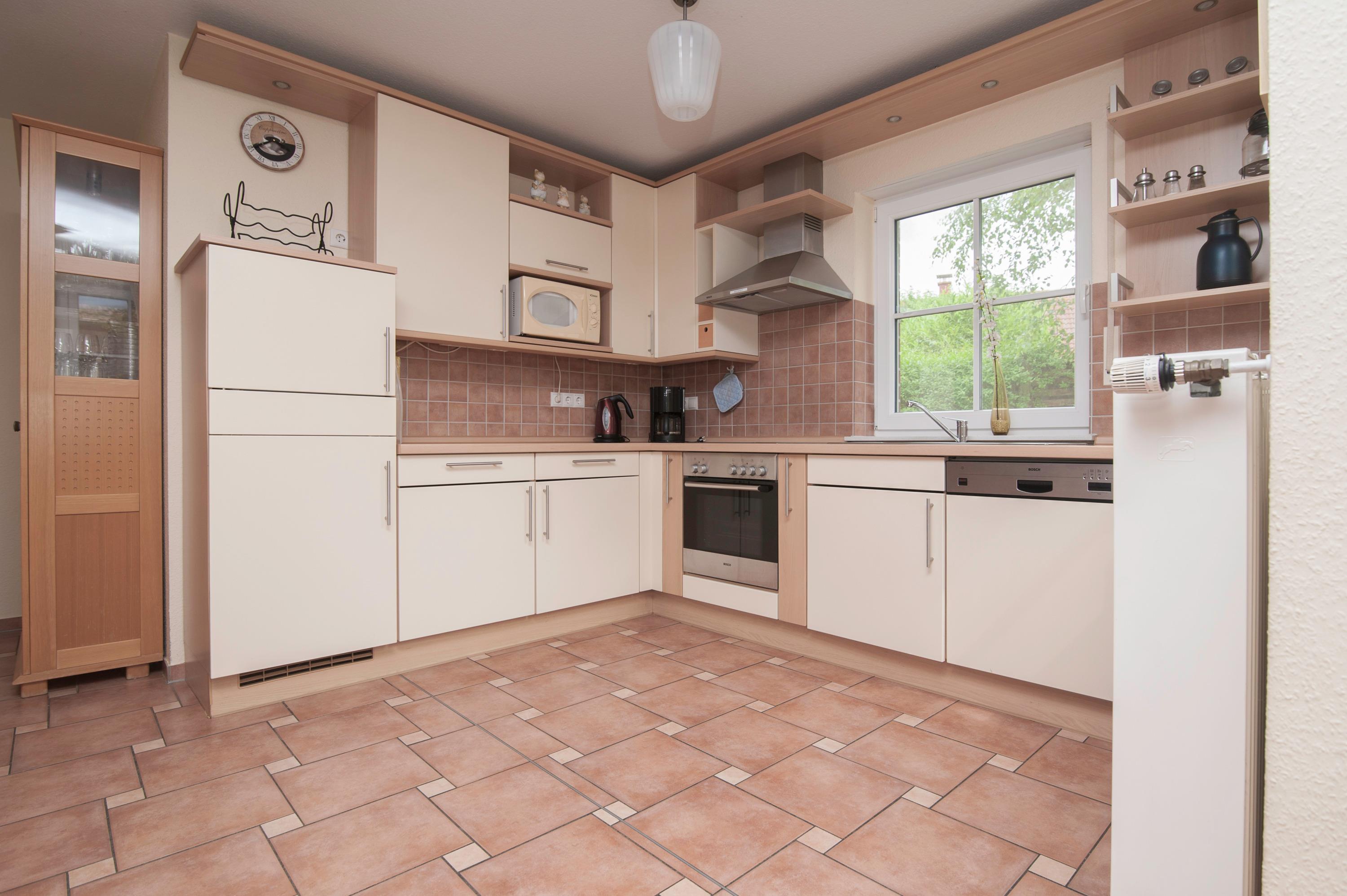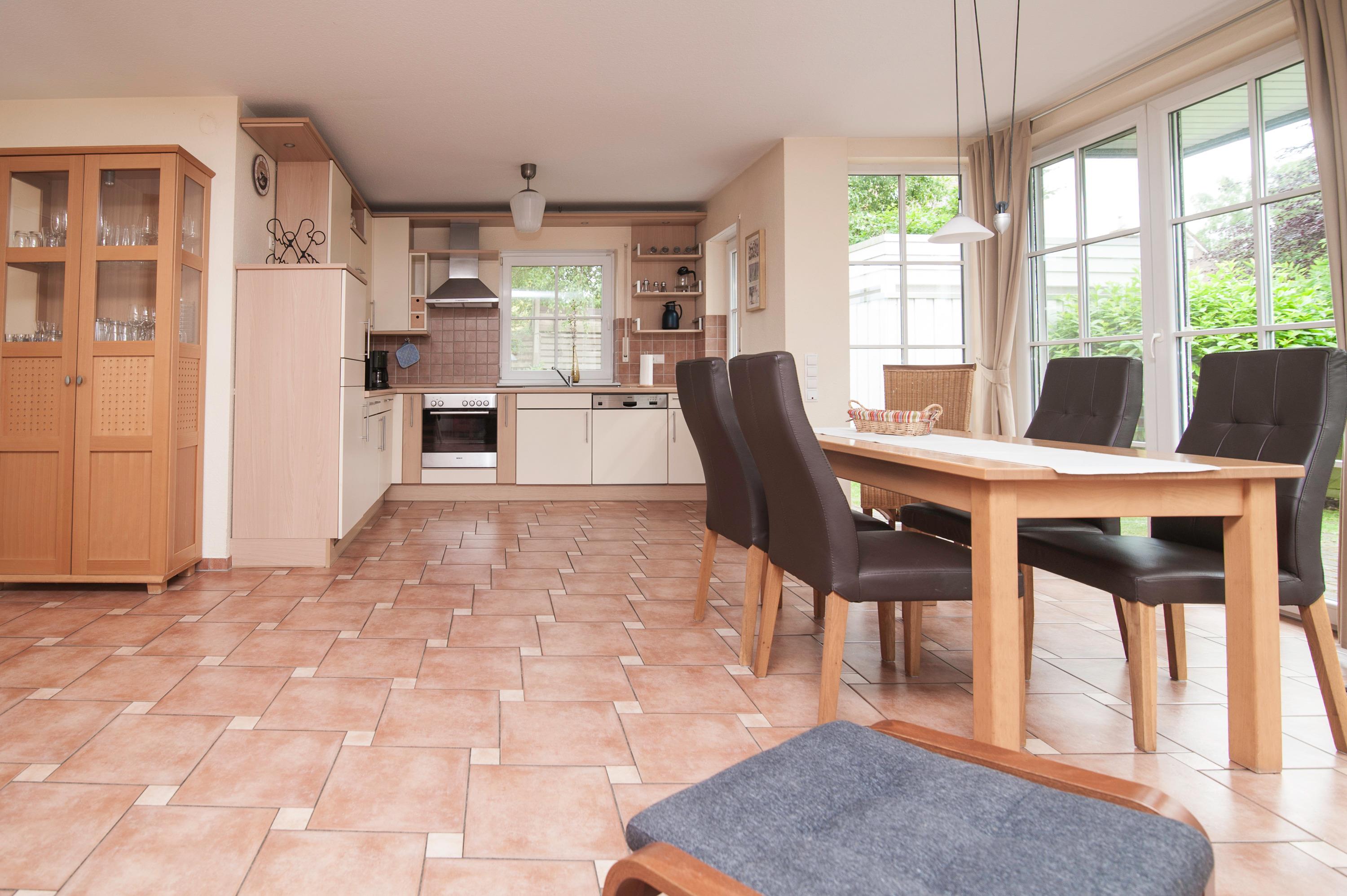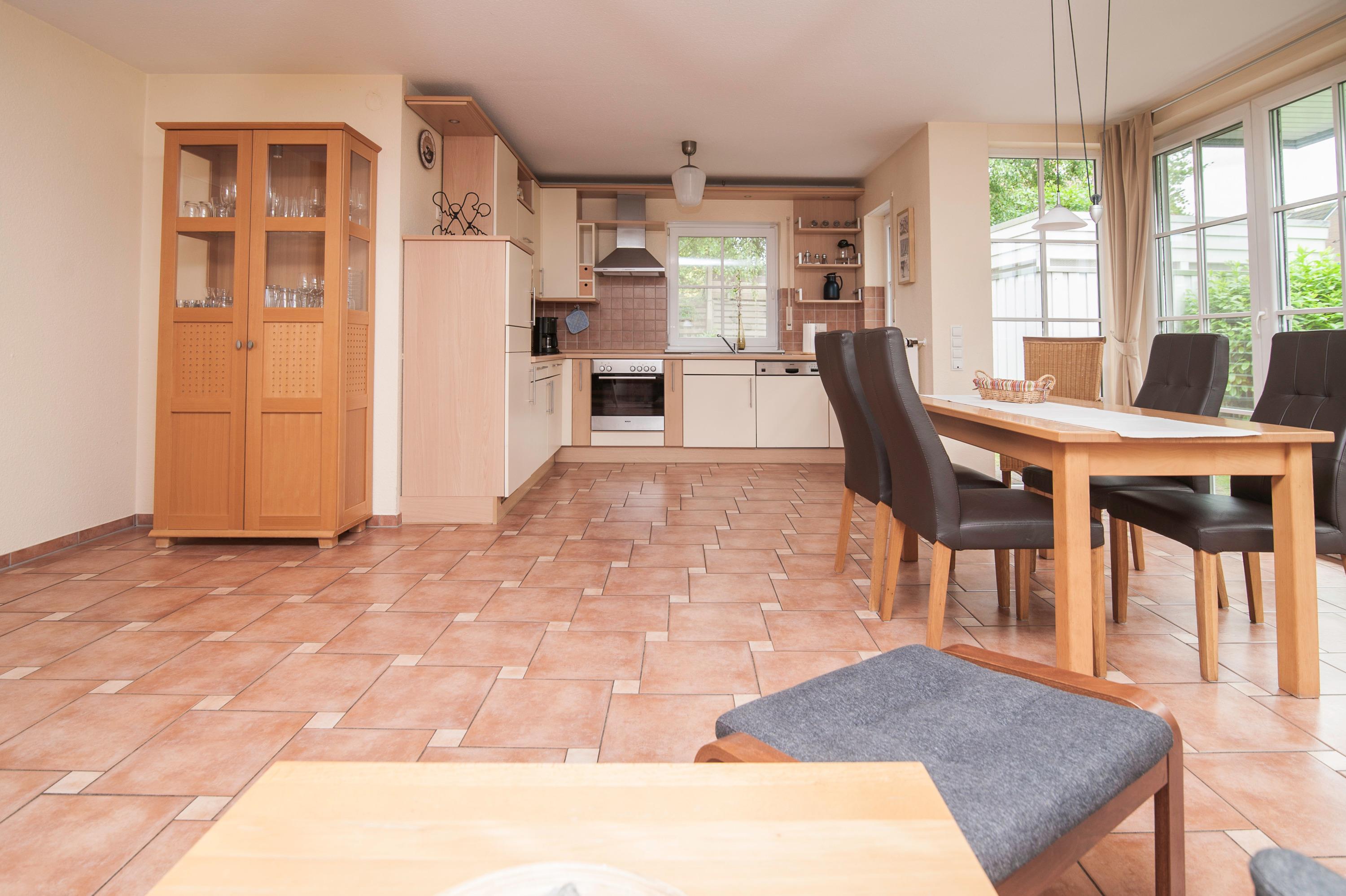 Die Wohnung verfügt über einen hellen Wohnraum, ausgestattet mit einem 43" Metz UHD LED-TV, einer Stereoanlage und einem WLAN-Gastzugang über Glasfaseranschluss. Der Essbereich führt zur großzügigen Terrasse, die mit passenden Möbeln ausgestattet ist. Die Einbauküche ist komplett eingerichtet mit Geschirrspüler, Kühlschrank, separatem Gefrierschrank, Mikrowelle, Herd und Dunstabzugshaube.