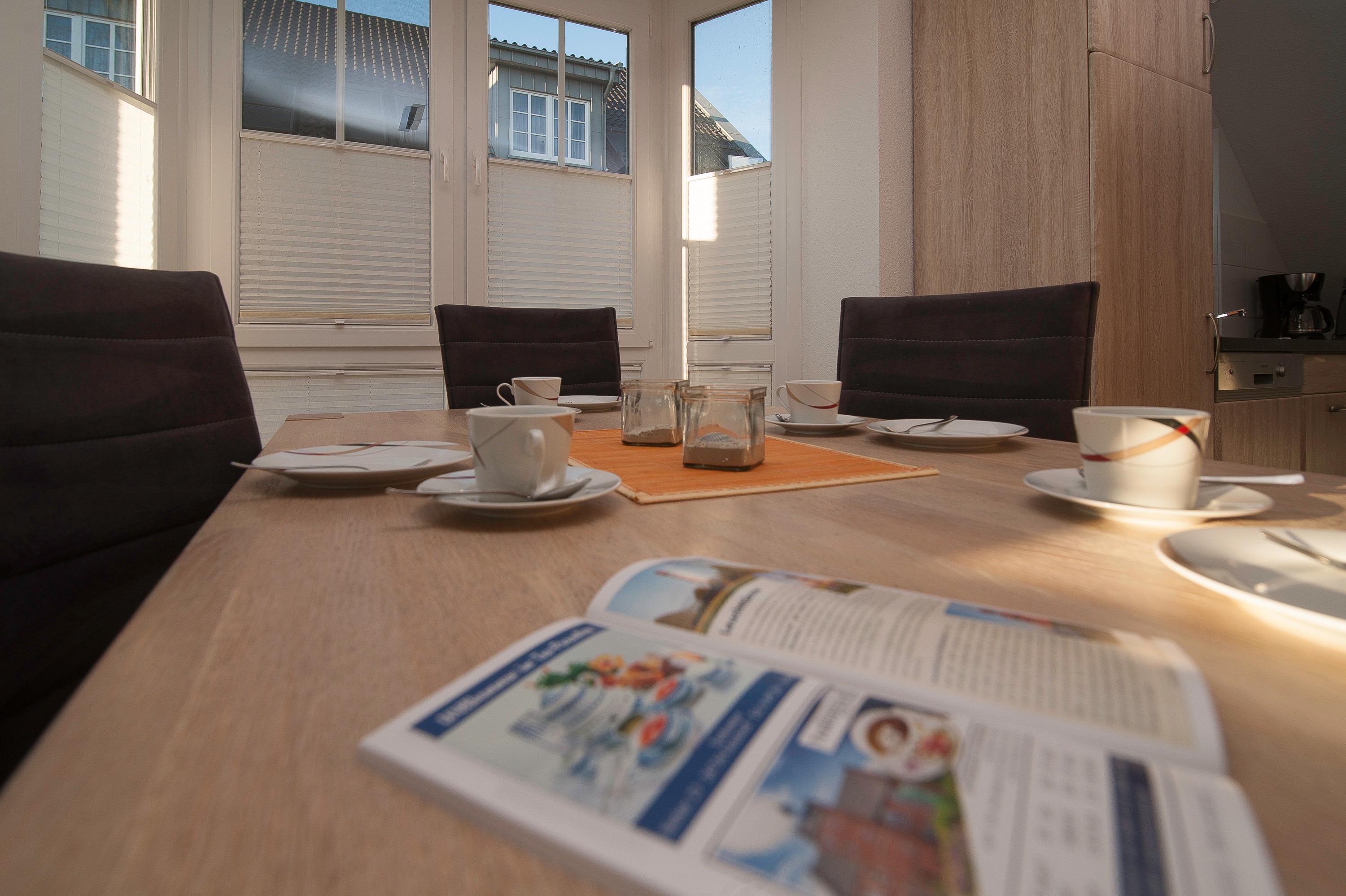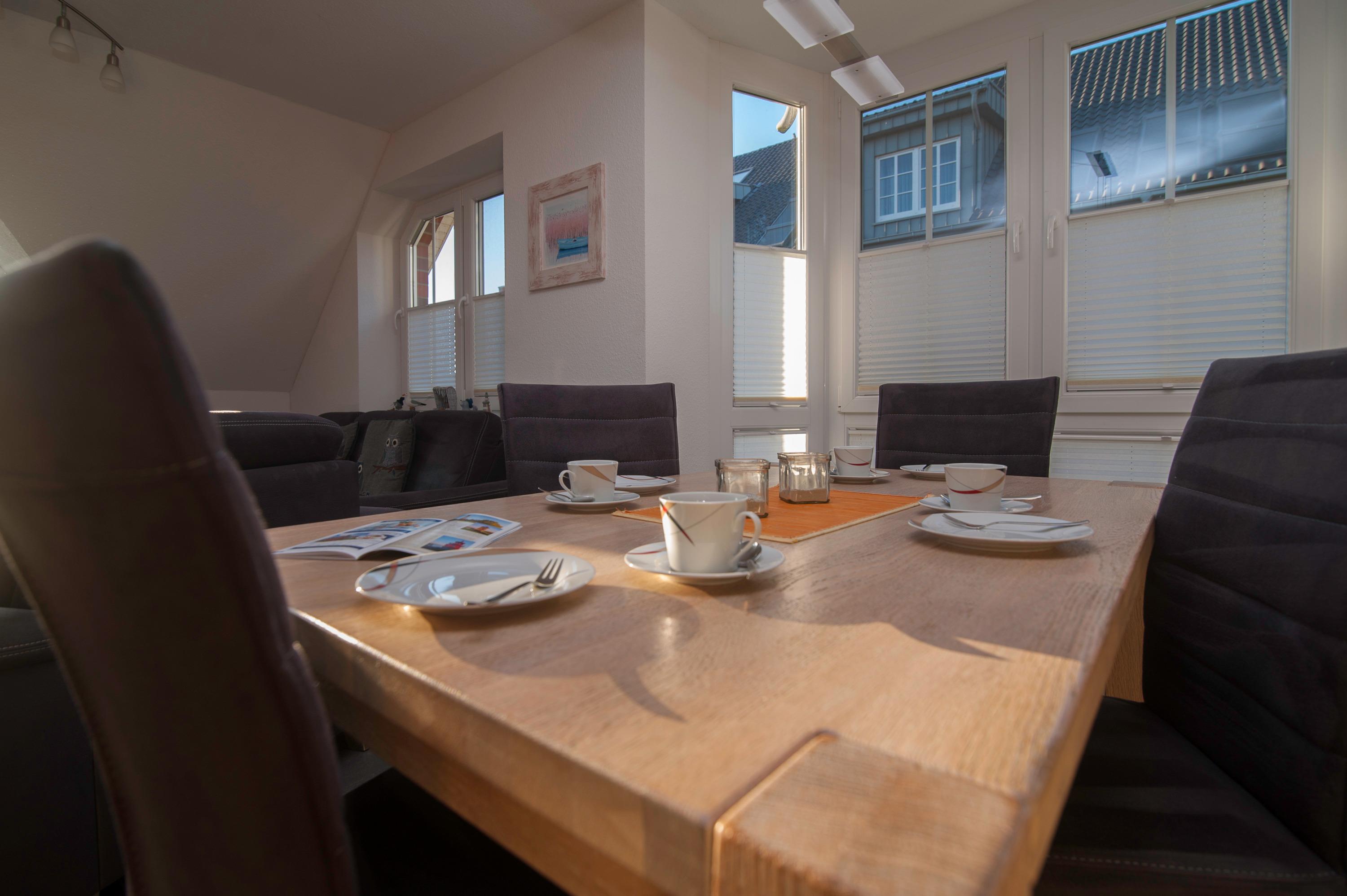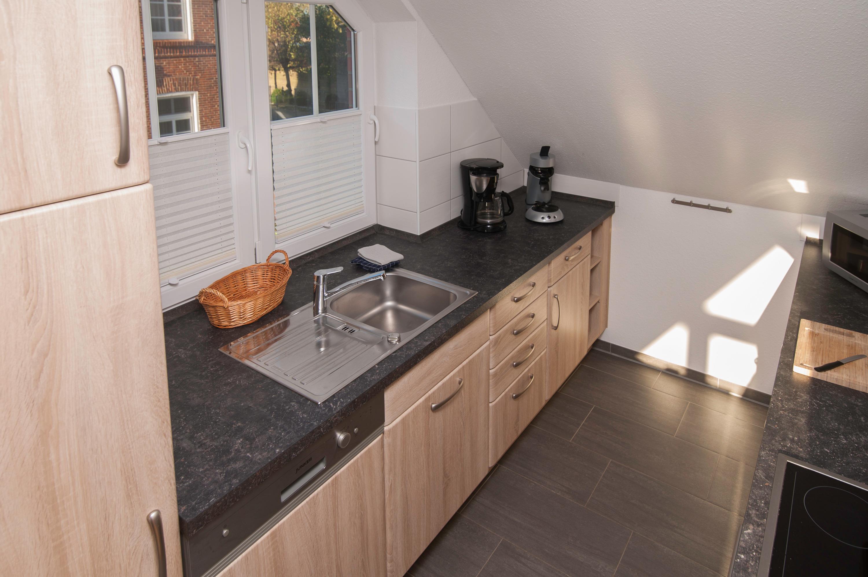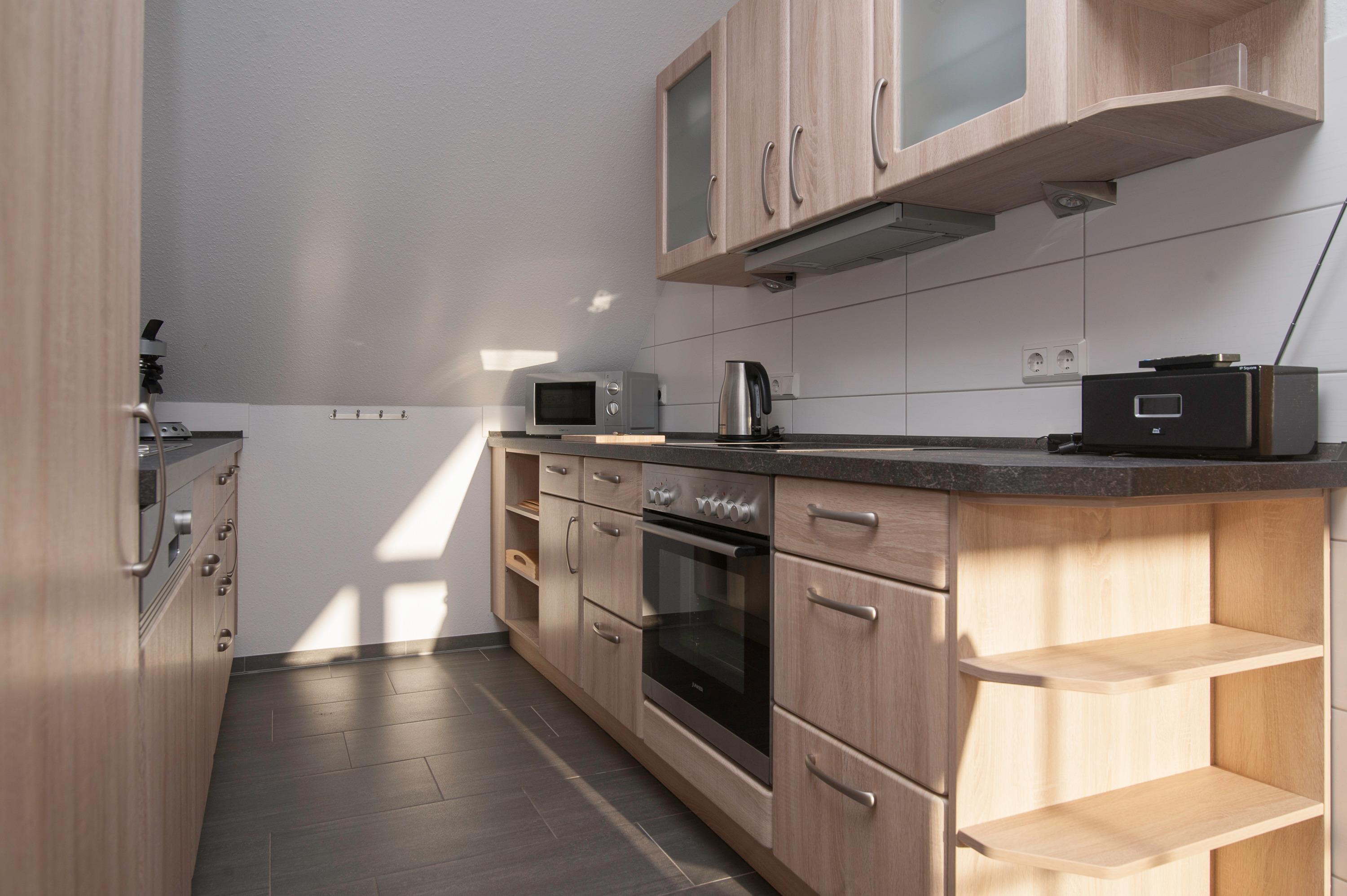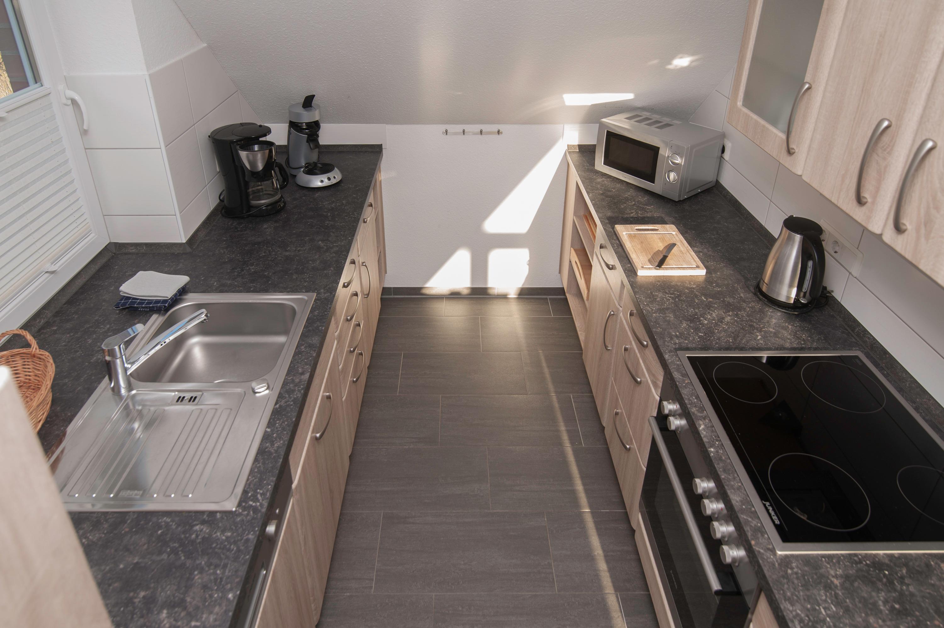 Sie verfügt über einen offenen Wohn- und Essbereich sowie eine voll ausgestattete Einbauküche mit Herd, Cerankochfeld, Mikrowelle, Geschirrspüler, Handmixer, Filterkaffeemaschine, Senseo Pad-Maschine, Kühlschrank mit Gefrierfach, Wasserkocher, Eierkocher und weiteren Küchenutensilien.