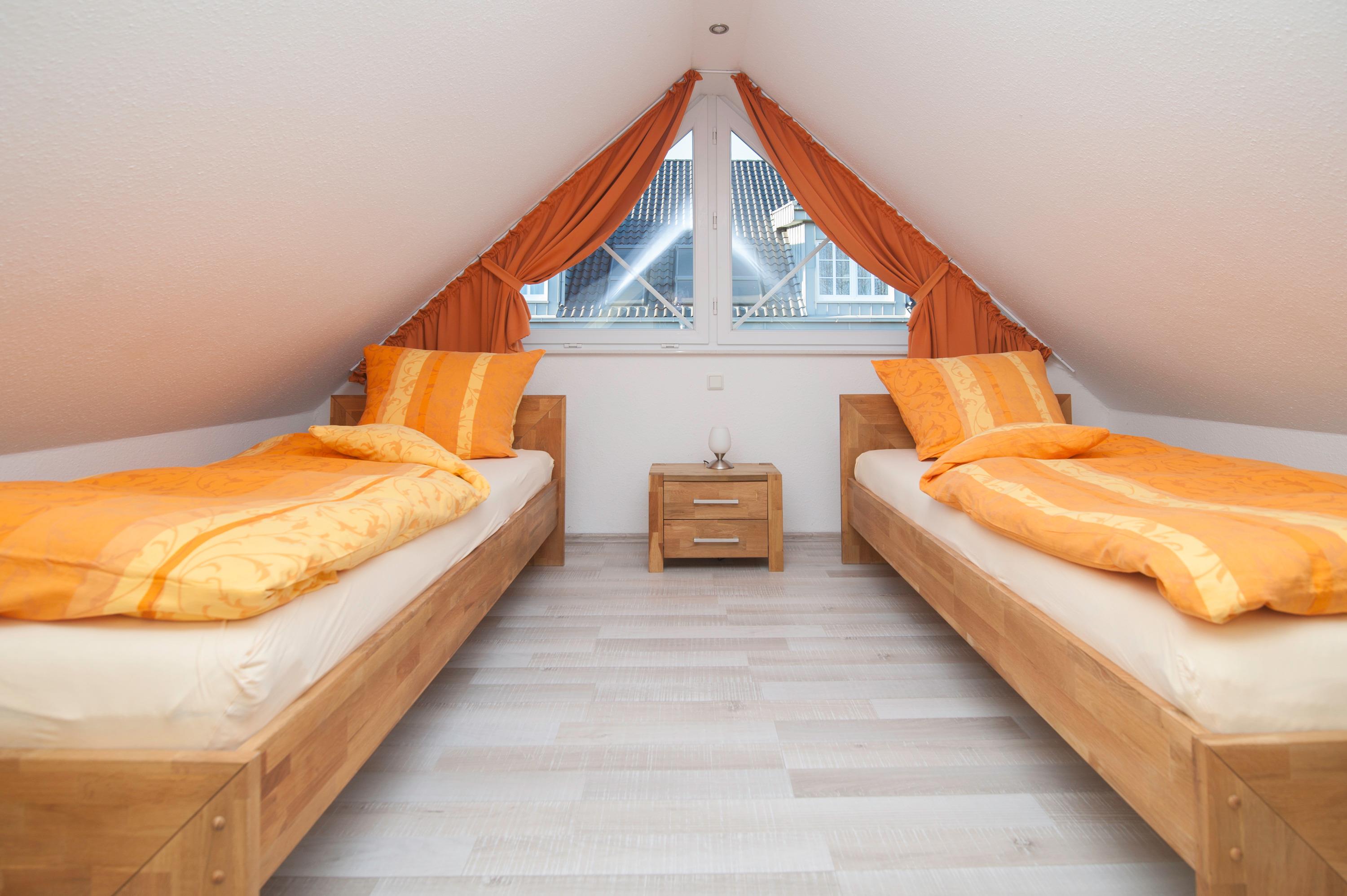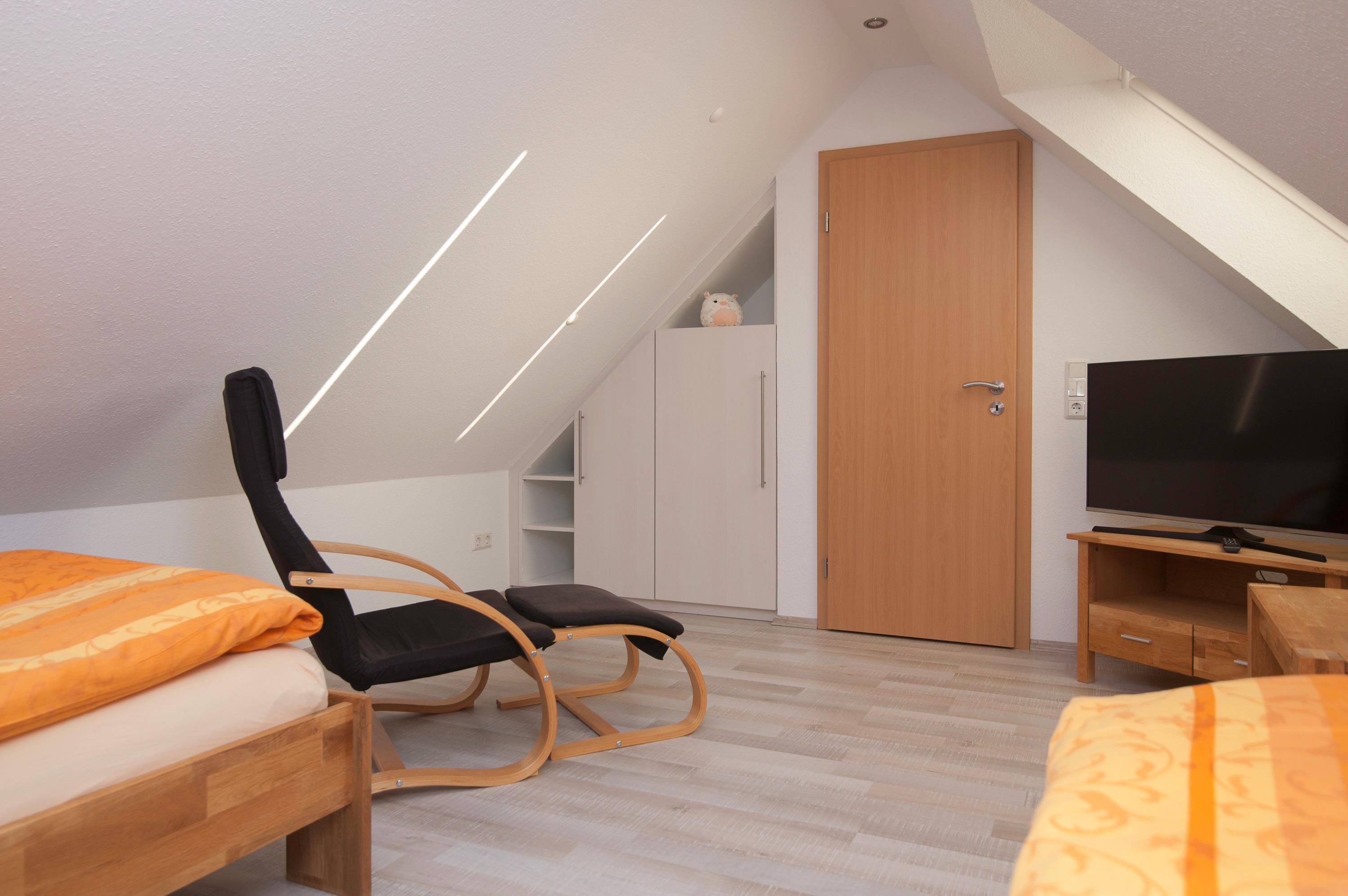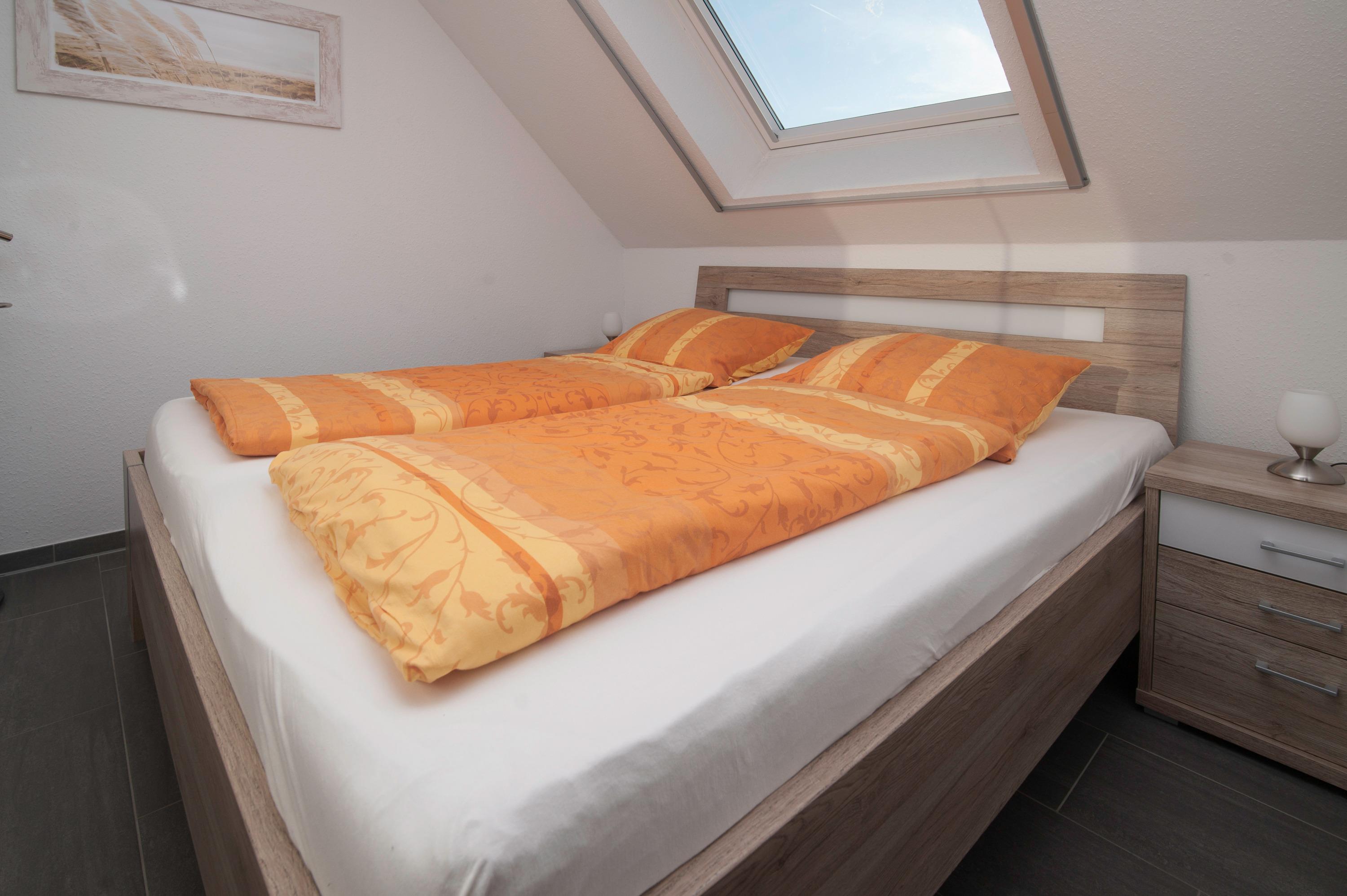 Die Wohnung verfügt über ein Schlafzimmer mit einem Doppelbett (2 x 90 x 200 cm) und großem Kleiderschrank sowie ein weiteres Schlafzimmer im großzügigen Studio unter dem Dach mit 2 Einzelbetten (90 x 200 cm) und einem 40 Zoll Flachbild-TV.