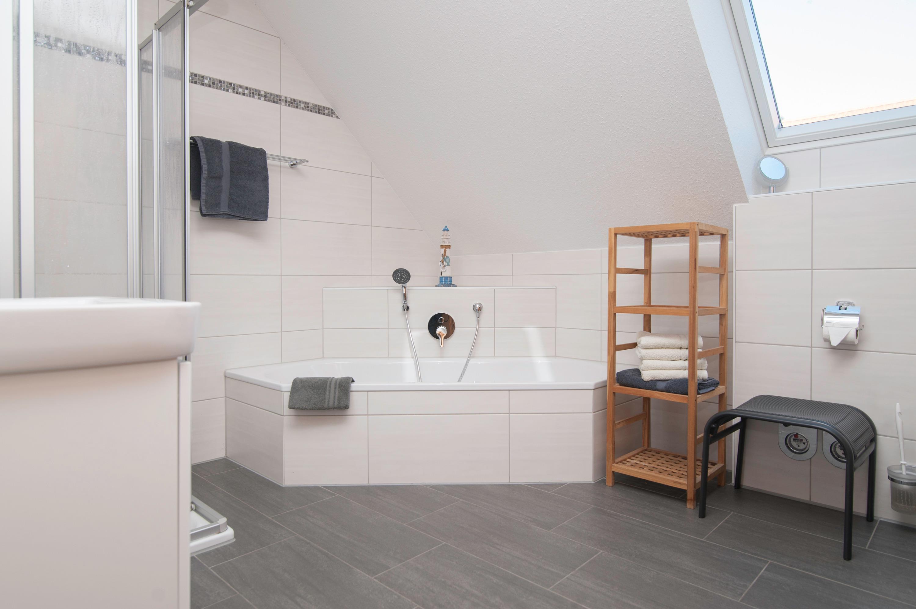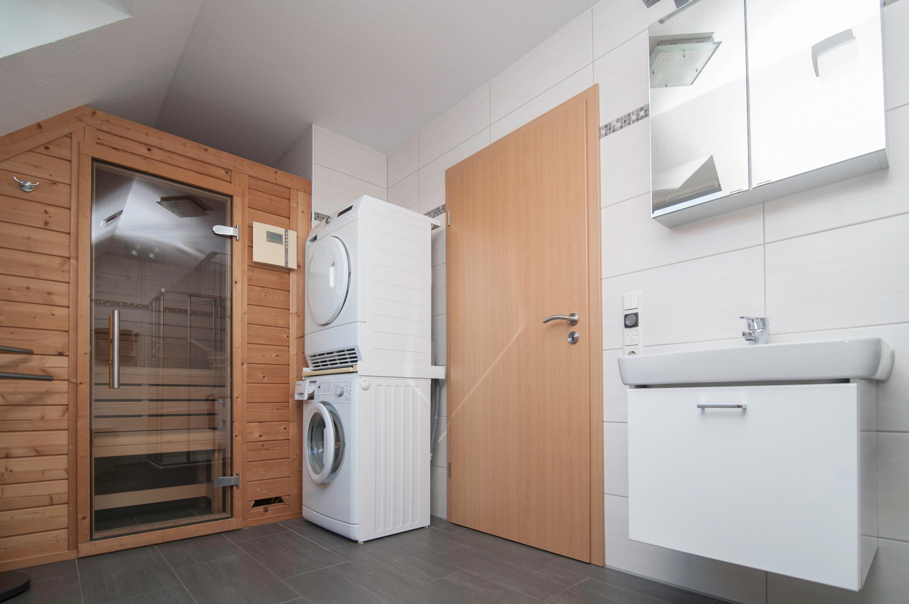 Das geräumige Badezimmer bietet eine Dusche mit niedrigem Einstieg, eine Badewanne, einen Föhn, ein WC und eine Sauna. Zudem befinden sich dort eine Waschmaschine (6 kg) und ein Kondenstrockner (7 kg).