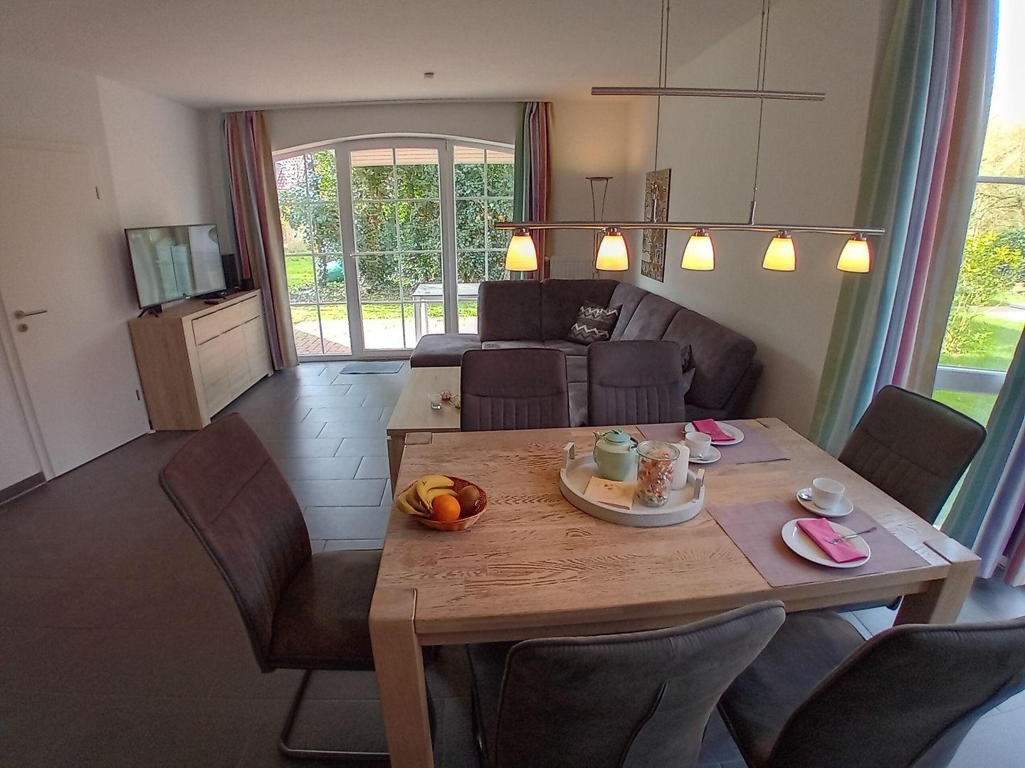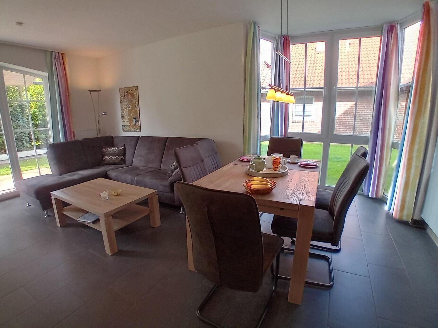Ein großzügiger Wohn- Essbereich mit schöner, reichhaltig ausgestatteter Küche, z. B. Backofen, Mikrowelle, Geschirrspülmaschine, Kühlschrank mit Gefrierfach, Kaffeemaschine, Wasserkocher, Toaster, Mixer u.v.m., steht Ihnen zur Verfügung, ebenso eine gemütliche Sitzecke mit LCD-TV , Radio und CD.