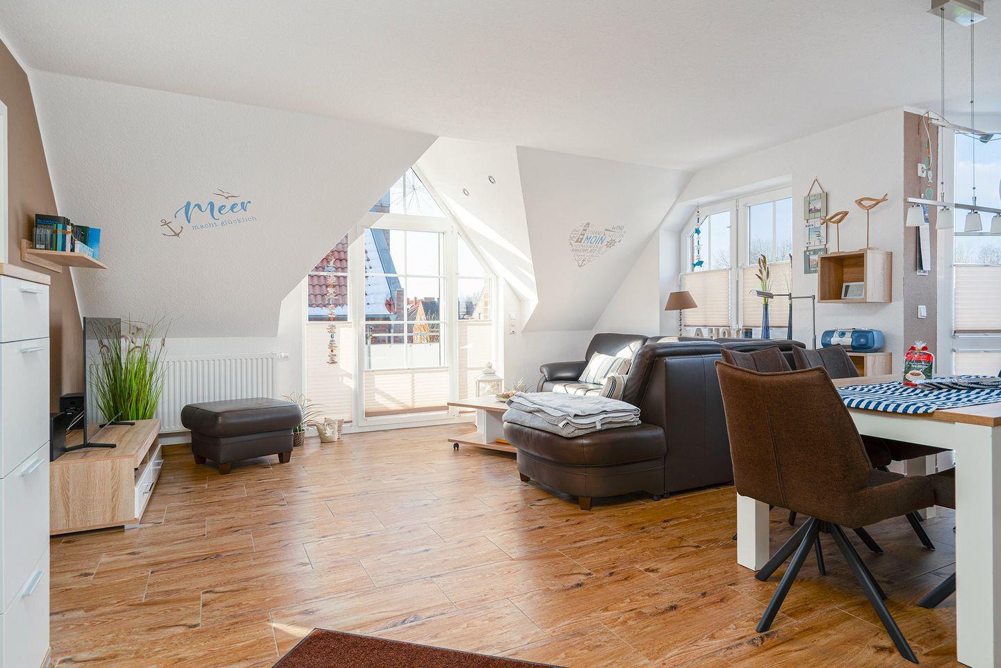 Im lichtdurchfluteten Wohn-Essbereich erwartet Sie jeglicher Komfort. Bequeme Sitzgruppe, SAT-TV(CI-Modul vorhanden), Musikanlage.