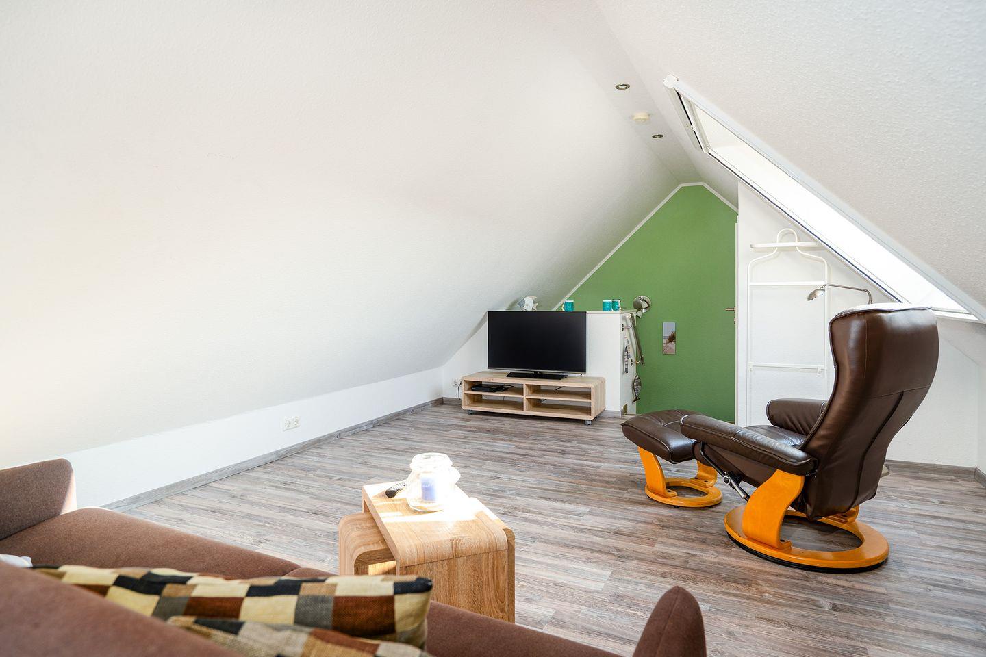 Im offenen, ausgebautem Dachstudio befindet sich eine gemütliche Ruhezone. Der Raum lädt zum Verweilen ein. Auch hier befindet sich ein weiterer Fernseher. Die (Schlaf-)Couch kann als weitere Schlafmöglichkeit (Liegefläche 2 m x 1,40 m) genutzt werden.