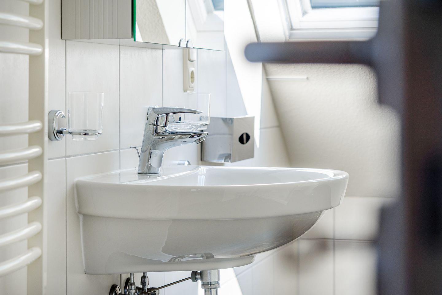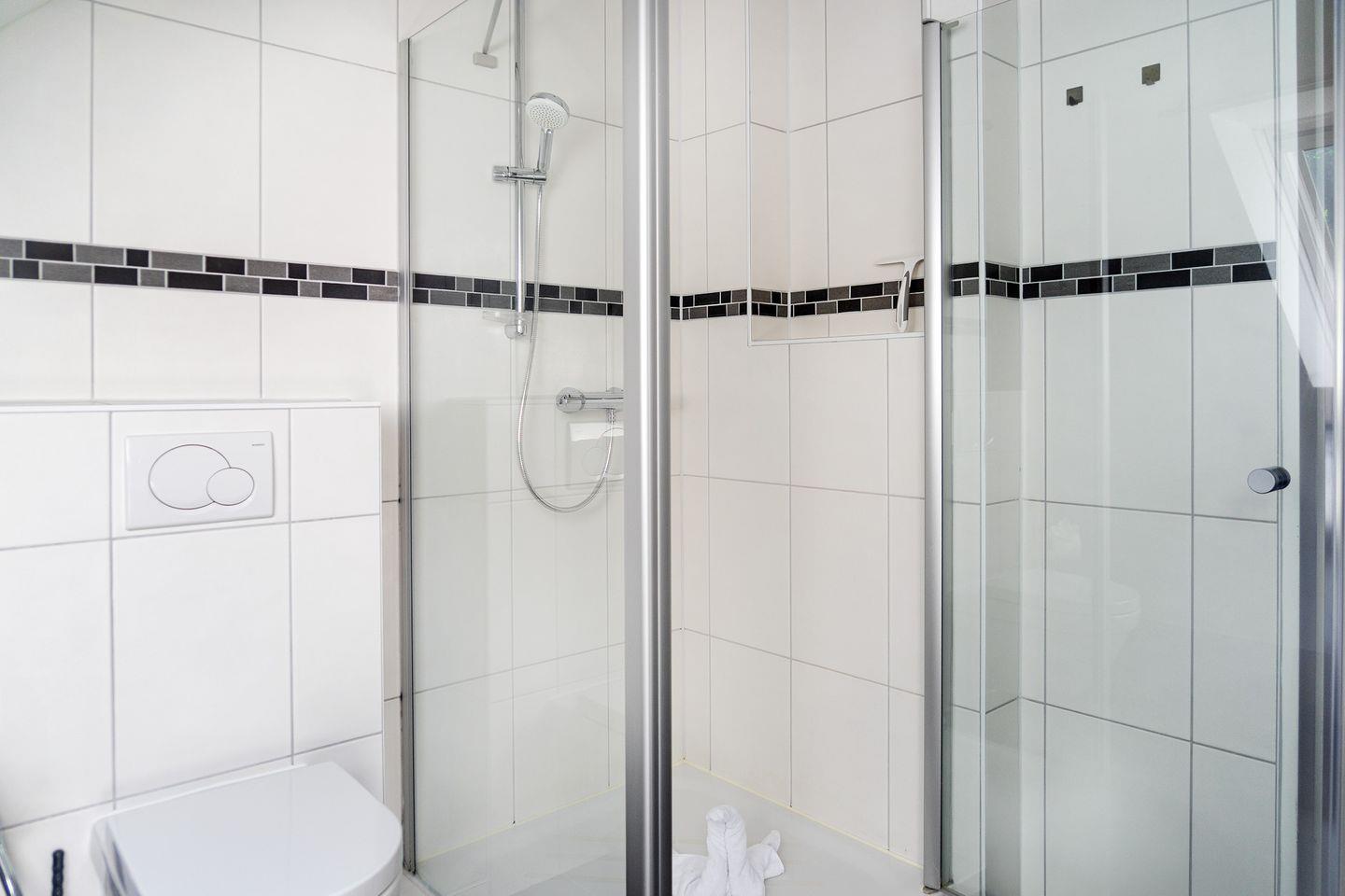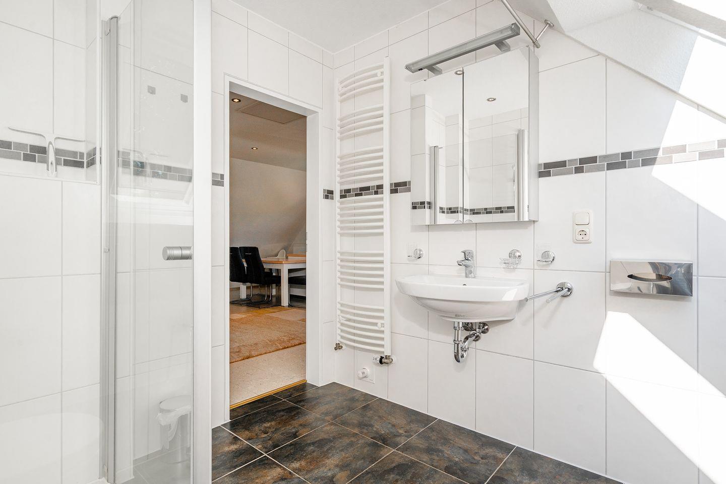 Modernes Bad mit Dusche (niedriger Einstieg), WC und Handtuchtrockner. Dort gibt es eine Fußbodenerwärmung. Ein Föhn ist ebenfalls vorhanden.