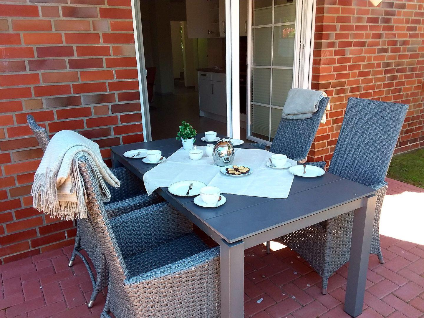 Die Nichtraucherwohnung verfügt über einen schicken Wohn-/Essbereich mit einem Flachbildfernseher. Die hochwertige Küche ist reichhaltig ausgestattet mit Backofen, Mikrowelle, Kühlschrank mit Gefrierfach, Geschirrspülmaschine, Kaffeemaschine, Eierkocher, Wasserkocher, Toaster, u.v.m. Für Gäste, die die ostfriesische Gemütlichkeit mit einer Tasse Tee genießen möchten, steht ein komplettes Teeservice bereit.