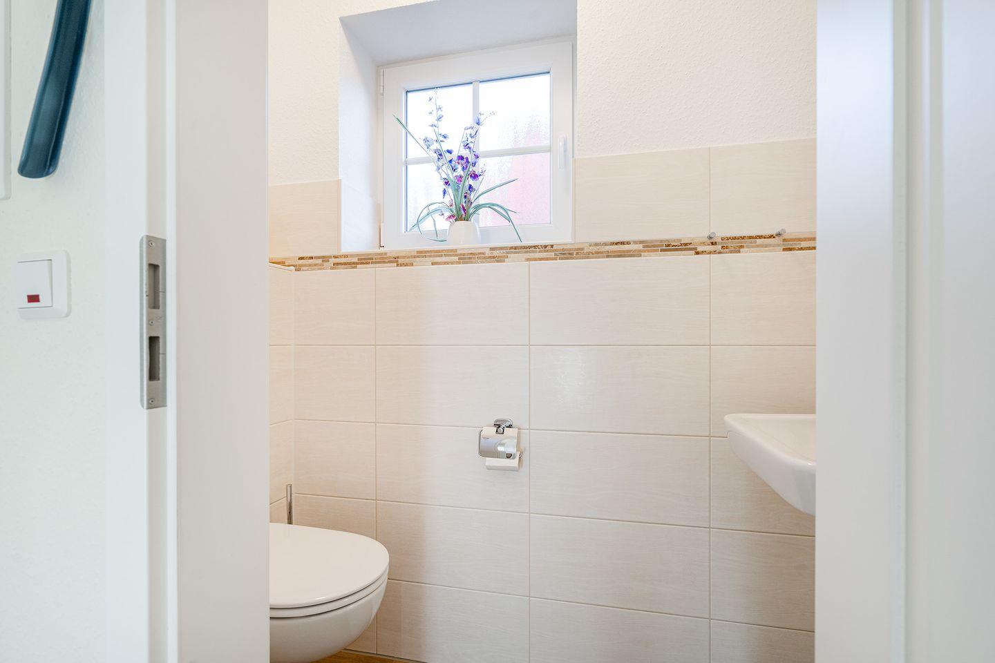 Ein schönes komfortables Bad (Dusche mit flachem Einstieg) mit Handtuchheizkörper und Fön sorgt für Ihr Wohlbefinden. Praktisch ist das zusätzl. Gäste-WC. Waschmaschine, Trockner, Wäscheständer, Bügeleisen und -brett sind ebenfalls vorhanden.