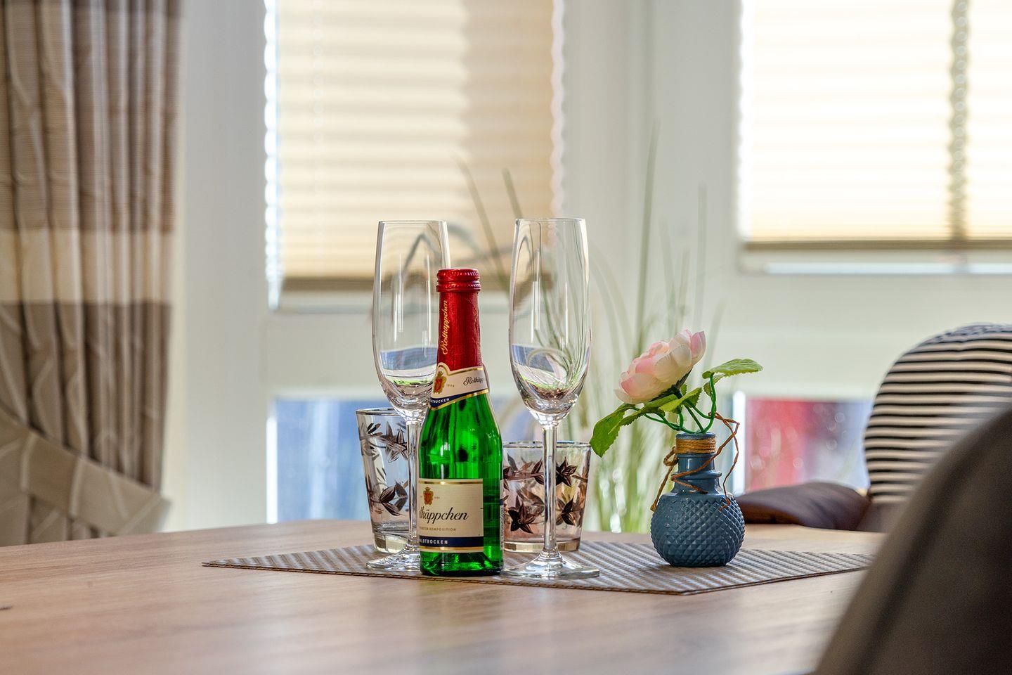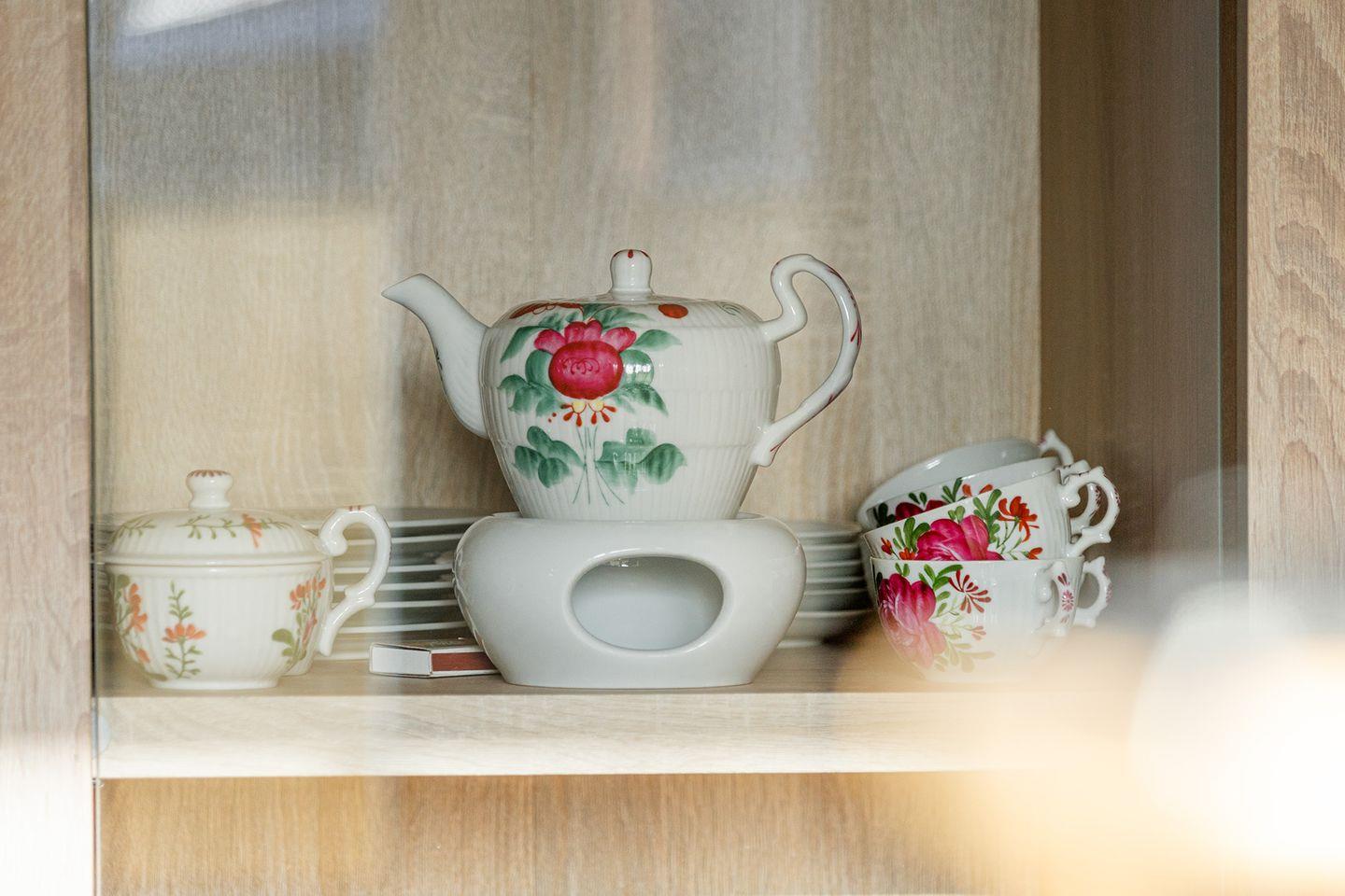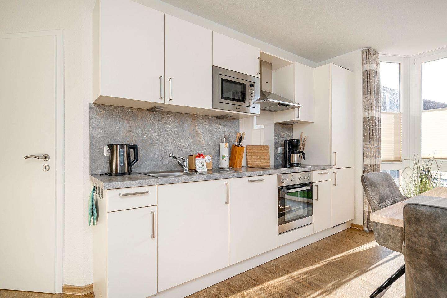 Der großzügige Wohn-Essbereich mit schönem Erker (mit Sichtschutz-Plissees und Vorhänge) lässt keine Wünsche offen: Die hochwertige Küche verfügt über Backofen, Mikrowelle, Kühl-/Gefrierkombination, Geschirrspülmaschine, Kaffeemaschine + Senseo, Eierkocher, Wasserkocher, Toaster, Mixer, u.v.m. Für Gäste, die die ostfriesische Gemütlichkeit mit einer Tasse Tee genießen möchten, steht ein komplettes Teeservice bereit.