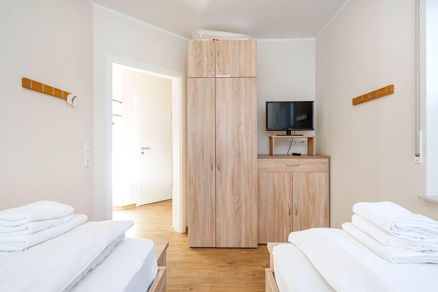 Es gibt 2 Schlafräume (1 x Doppelbett + 2 x Einzelbetten) mit Kleiderschrank und weiteren TV.