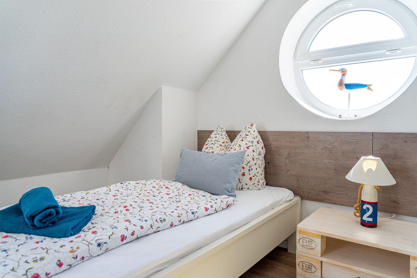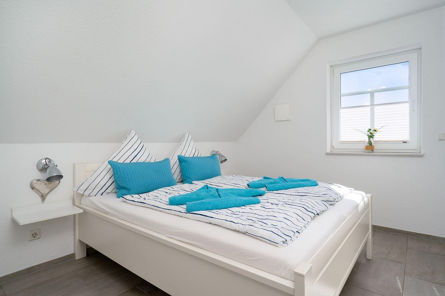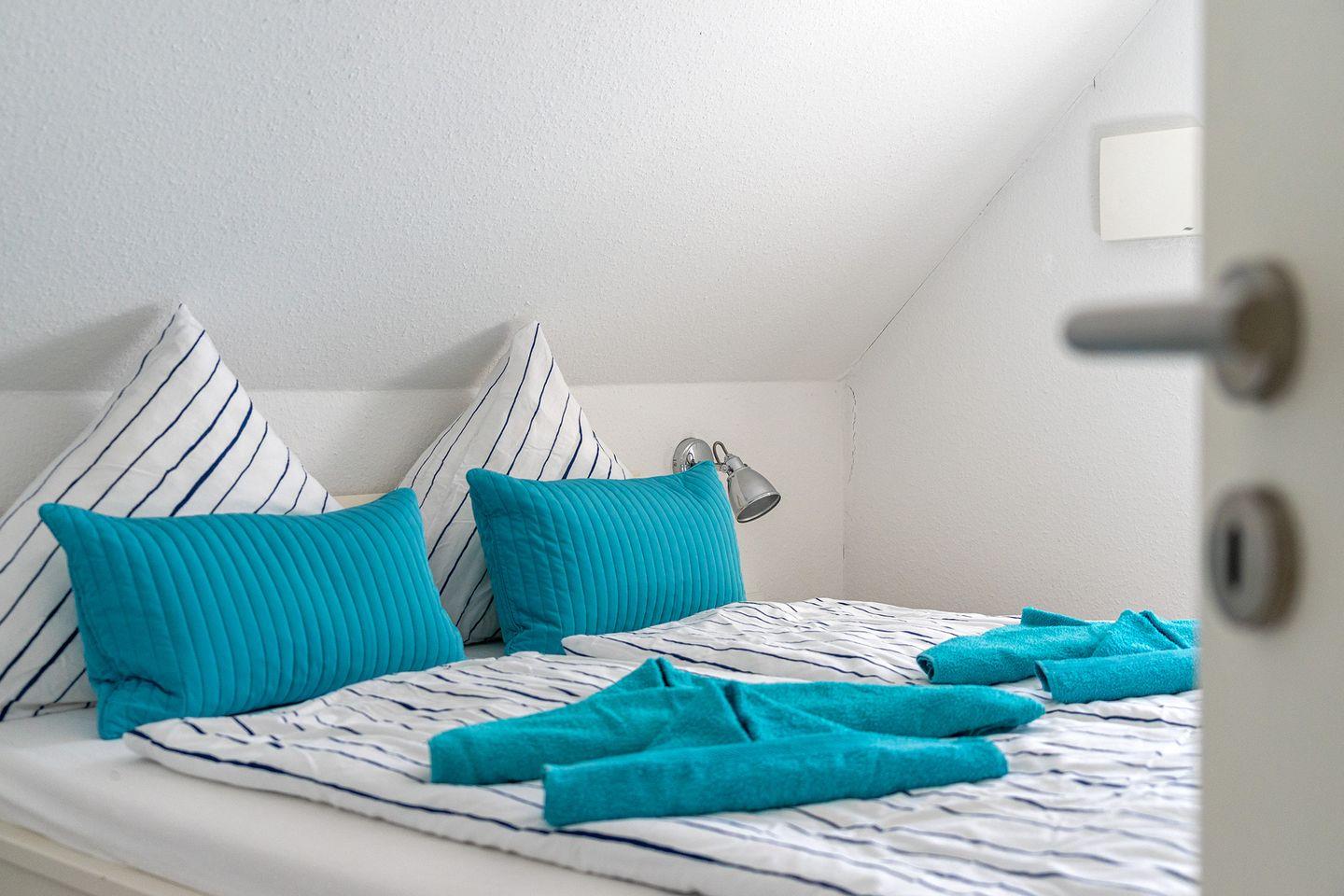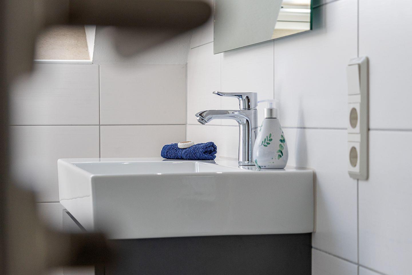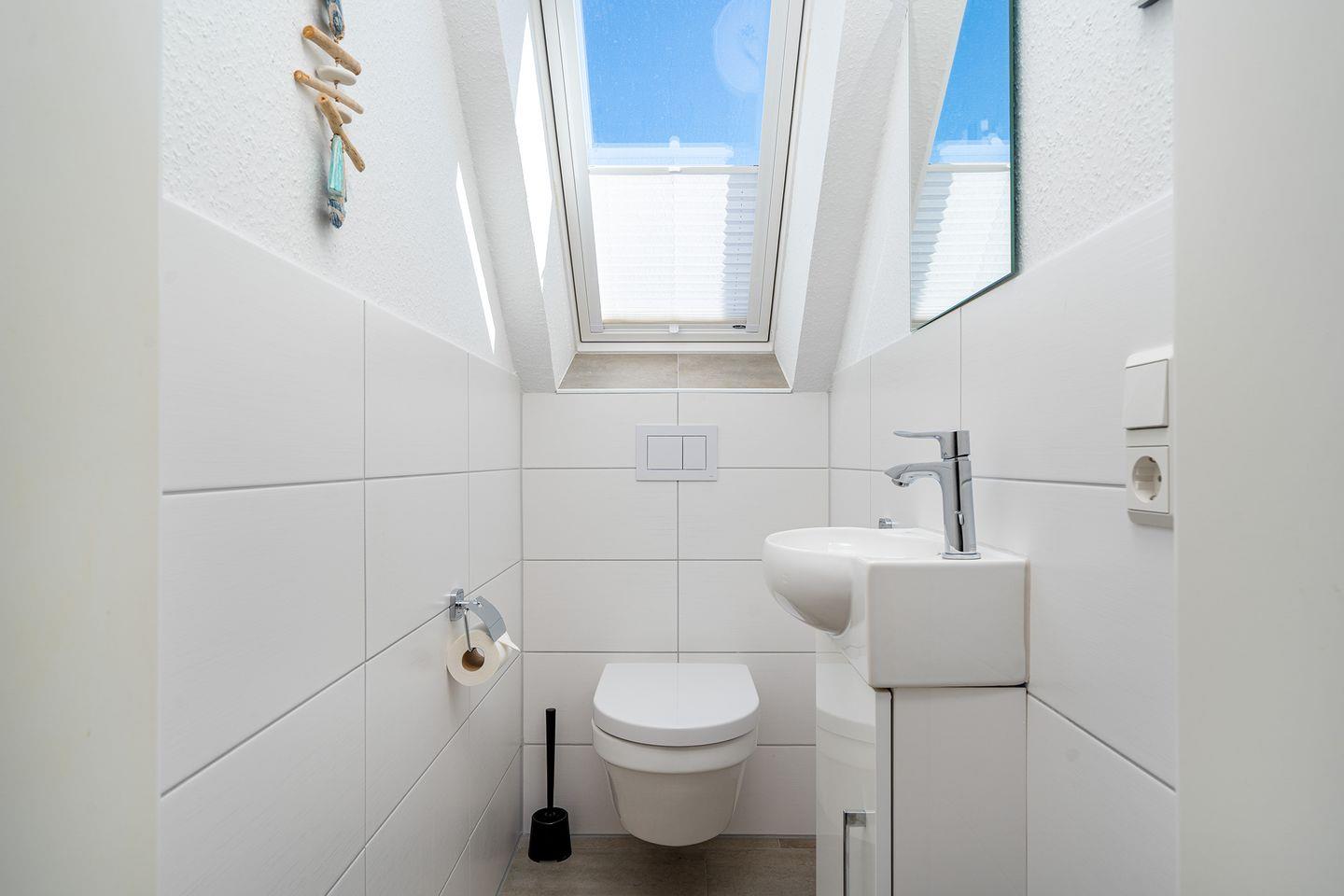 2 Schlafräume, 1 x Doppelbett 1,60 m x 2,00 m und 1 x im Dachstudio 2 Einzelbetten 0,90 m x 2,00 m. Im Dachstudio befindet sich ein weiterer Fernseher und Sitzmöglichkeiten. Ganz neu ab Ende Februar 2024 steht dort auch ein Schreibtisch zur Verfügung, sodass nun auch eine bequeme Homeoffice-Möglichkeit besteht. Das Dusch-Bad (Regenwalddusche) mit WC. Ein Fön ist ebenfalls vorhanden. Außerdem gehört ein Gäste-WC zur gehobenen Ausstattung.