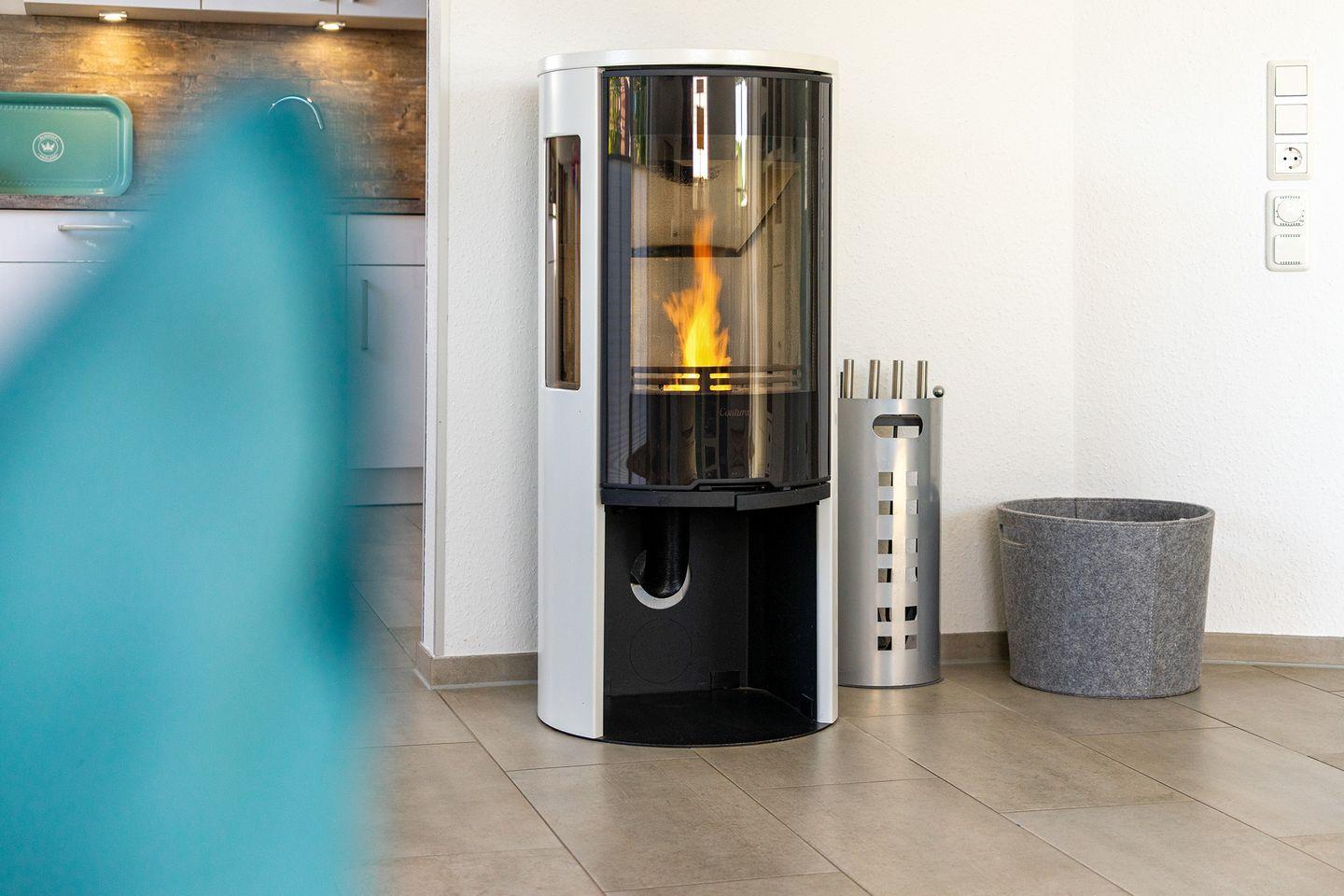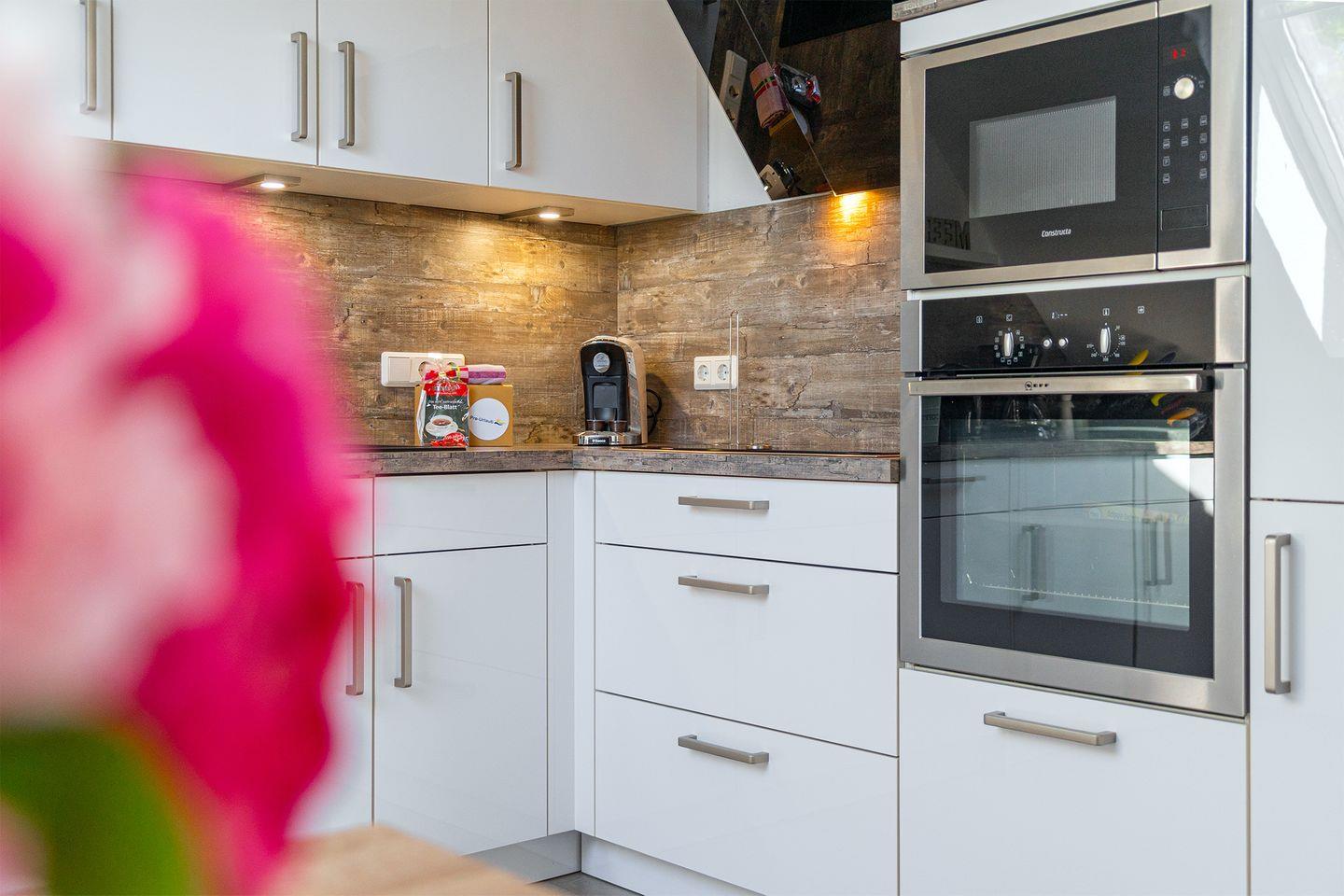 Großer lichtdurchfluteter Wohn-/Essbereich mit schicker voll ausgestatteter Küche z. B. Mikrowelle, Backofen, Spülmaschine, Induktionsherd, Kühlschrank mit Gefrierfach, Kaffeemaschine, Saeco-Automat (Tchibo), Toaster, Wasserkocher, Waschmaschine u.v.m. Ein Kaminofen sorgt für behagliche Stunden in der kälteren Jahreszeit.