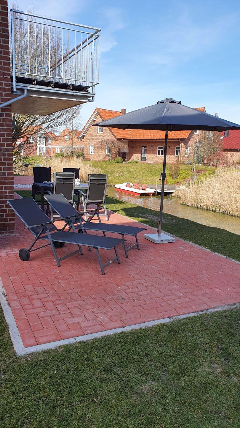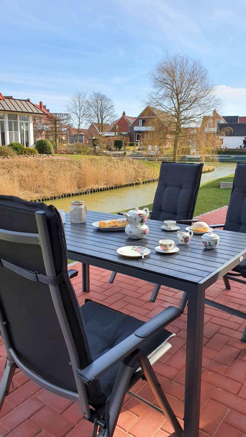 Eine große Terrasse mit Sitzgruppe plus zwei Sonnenliegen und ein Gartengrundstück direkt am Siel stehen Ihnen uneingeschränkt zur Verfügung.