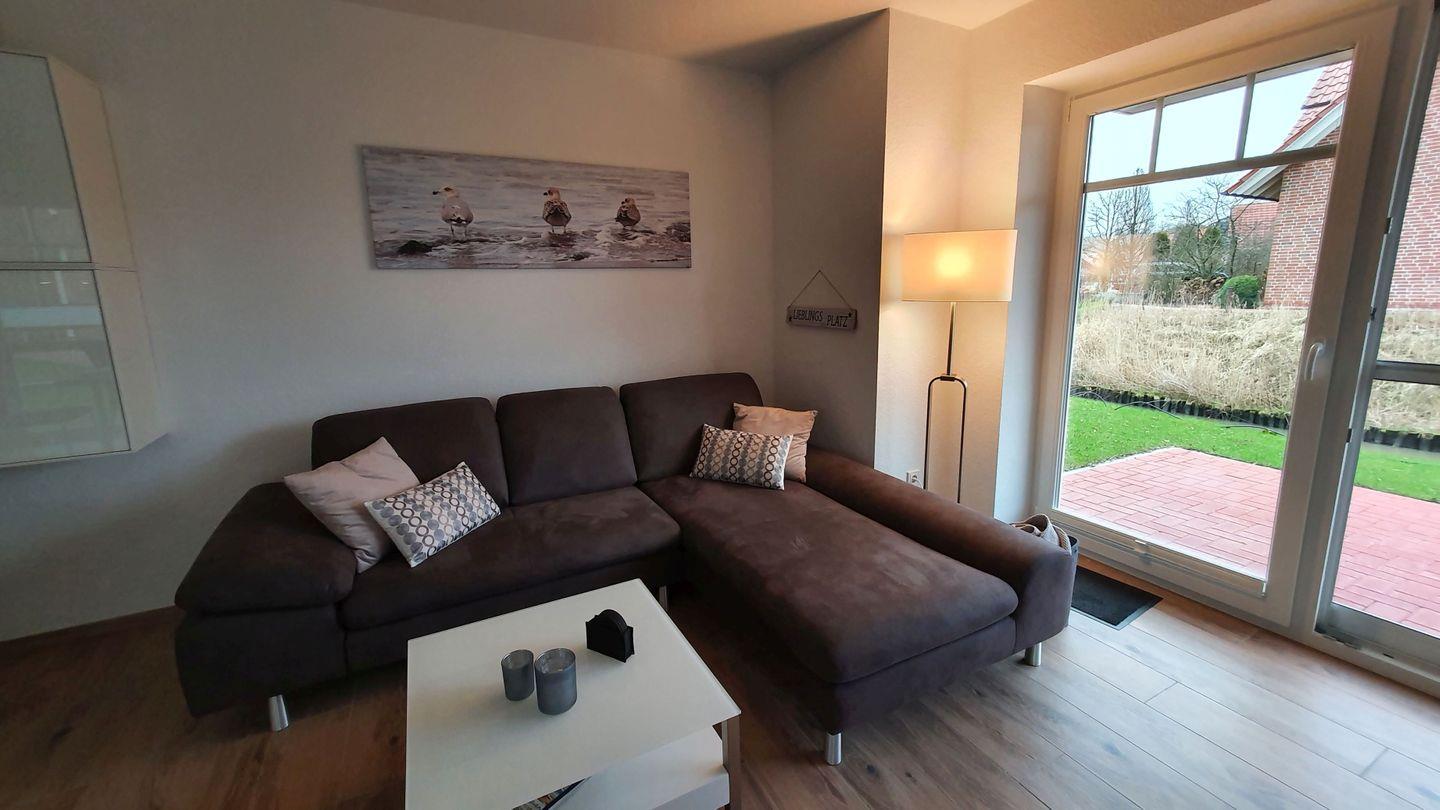 Im Wohnbereich finden Sie ein großes, bequemes Sofa mit Longchair, das zum Entspannen einlädt.