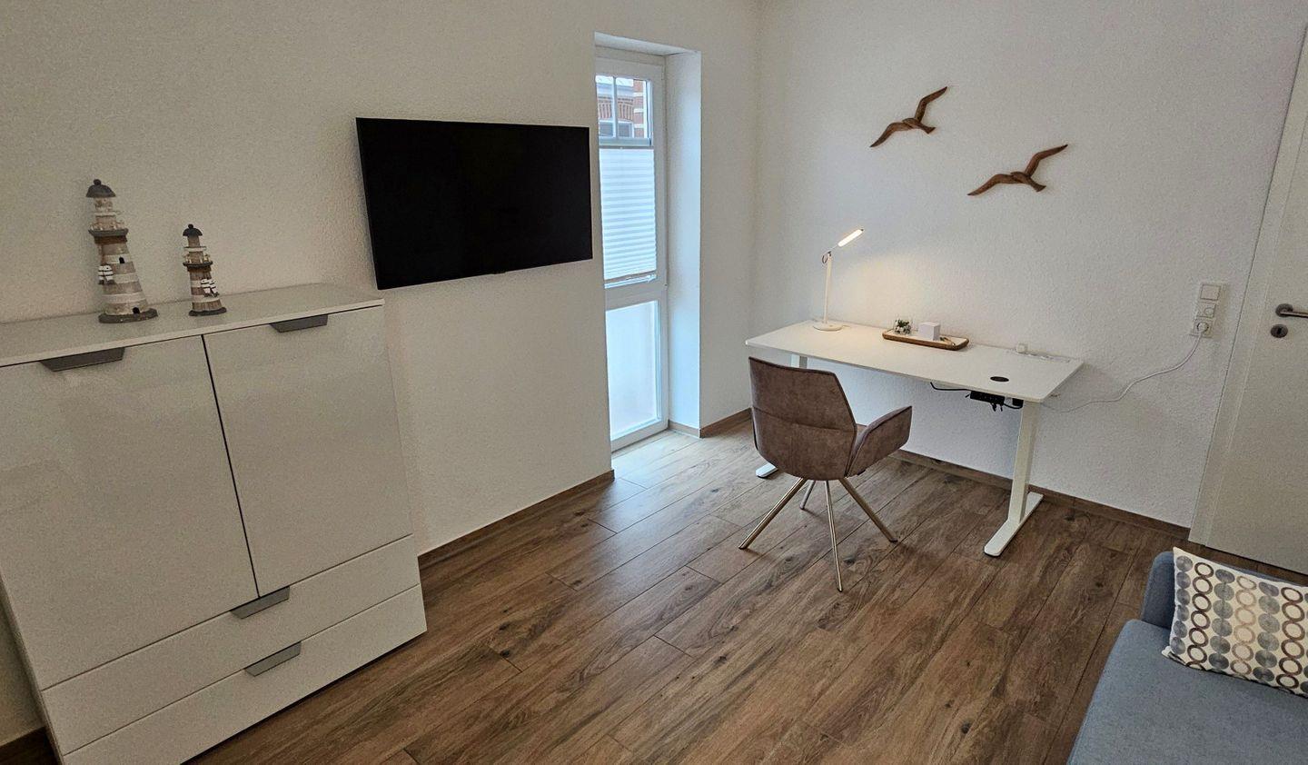 Sie finden dort u. a. einen Schreibtisch mit Bürostuhl und Leseleuchte, ein bequemes Sofa, eine Standleuchte, einen 43 Zoll Smart-TV, eine Yogamatte + Yogakissen sowie ein Sideboard zur Aufbewahrung diverser Utensilien.