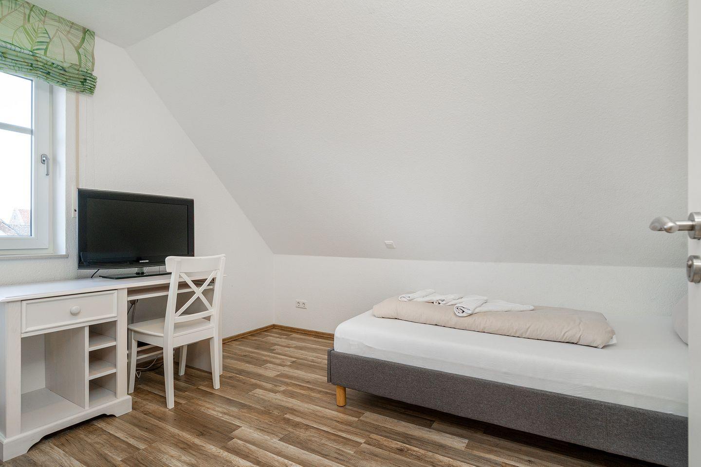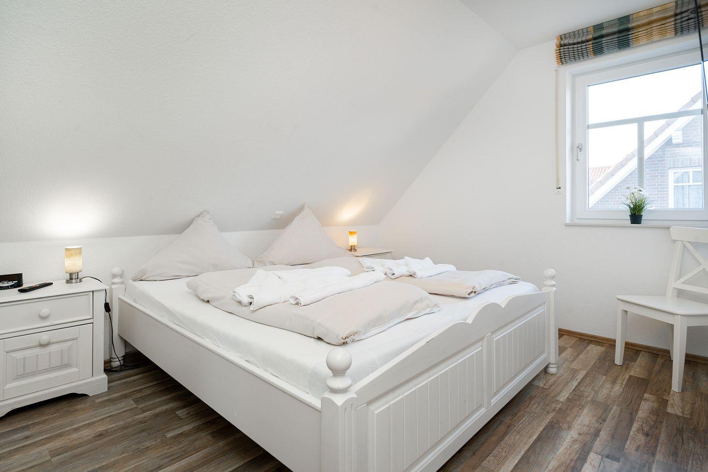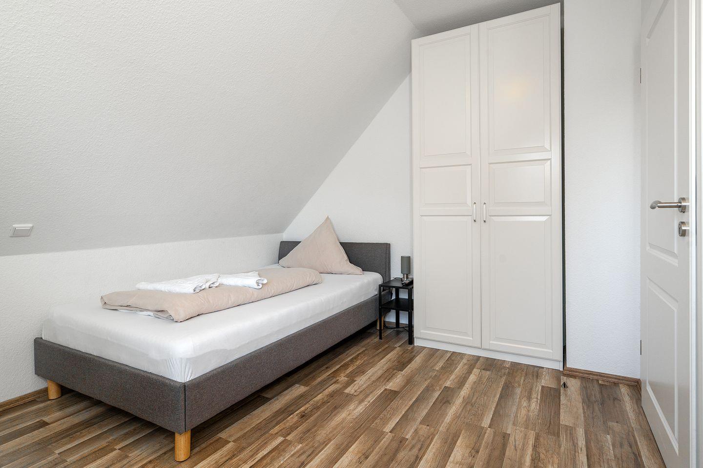 Im Obergeschoss befinden sich 2 Schlafzimmer, jeweils mit Doppelbett und Kleiderschrank eingerichtet, in einem der Schlafzimmer ist auch ein Fernseher angebracht. Das 3. Schlafzimmer bietet Ihnen ein 1,20m breites Bett für die 5. und ggfs. 6. Person, einen Schreibtisch mit Fernseher und DVD-Player und einen Schrank. Zum Februar 2024 wurden für alle Betten neue Wendematratzen (weich/hart) angeschafft. Das Duschbad im OG ist ebenfalls mit einem Fenster zum Lüften ausgestattet.