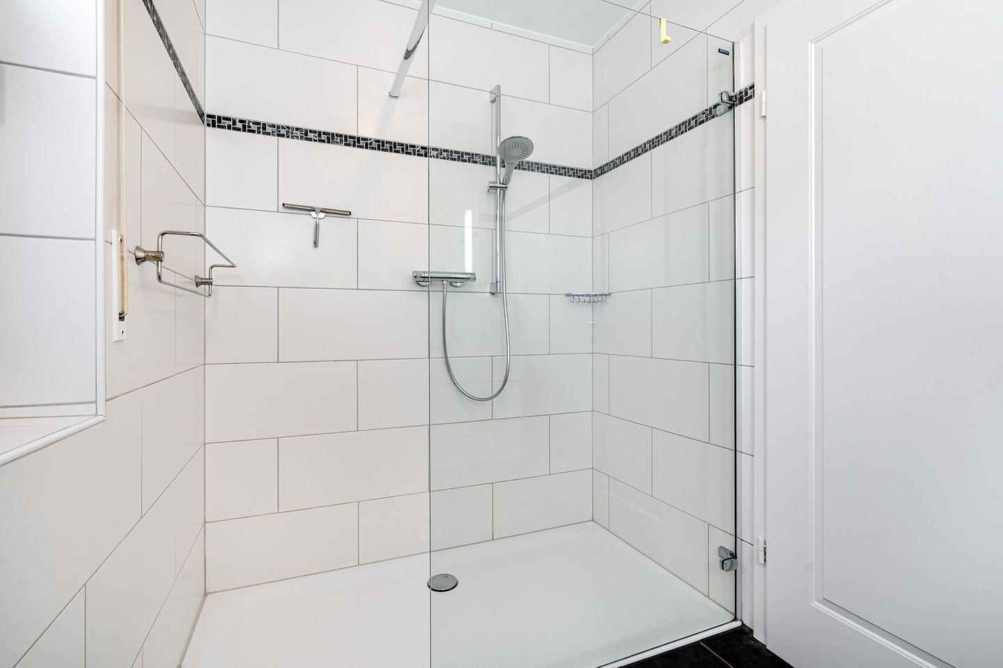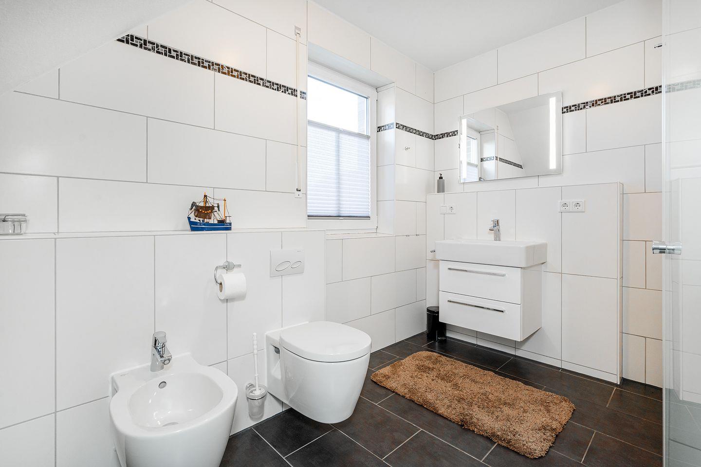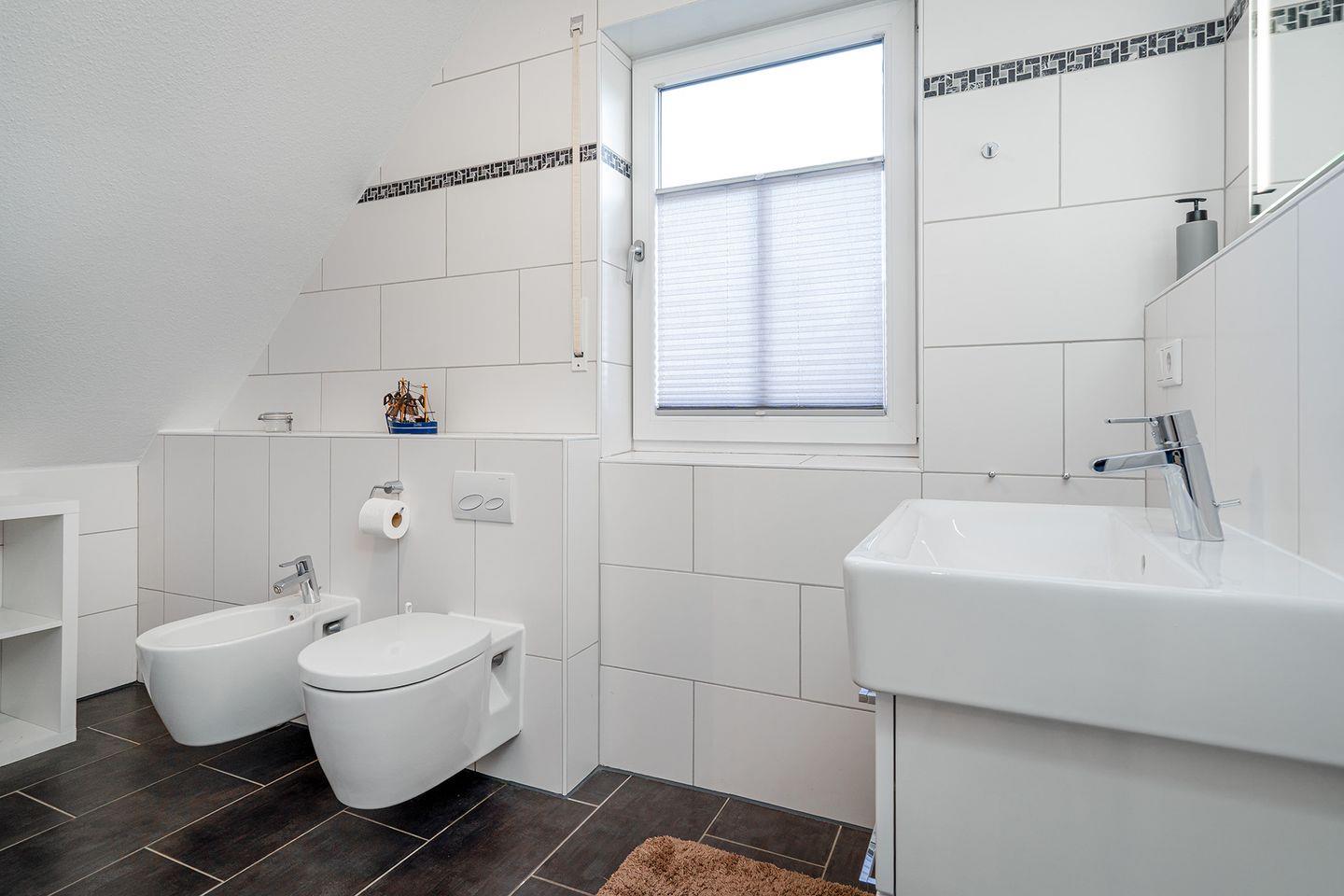 Im Obergeschoss befinden sich 2 Schlafzimmer, jeweils mit Doppelbett und Kleiderschrank eingerichtet, in einem der Schlafzimmer ist auch ein Fernseher angebracht. Das 3. Schlafzimmer bietet Ihnen ein 1,20m breites Bett für die 5. und ggfs. 6. Person, einen Schreibtisch mit Fernseher und DVD-Player und einen Schrank. Zum Februar 2024 wurden für alle Betten neue Wendematratzen (weich/hart) angeschafft. Das Duschbad im OG ist ebenfalls mit einem Fenster zum Lüften ausgestattet.