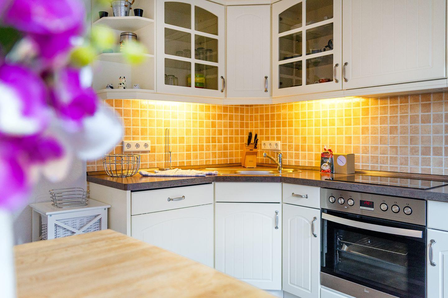 Im Erdgeschoss finden Sie eine großzügige komplett eingerichtete Küche mit allem was das Herz begehrt, wie Geschirrspülmaschine, Kühlschrank mit Gefrierfach, Kaffeemaschine, Toaster, Wasserkocher und Eierkocher. Der Wohn- und Essbereich ist gemütlich eingerichtet mit einem massiven Esstisch aus Pinienholz mit 4 Stühlen und 2 Hockern, einer Eckcouch mit ebenfalls massivem Tisch und einer Fernsehgarnitur mit DVD/Blu-ray-Player und Radio. Ganz neu finden Sie dort nun auch einen Kaminofen für die ungemütlichen Tage im Jahr. Das Duschbad ist modern und neuwertig ausgestattet und hat ein Fenster zum Lüften. Im Abstellraum finden Sie eine Waschmaschine und einen Trockner.