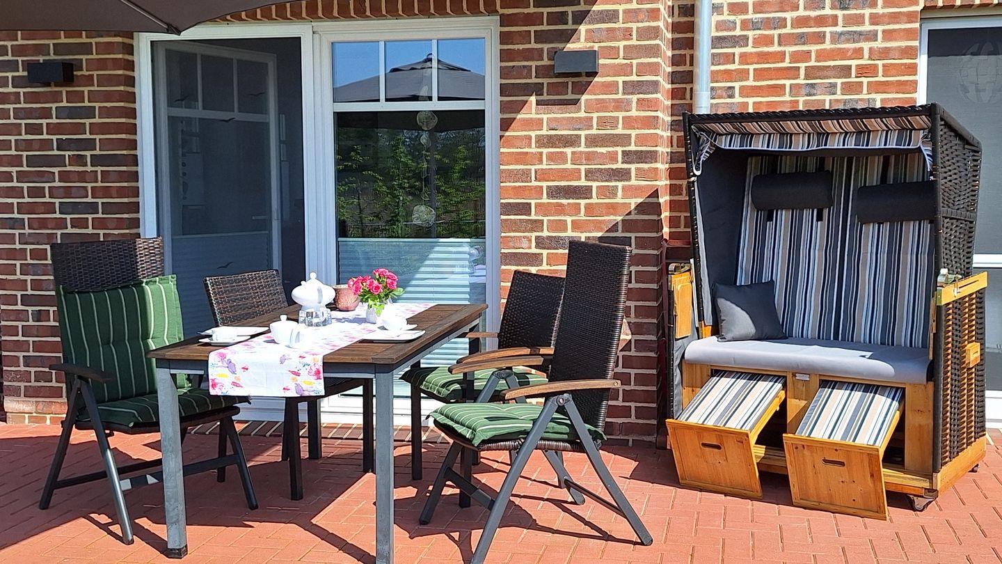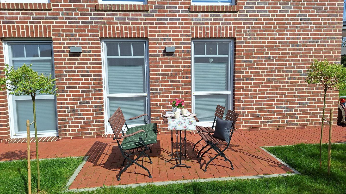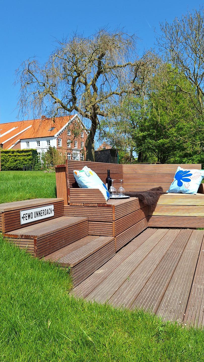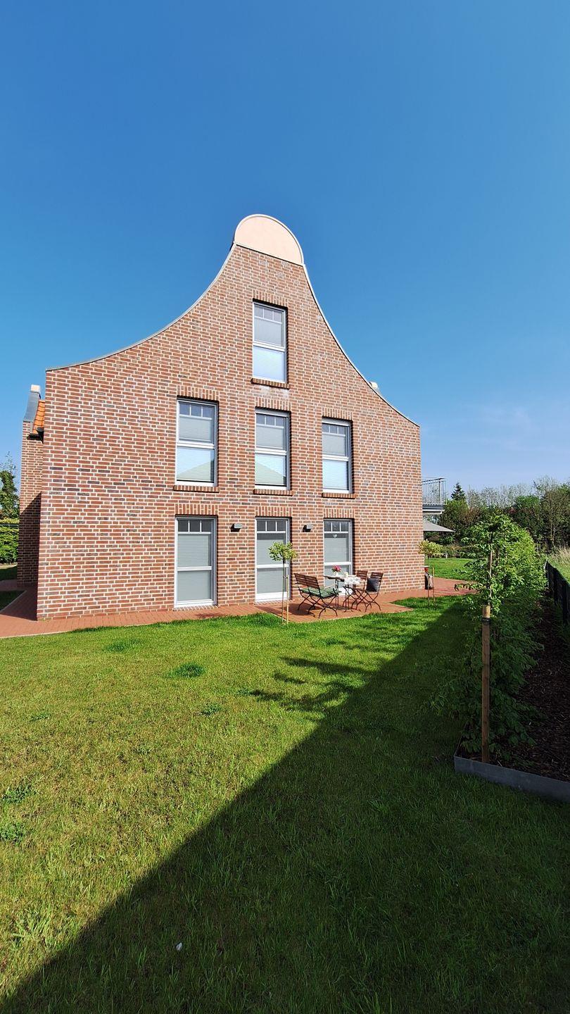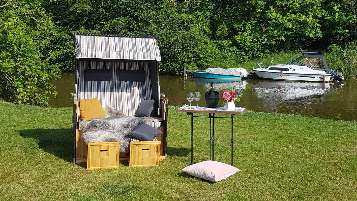 Der freie Blick auf den grünen Garten mit Grachtenzugang verspricht Urlaubsflair pur. Ostfriesisches Grachtenkino bietet dabei die direkt an den Wohnbereich angrenzende 25 m² große Terrasse, die ganztags wärmende Sonnenstrahlen verspricht. Gartenmöbel, Strandkorb und Elektrogrill sind vorhanden.