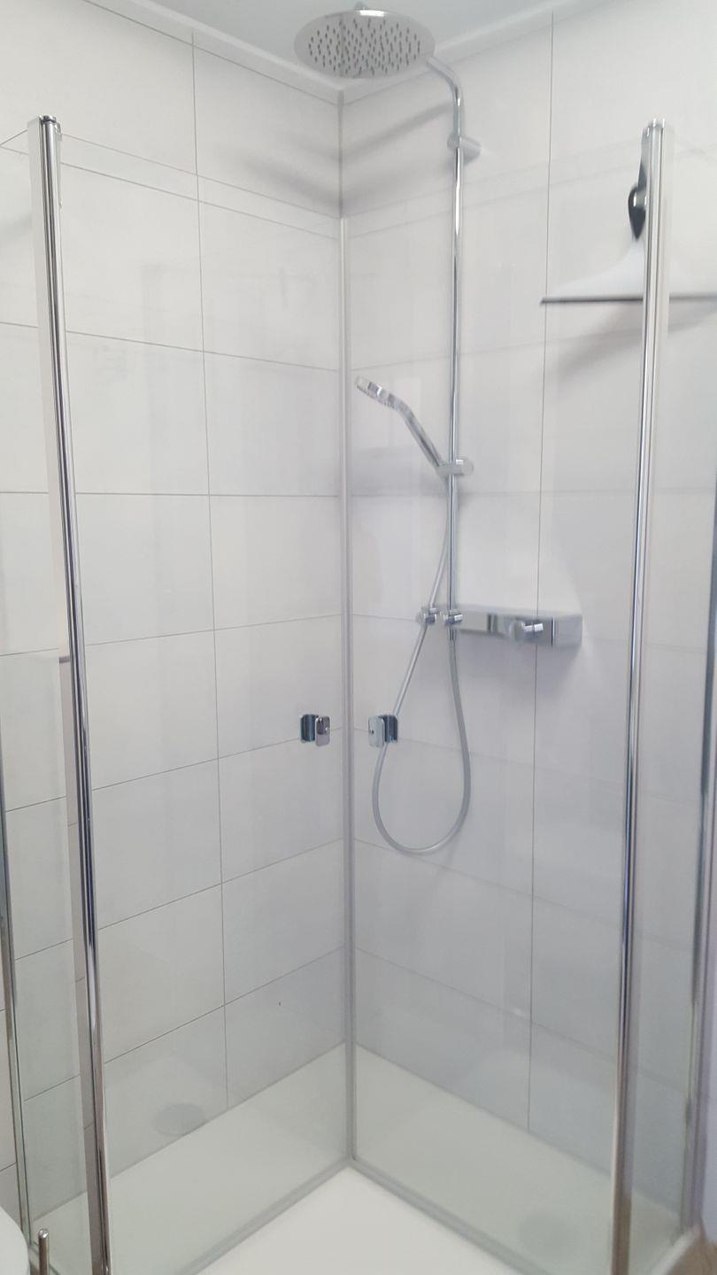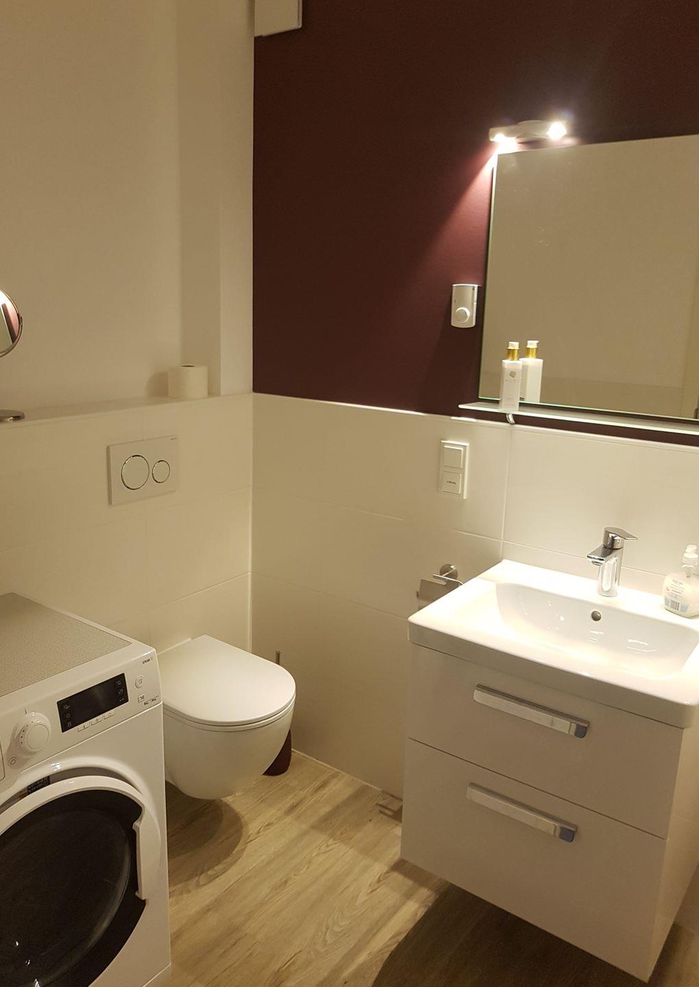 Das Badezimmer mit stimmungsvoller Ambientebeleuchtung verfügt selbstverständlich über eine Toilette und daneben über eine 1,00 m x 1,00 m große Duschtasse mit Handbrause und Über-Kopf-Regendusche für den Wohlfühleffekt. Als zusätzlicher Komfort ist die Fewo Unnerdack mit einem weiteren Gäste-WC (Toilette und Waschbecken) ausgestattet. Hier finden Sie auch einen kombinierten Waschtrockner zur freien Benutzung vor.