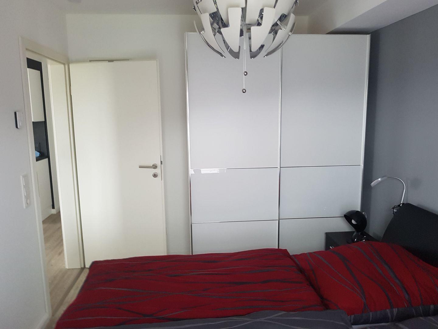 Das Hauptschlafzimmer verfügt über zwei bodentiefe Fenster, ein Doppelbett (1,80 m x 2,00 m), welches höchsten Schlafkomfort verspricht, eine Kommode und einen 1,80 m breiten Schwebetürenkleiderschrank sowie einen Flatscreen TV.