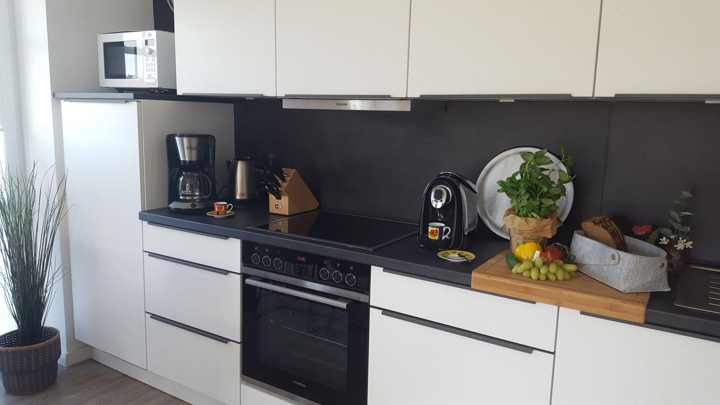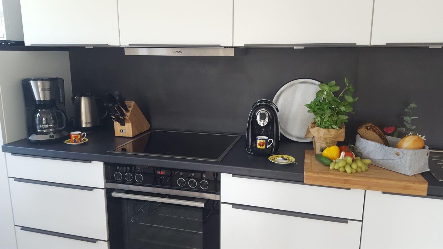Weitere Ausstattungsmerkmale der Wohnung: Kühlschrank mit Gefrierfach, Spülmaschine, Cerankochfeld, Backofen, Mikrowelle, Filter-Kaffeemaschine, Kaffeekapselmaschine, Wasserkocher, Toaster, Mixer, Pürierstab, Waschtrockner, Bügelbrett, Bügeleisen, Wäscheständer, Staubsauger, Haarföhn, Fliegengitter an allen Fenstern, Gesellschaftsspiele und Bücher sowie vieles mehr.
