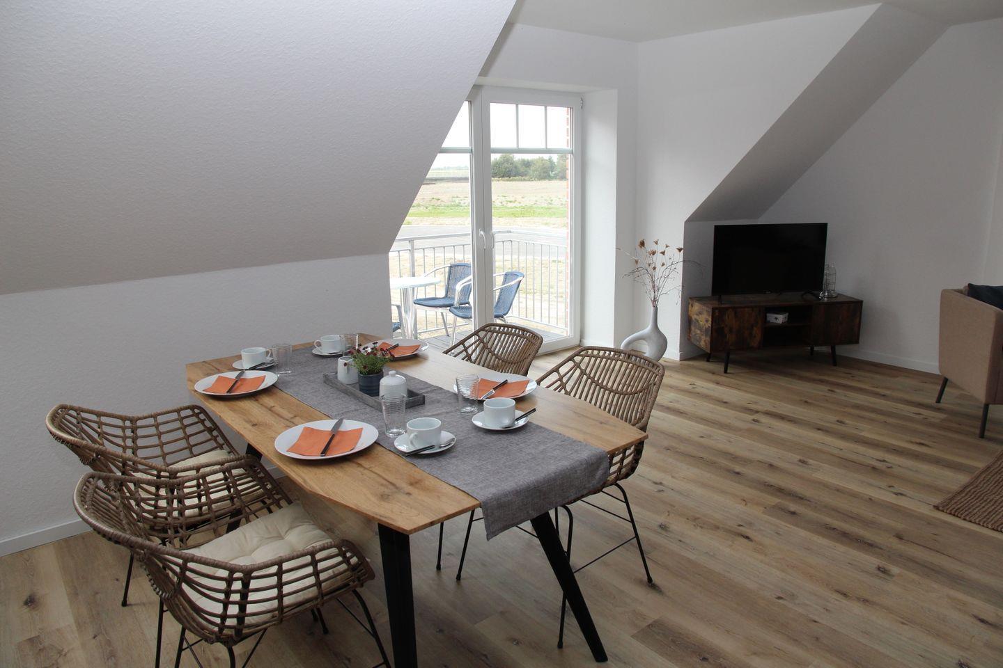Serviert wird dann auf dem Tisch mit gemütlichen Stühlen im Essbereich oder aber bei Sonnenschein auf dem möblierten Balkon mit Blick auf die Greetsieler Grachten.