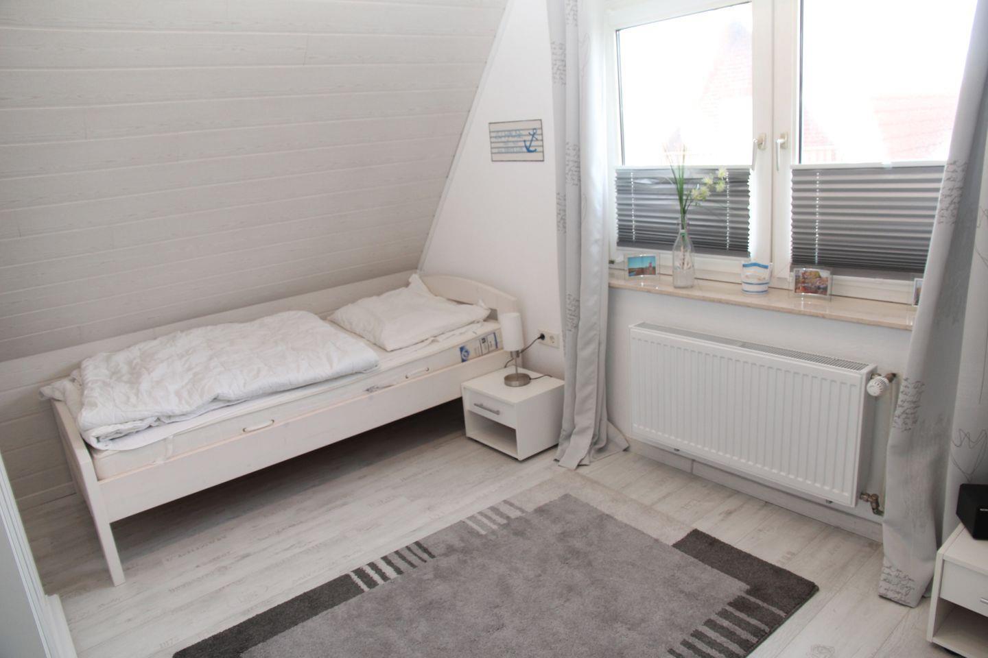 Im Obergeschoss finden Sie zwei weitere Schlafzimmer: Eines mit zwei Einzelbetten und Kleiderschrank, das andere mit einem Doppelbett und Kommode. Hier ist auch noch ein Babybett vorhanden. Ein zusätzliches Gäste-WC mit Waschbecken finden Sie ebenfalls in der oberen Etage.