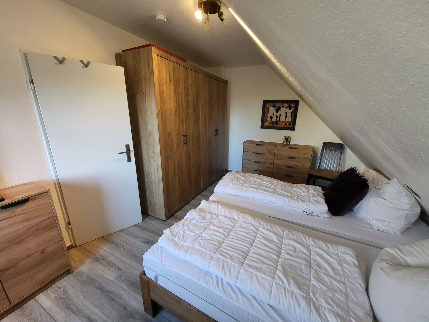 Im Obergeschoss befindet sich ein Schlafzimmer mit Doppelbett. Hier können Sie entspannte Nächte verbringen. Ein Fernseher steht dort bereit. Das zweite Zimmer mit Erker ist mit 2 Einzelbetten ausgestattet. Das Duschbad mit Waschmaschine u. Trockner liegt ebenfalls im OG. Ein dritter offener Schlafbereich mit zwei Einzelbetten befindet sich Dachgeschoß.