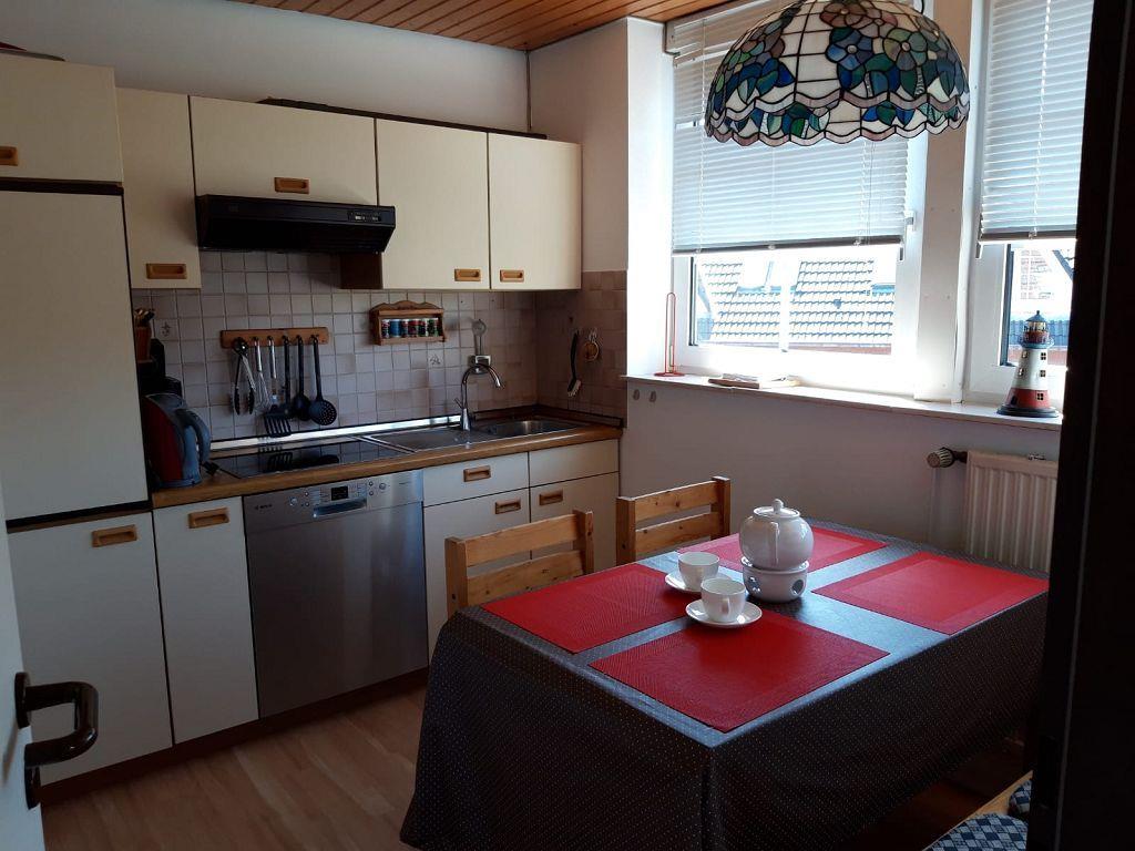 Die Ferienwohnung liegt im Obergeschoß eines Vier-Parteienhauses im ruhigen Ortsteil von Greetsiel nur wenige Gehminuten vom Zentrum entfernt. Der Wohnbereich verfügt u. a. über eine Couchgarnitur, einen Relaxsessel und Flachbild TV und lädt zu gemütlichen Abenden ein. Von hier gelangen Sie auf den Balkon, wo Sie die Ruhe genießen können. Neben dem Wohnzimmer befindet sich die helle Küche mit einem Esstisch und einer gemütlichen Bank. Die Küchenzeile bietet ein Cerankochfeld, Backofen, Geschirrspüler, Kaffeemaschine, Wasserkocher etc. Neben der Küche gibt es noch einen kleinen Abstellraum mit Waschmaschine, Staubsauger usw. Vom Flur aus geht es ins geräumige Badezimmer mit Dusche und WC. Ein Fön ist vorhanden! Nebenan befindet sich das Schlafzimmer mit Doppelbett und großem Kleiderschrank. Vom Wohnbereich führt eine Raumspartreppe in das Dachgeschoß, wo sich noch 2 Einzelbetten befinden. Die Betten sind durch eine Holzwand abgetrennt. Alle Fenster (bis auf das Dachgeschoß) sind mit Außenrollos ausgestattet. Ein Parkplatz befindet sich vor dem Haus.