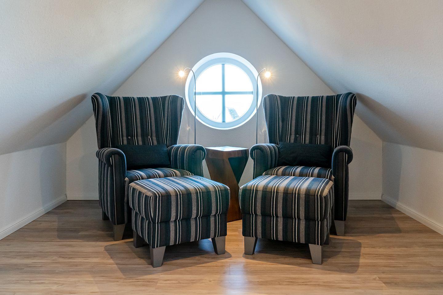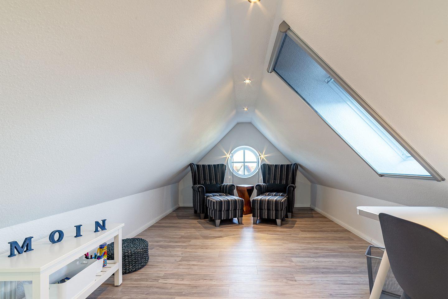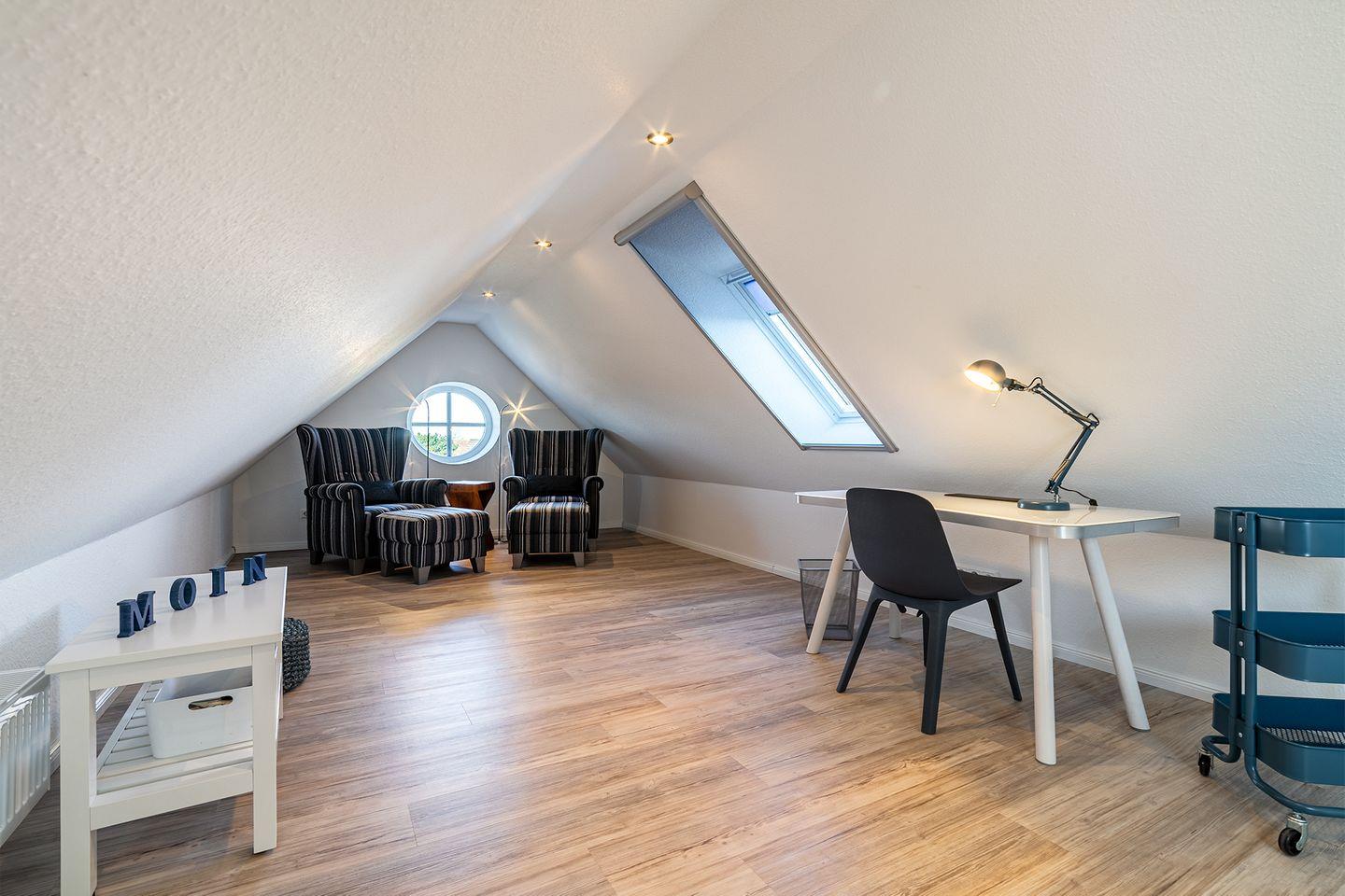 Ein ausgebautes Dachgeschoss dient als zusätzlicher Rückzugsort. Hier können Sie sich zurücklehnen und entspannen oder bei Bedarf arbeiten.