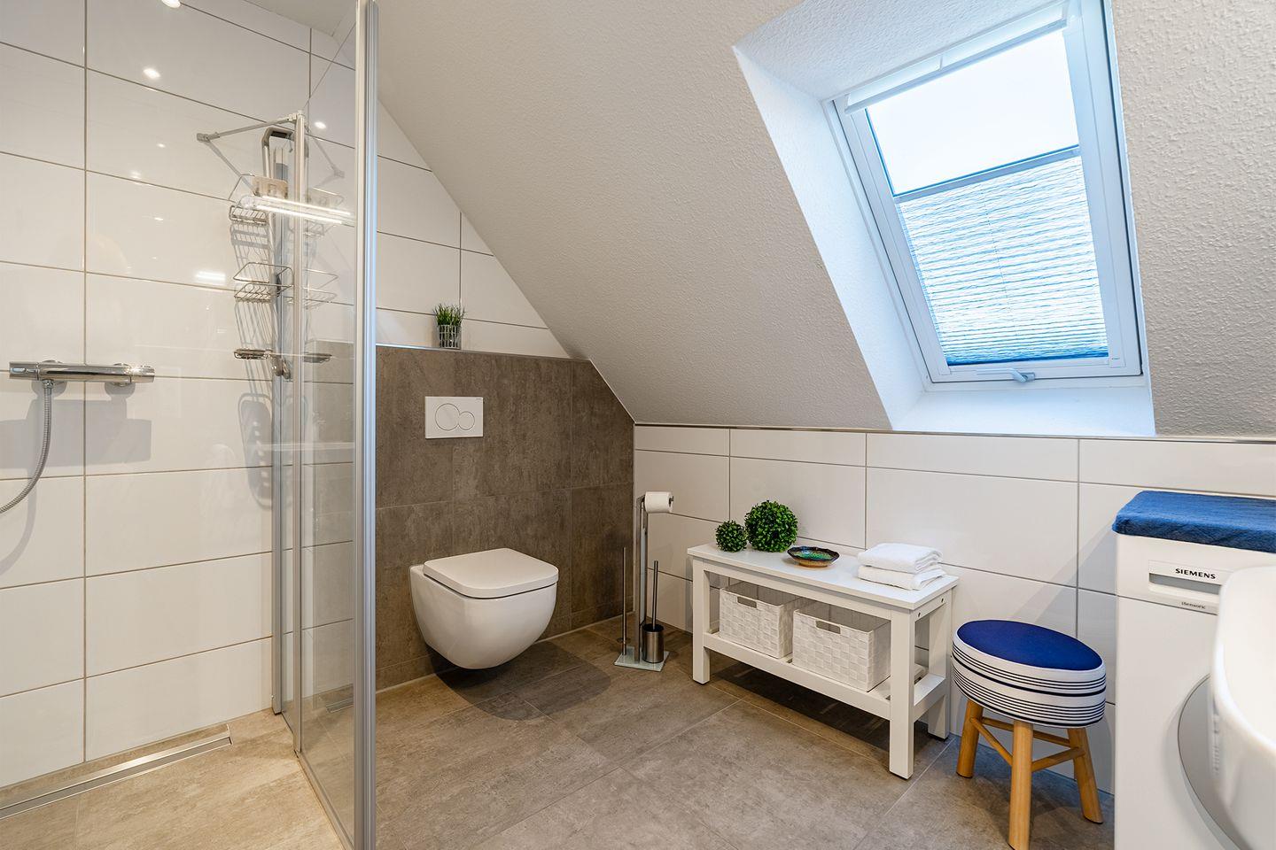 Das Bad ist mit einer Dusche und einer Waschmaschine ausgestattet – ideal für längere Aufenthalte. Zudem gibt es ein zusätzliches Gäste-WC für noch mehr Komfort.