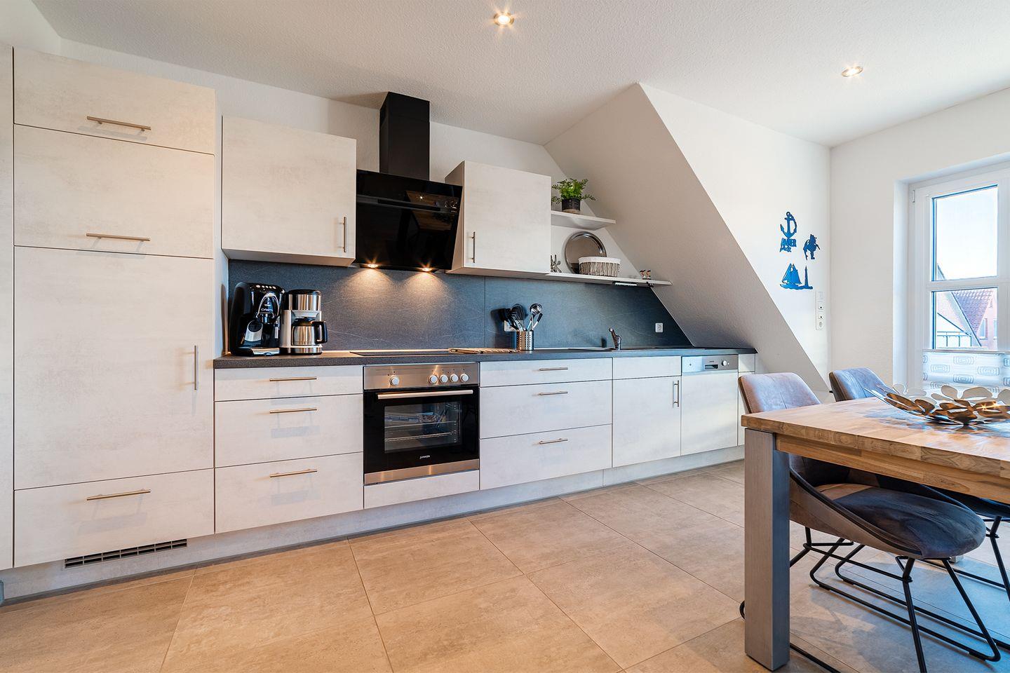 Der Wohnbereich ist einladend und großzügig gestaltet und bietet ausreichend Platz, um sich zu entspannen. Die voll ausgestattete Küche lädt zum gemeinsamen Kochen und Genießen ein.