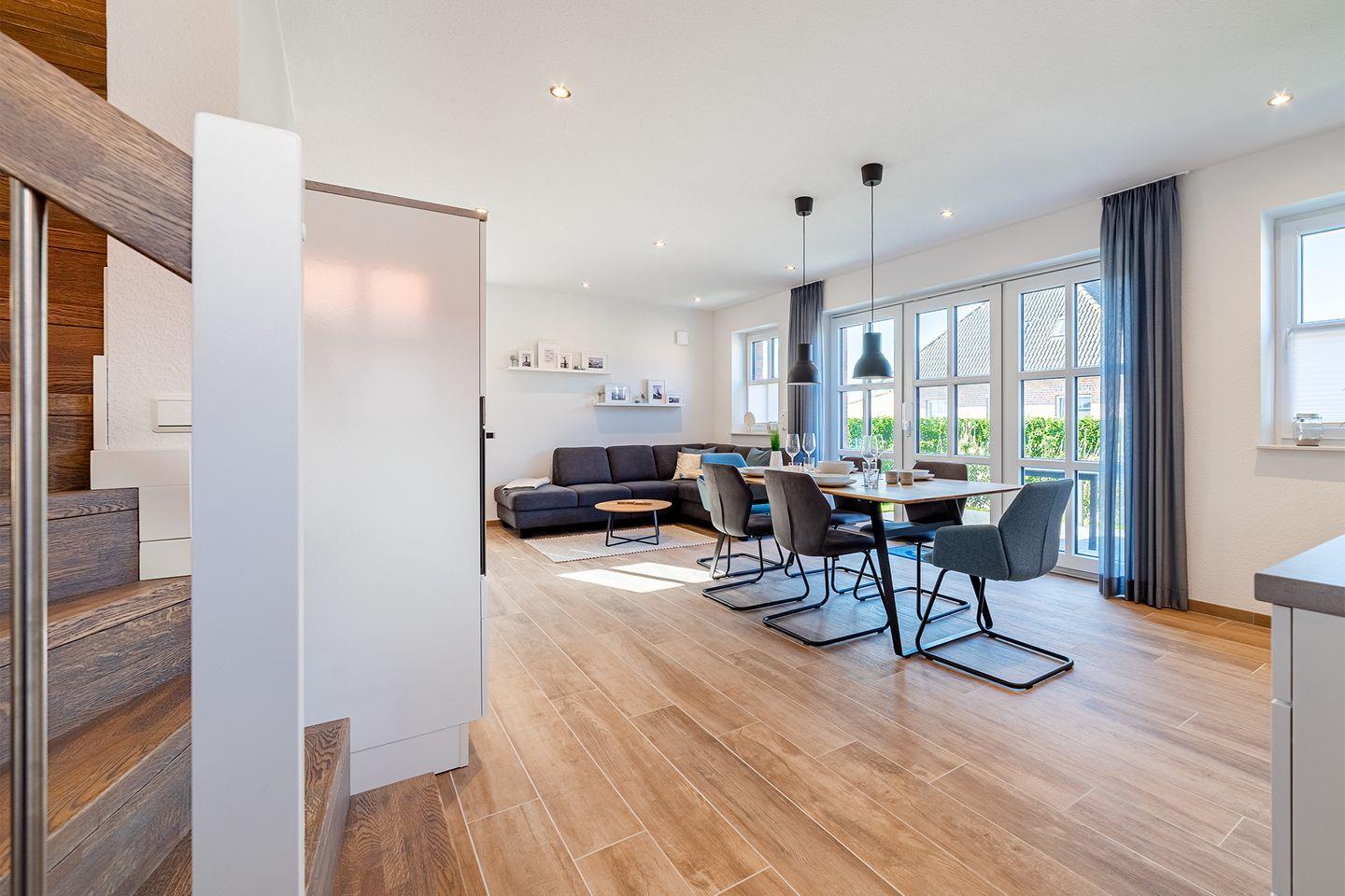 Ein großer Wohn- und Essbereich mit einer umfangreich ausgestatteten Küche bildet den Mittelpunkt des Hauses.