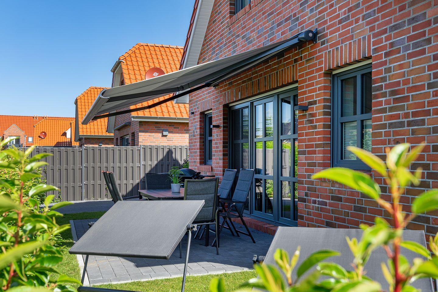Ein schöner Gartenbereich mit einer Terrasse (südwestlich) und elektrischer Markise